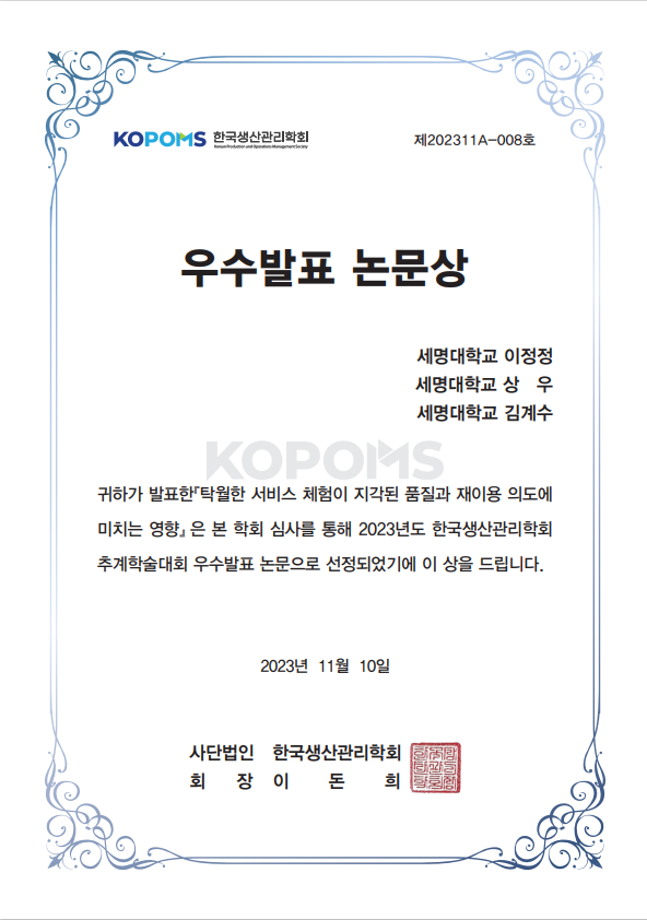 2) 이정정, 상우, 김계수(2023, 11, 10), 탁월한 서비스 체험이 지각된 품질과 재이용 의도에 미치는 영향, 한국생산관리학회 추계학술대회.