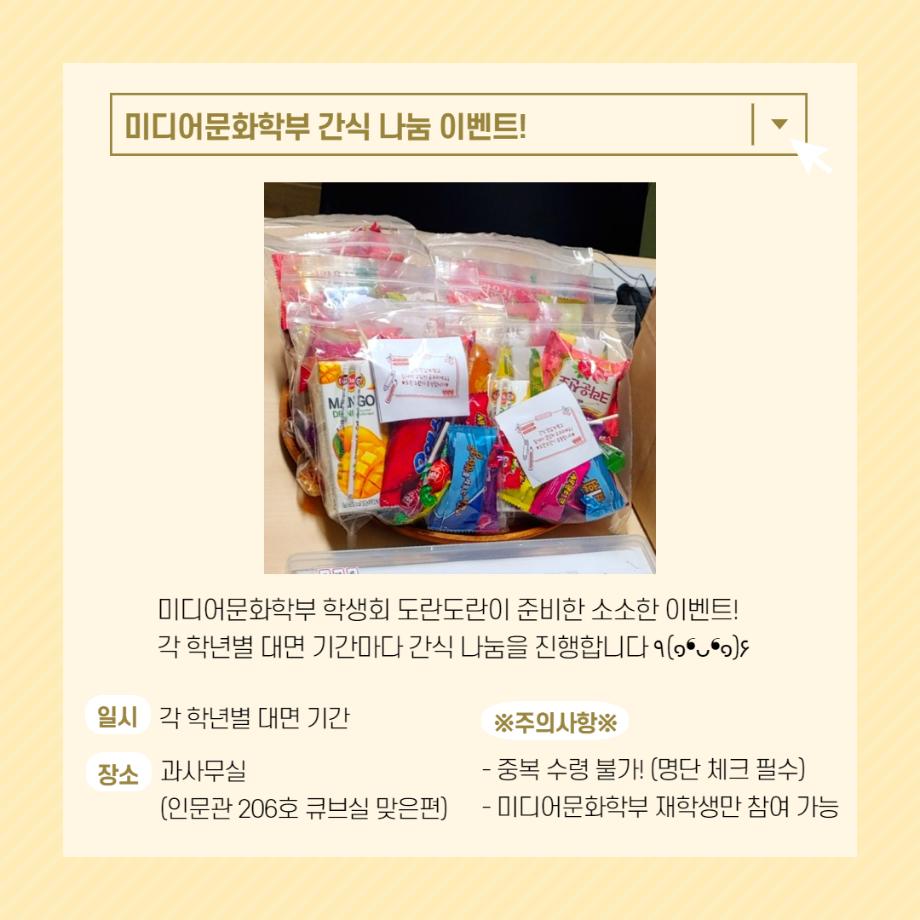 본문 시작 홈으로 커뮤니티 학부소개 교육과정 학부소식 커뮤니티 홈페이지가이드 학생회 학생회 동아리 자료실 장비대여 자유게시판 학생회 페이스북 트위터 프린트 [학생회 활동] 2021학년도 1학기 간식나눔 행사 학생회 2934 2021-06-17 각 학년 대면기간을 맞이하여 격려와 응원의 의미로 간식을 나누어 주는 행사를 진행했습니다. 목록 이전[학생회 활동] 2021학년도 1학기 신입생 환영회 행사 다음 [학생회 활동] 제 29대 학생회 단체 사진-1학기 담당부서 : 미디어문화학부 담당자 : - 연락처 : 043-649-1760 최종수정일 : 2024-10-26 만족도조사 만족도 조사 이 페이지에서 제공하는 정보에 대하여 만족하시나요? 매우만족 만족 보통 불만족 매우불만족