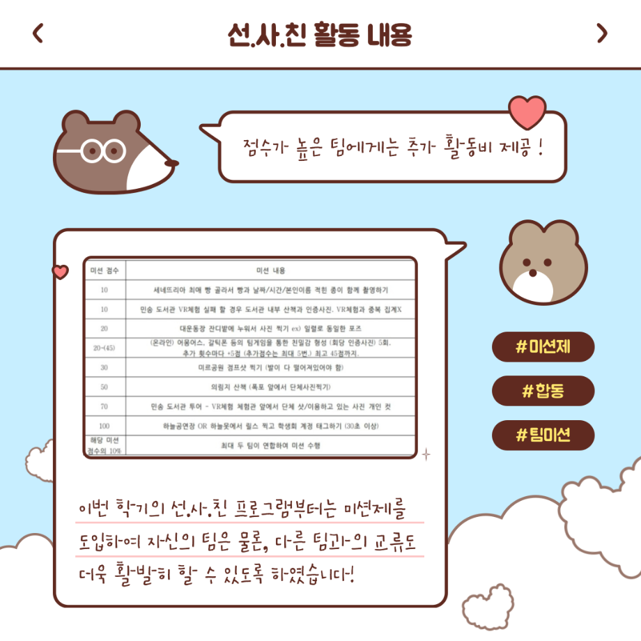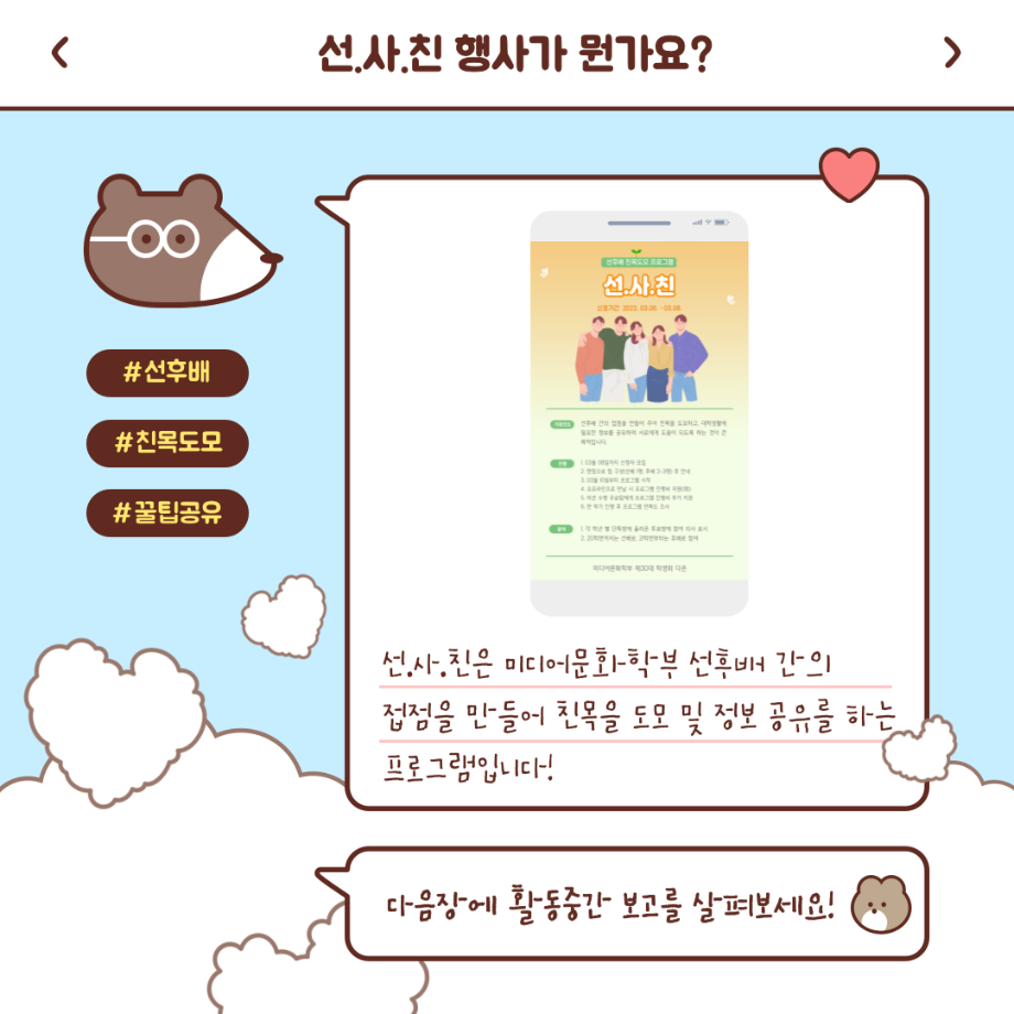 본문 시작 홈으로 커뮤니티 학부소개 교육과정 학부소식 커뮤니티 홈페이지가이드 학생회 학생회 동아리 자료실 장비대여 자유게시판 학생회 페이스북 트위터 프린트 [학생회 활동] 2022년 1학기 선.사.친 활동 중간보고 학생회 3259 2022-04-30 이번 학기 선.사.친 활동부터는 미션제를 도입하여 더욱 활발하게 활동할 수 있도록 하였습니다! 자세한 활동 사진은 학부 인스타그램에서 확인 부탁드립니다 :) 목록 이전[학생회 활동] 미문상담소 다음 [학생회 활동] 지구방위대 챌린지 촬영 보고 담당부서 : 미디어문화학부 담당자 : - 연락처 : 043-649-1760 최종수정일 : 2024-10-26 만족도조사 만족도 조사 이 페이지에서 제공하는 정보에 대하여 만족하시나요? 매우만족 만족 보통 불만족 매우불만족
