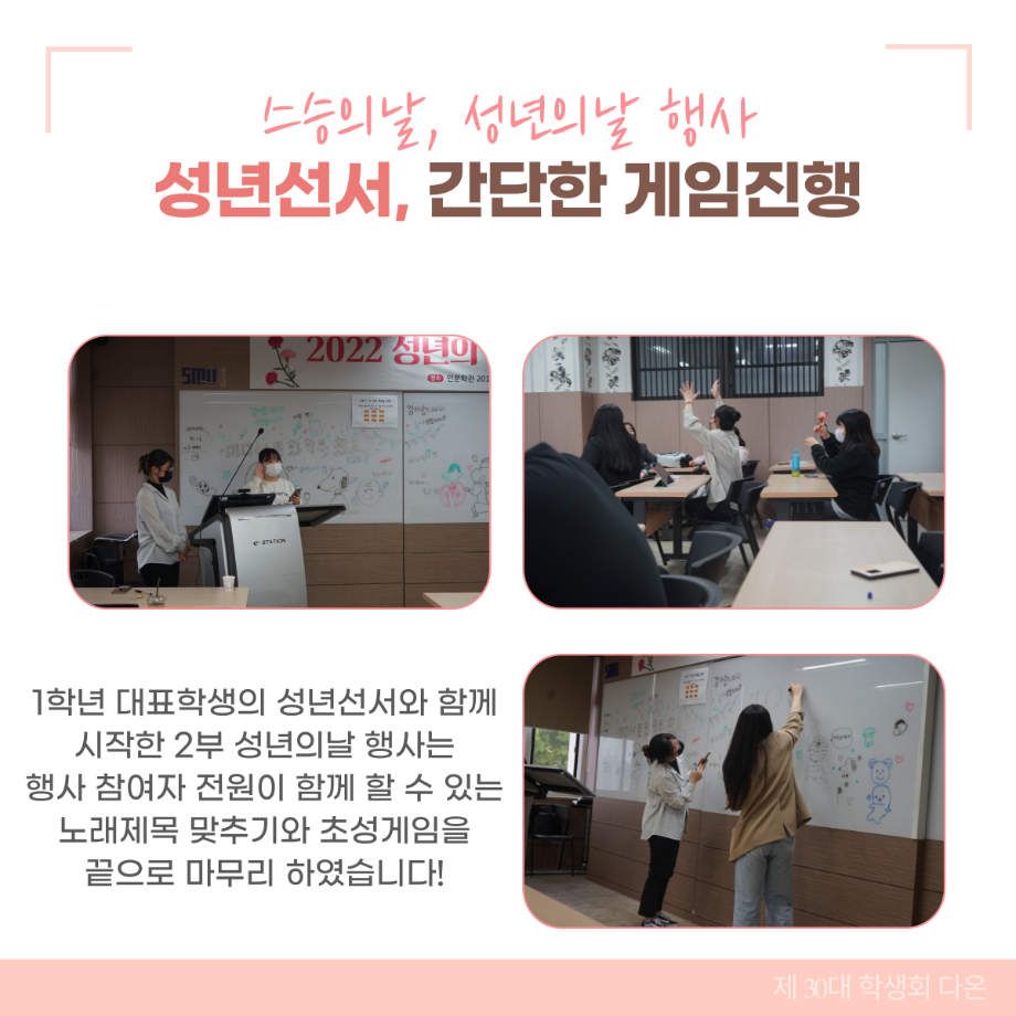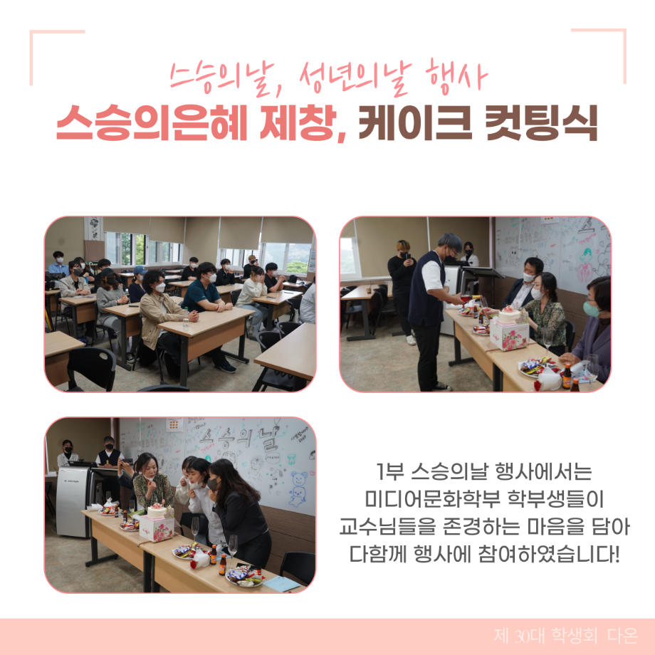 본문 시작 홈으로 커뮤니티 학부소개 교육과정 학부소식 커뮤니티 홈페이지가이드 학생회 학생회 동아리 자료실 장비대여 자유게시판 학생회 페이스북 트위터 프린트 [학생회 활동] 스승의날, 성년의날 행사 되돌아보기 학생회 3293 2022-05-20 지난 5월13일에 미디어문화학부 스승의날과 성년의날 행사가 있었습니다! 행사 진행과정을 한번 살펴볼까요? 1부 스승의날 행사에서는 미디어문화학부 학부생들이 교수님들을 존경하는 마음을 담아 다함께 행사에 참여하였습니다! 1학년 대표학생의 성년선서와 함께 시작한 2부 성년의날 행사는 행사 참여자 전원이 함께 할 수 있는노래제목 맞추기와 초성게임을 끝으로 마무리 하였습니다! 목록 이전미디어문화학부 전공 체험 - 제천제일고 다음 🏆미디어문화학부 학생회, 2022 E-sports 대회 : 인문예술리그 개최🏆 담당부서 : 미디어문화학부 담당자 : - 연락처 : 043-649-1760 최종수정일 : 2024-10-26 만족도조사 만족도 조사 이 페이지에서 제공하는 정보에 대하여 만족하시나요? 매우만족 만족 보통 불만족 매우불만족