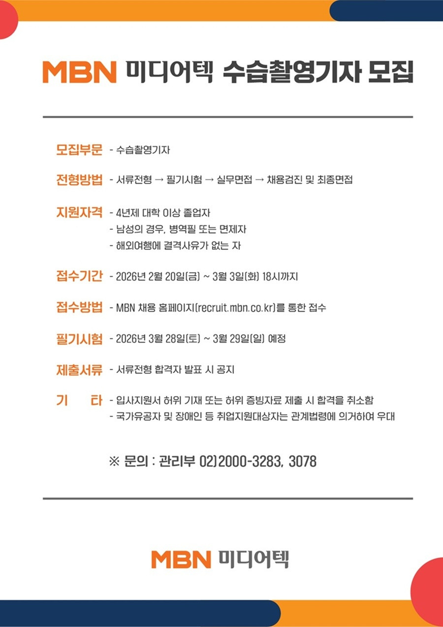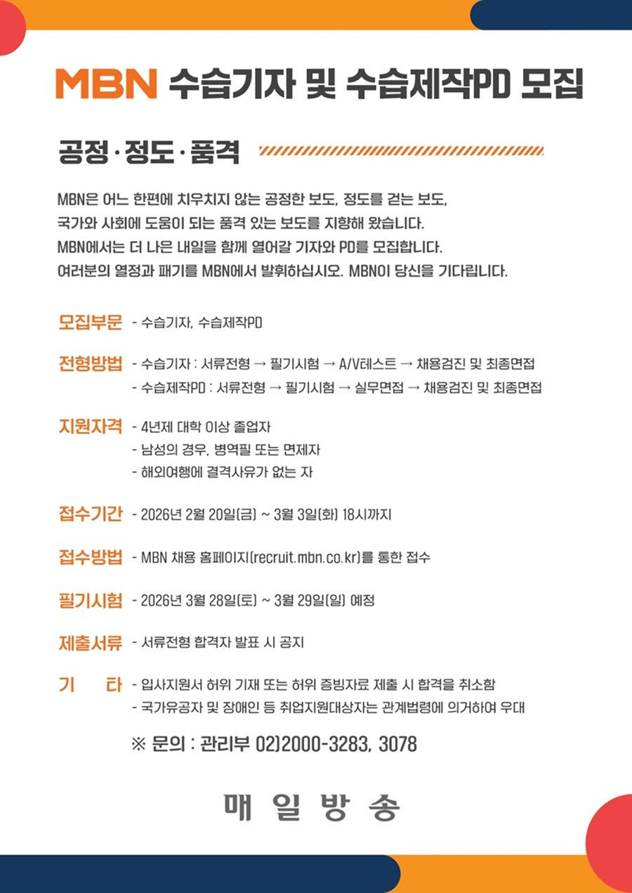 본문 시작 게시판 대학원소개 교수/학생소개 교과과정 입학/학사안내 공지사항 게시판 저널리즘연구소 홈페이지가이드 언론사 채용공고 단비뉴스 편집실 단비서재 세저리 이야기 언론사 채용공고 언론계 동향 언시 후기 사진첩 언론 현장에서 언론사 채용공고 페이스북 트위터 프린트 (~3/3) 2026 MBN 수습기자·제작PD·촬영기자 모집 저널리즘대학원 조회 : 404 등록일 : 2026-02-23 채용공고 바로가기 목록 이전(~3/6) 동아일보 매거진 채용연계형 인턴기자 모집 다음 (~3/15) 2026 CBS 신입·경력사원 공개채용