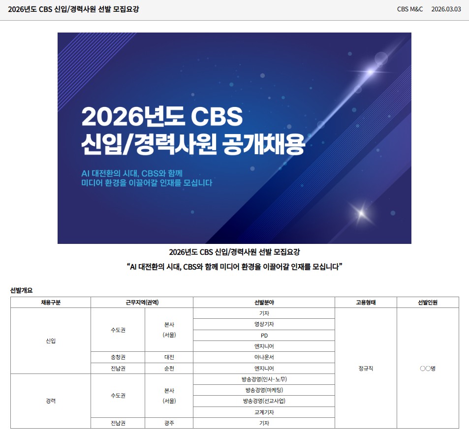 본문 시작 게시판 대학원소개 교수/학생소개 교과과정 입학/학사안내 공지사항 게시판 저널리즘연구소 홈페이지가이드 언론사 채용공고 단비뉴스 편집실 단비서재 세저리 이야기 언론사 채용공고 언론계 동향 언시 후기 사진첩 언론 현장에서 언론사 채용공고 페이스북 트위터 프린트 (~3/15) 2026 CBS 신입·경력사원 공개채용 저널리즘대학원 조회 : 396 등록일 : 2026-03-03 채용공고 바로가기 목록 이전(~3/3) 2026 MBN 수습기자·제작PD·촬영기자 모집 다음 (~3/31) 2026 한국경제신문 수습기자 공개채용