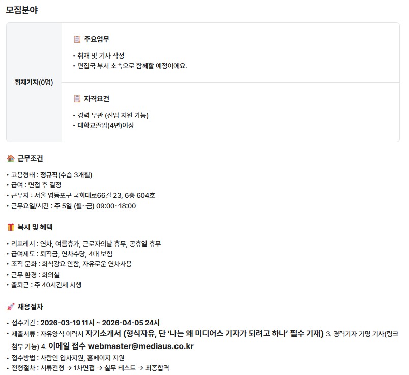 본문 시작 게시판 대학원소개 교수/학생소개 교과과정 입학/학사안내 공지사항 게시판 저널리즘연구소 홈페이지가이드 언론사 채용공고 단비뉴스 편집실 단비서재 세저리 이야기 언론사 채용공고 언론계 동향 언시 후기 사진첩 언론 현장에서 언론사 채용공고 페이스북 트위터 프린트 (~4/5) 미디어스 취재기자 모집 저널리즘대학원 조회 : 259 등록일 : 2026-03-24 채용공고 바로가기 목록 이전(~4/3) TBC PD 공개모집 다음 (~4/2) 연합뉴스TV 신입사원 모집