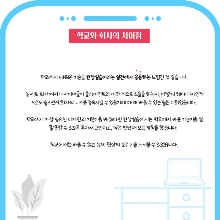 본문 시작 홈으로 학과자랑 학과소개 학과과정 시영소식 입학/취업 AI 학과자랑 SNS소통 홈페이지가이드 갤러리 학과자랑 갤러리 공모전 동아리 졸업전시회 갤러리 페이스북 트위터 프린트 2022년 여름방학 현장실습 알아보기! 2탄 시각영상디자인학과 4746 2022-08-03 2022년 여름방학 현장실습 알아보기! 2탄 유튜브 링크 https://www.youtube.com/watch?v=4CEG3-eYjWE&t=25s [출처] 2022년 여름방학 현장실습 알아보기! 2탄|작성자 세명대학교시각영상 목록 이전세명대학교 시각영상디자인 학생들의 현장실습 1탄 다음 세명대학교만의 특별한 휴식공간 담당부서 : 시각영상디자인학과 담당자 : - 연락처 : 043-649-1726 최종수정일 : 2024-10-26 만족도조사 만족도 조사 이 페이지에서 제공하는 정보에 대하여 만족하시나요? 매우만족 만족 보통 불만족 매우불만족