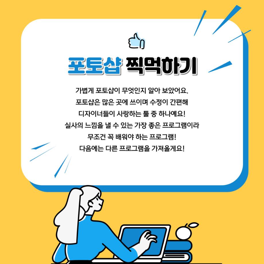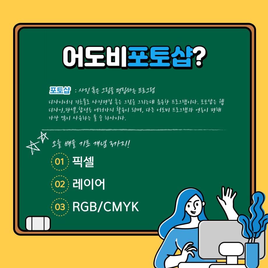 본문 시작 홈으로 학과자랑 학과소개 학과과정 시영소식 입학/취업 AI 학과자랑 SNS소통 홈페이지가이드 갤러리 학과자랑 갤러리 공모전 동아리 졸업전시회 갤러리 페이스북 트위터 프린트 예비 대학생을 위한 디자인 프로그램 설명 2탄 (포토샵) 시각영상디자인학과 2330 2022-02-07 1학년때 배우는 디자인 툴 포토샵입니다. 목록 이전예비 대학생을 위한 디자인 프로그램 설명 1탄 (일러스트레이터) 다음 예비 대학생을 위한 디자인 프로그램 설명 3탄 (애프터이펙트) 담당부서 : 시각영상디자인학과 담당자 : - 연락처 : 043-649-1726 최종수정일 : 2024-10-26 만족도조사 만족도 조사 이 페이지에서 제공하는 정보에 대하여 만족하시나요? 매우만족 만족 보통 불만족 매우불만족