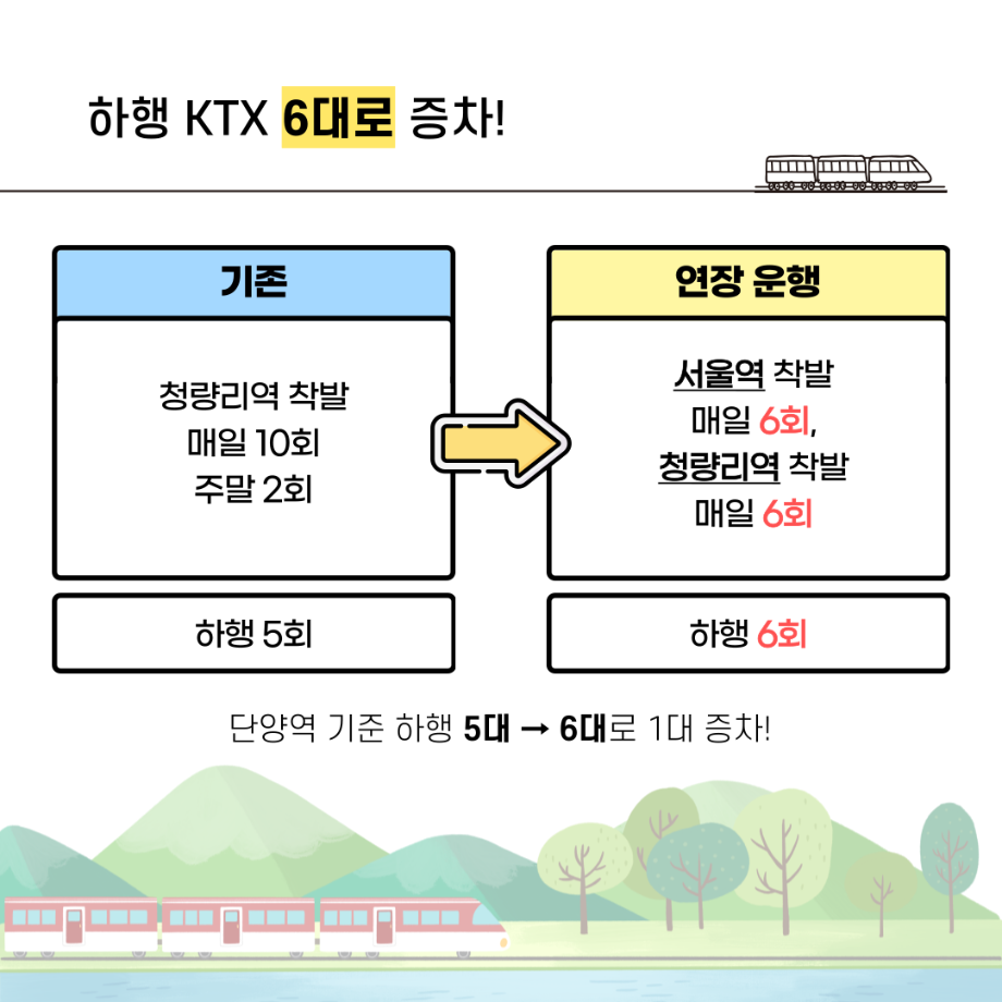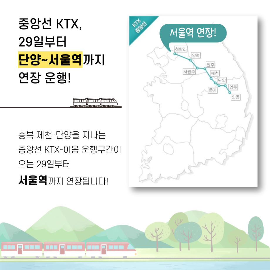 본문 시작 홈으로 학과자랑 학과소개 학과과정 시영소식 입학/취업 AI 학과자랑 SNS소통 홈페이지가이드 갤러리 학과자랑 갤러리 공모전 동아리 졸업전시회 갤러리 페이스북 트위터 프린트 KTX중앙선 연장 안내 시각영상디자인학과 2205 2023-12-28 12/29 부터 제천, 단양을 지나는 중앙선 KTX가 서울역까지 연장됩니다! 열차 또한 증차되고, 단양↔서울간 소요 시간도 단축되면서 세명대↔서울간 소요 시간도 단축됩니다 편리한 통학과 함께 더욱 가까워진, 재미있는 경험 가득한 세명대학교로 오세요! 목록 이전제32회 대전디자인어워드 특별상 다음 2023년 시각영상디자인학과 공모전 수상 실적 담당부서 : 시각영상디자인학과 담당자 : - 연락처 : 043-649-1726 최종수정일 : 2024-10-26 만족도조사 만족도 조사 이 페이지에서 제공하는 정보에 대하여 만족하시나요? 매우만족 만족 보통 불만족 매우불만족