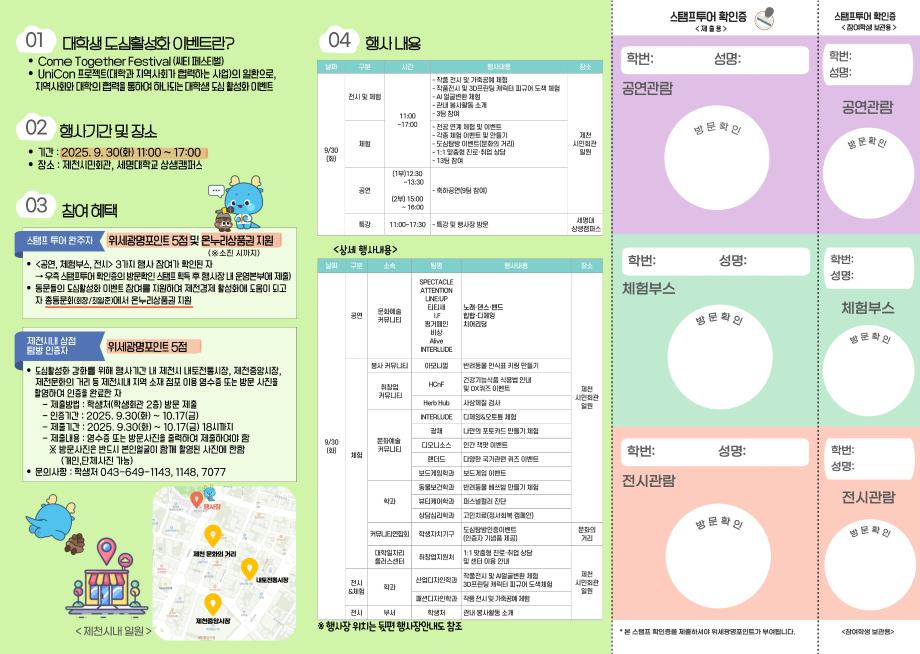 본문 시작 홈으로 학과생활 학과소개 교수소개 교과과정 학과생활 홈페이지가이드 사진게시판 공지사항 사진게시판 전공자료실 동아리 학과행사 사진게시판 페이스북 트위터 프린트 [학생처] 2025 대학생 도심활성화 이벤트[Come Together Festival(씨티페스티벌)] 개최 산업디자인학과 558 2025-09-24 학생처 목록 이전[기념품] 아트앤산업디자인학과 기념품 제작_에코백 다음 [세명대] 청룡체전 체험부스_산디과 동아리 활동 담당부서 : 산업디자인학과 담당자 : - 연락처 : 043-649-1436 최종수정일 : 2024-10-26 만족도조사 만족도 조사 이 페이지에서 제공하는 정보에 대하여 만족하시나요? 매우만족 만족 보통 불만족 매우불만족