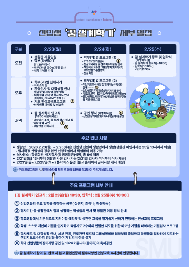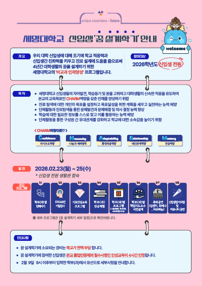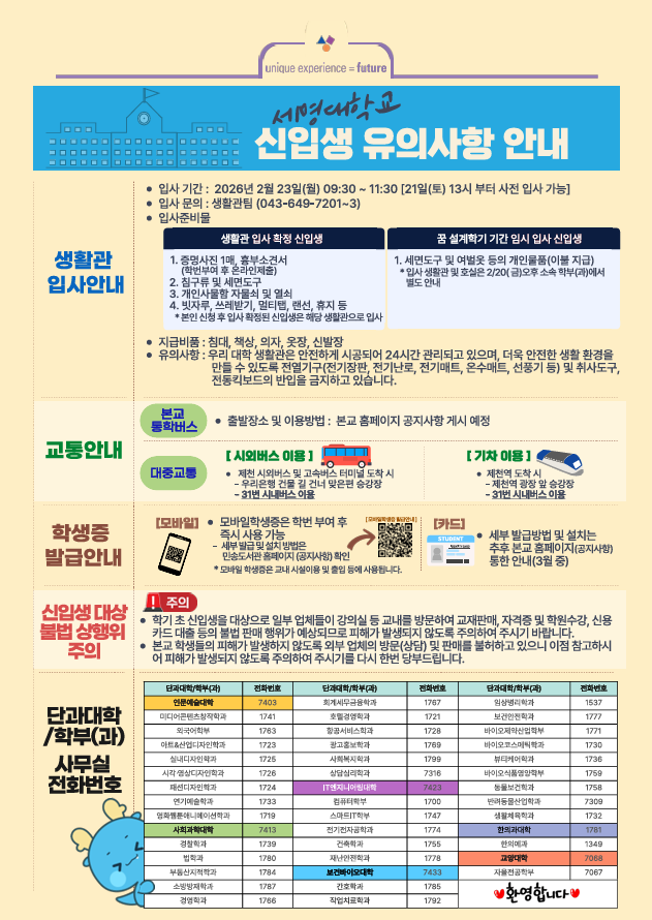 본문 시작 홈으로 학과생활 학과소개 교수소개 교과과정 학과생활 홈페이지가이드 사진게시판 공지사항 사진게시판 전공자료실 동아리 학과행사 사진게시판 페이스북 트위터 프린트 [학생처] 2026학년도 신입생 '꿈 설계학기(오리엔테이션)' 시행 산업디자인학과 432 2026-02-04 목록 이전다이소 세명대점 오픈(2/19) 안내 다음 [학생처] 2026학년도 신입생 '꿈 설계학기' 기간 중 통학버스 운행 안내 담당부서 : 산업디자인학과 담당자 : - 연락처 : 043-649-1436 최종수정일 : 2024-10-26 만족도조사 만족도 조사 이 페이지에서 제공하는 정보에 대하여 만족하시나요? 매우만족 만족 보통 불만족 매우불만족