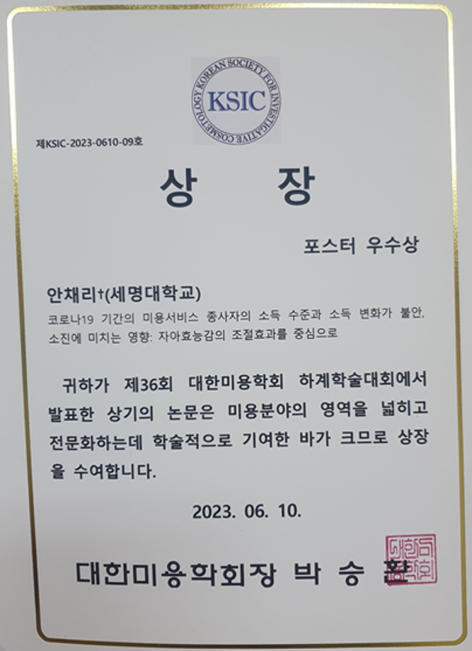 본문 시작 홈으로 커뮤니티 학과소개 교수소개 학과과정 커뮤니티 대학원 홈페이지가이드 포토갤러리 공지사항 채용정보 포토갤러리 Youtube 바로가기 Instargram 바로가기 Blog 바로가기 Facebook 바로가기 포토갤러리 페이스북 트위터 프린트 세명대 뷰티케어학과 안채리 교수, 제36회 대한미용학회 하계학술대회 포스터 우수상 수상 뷰티케어학 3013 2023-07-04 지난 6월 10일, 한국열린사이버대학교에서 대한미용학회(회장 박승환)가 주관하는 하계학술대회 및 전시회가 있었습니다. 이에 우리 학과 안채리 교수님이 '코로나19 기간의 미용서비스 종사자의 소득 수준과 소득 변화가 불안, 소진에 미치는 영향: 자아효능감의 조절효과를 중심으로'라는 제목으로 포스터를 발표하시어, 포스터 우수상을 수상하셨습니다😃👍 목록 이전♦피부 실습실 소개♦ 다음 세명고등학교 입시박람회