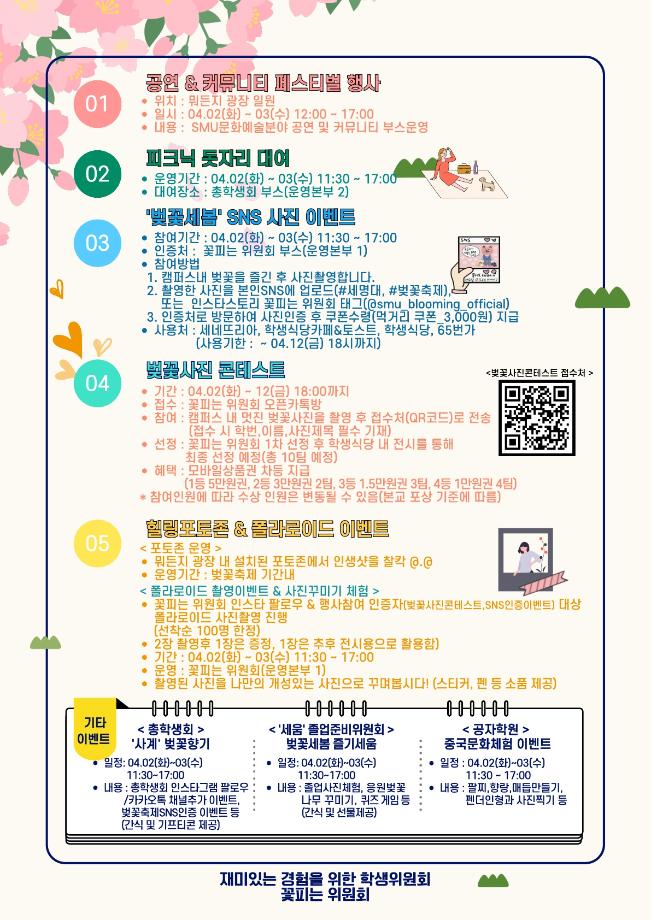 본문 시작 홈으로 커뮤니티 학과소개 교수소개 학과과정 커뮤니티 대학원 홈페이지가이드 포토갤러리 공지사항 채용정보 포토갤러리 Youtube 바로가기 Instargram 바로가기 Blog 바로가기 Facebook 바로가기 포토갤러리 페이스북 트위터 프린트 벚꽃세봄✨ 뷰티케어학 2021 2024-04-01 4월 2~3일, 봄을 맞아 새로운 행사가 열립니다! 여러 부스 활동들과 먹거리, 공연등이 펼쳐지니 많은 관심과 참여 부탁드립니다🩷 전시,부스 종류와 공연시간등을 잘 참고하셔서 즐기시길 바래요✨ 전시-10:00~17:00 부스-11:30~17:00 공연-14:00~16:00 📍뭐든지 광장 (위치는 지도 참고) 목록 이전커뮤니티 페스티벌✨ 다음 세명진로 festival 도전 특강: ‘레드오션에서 브랜드로 성공하는 마케팅’