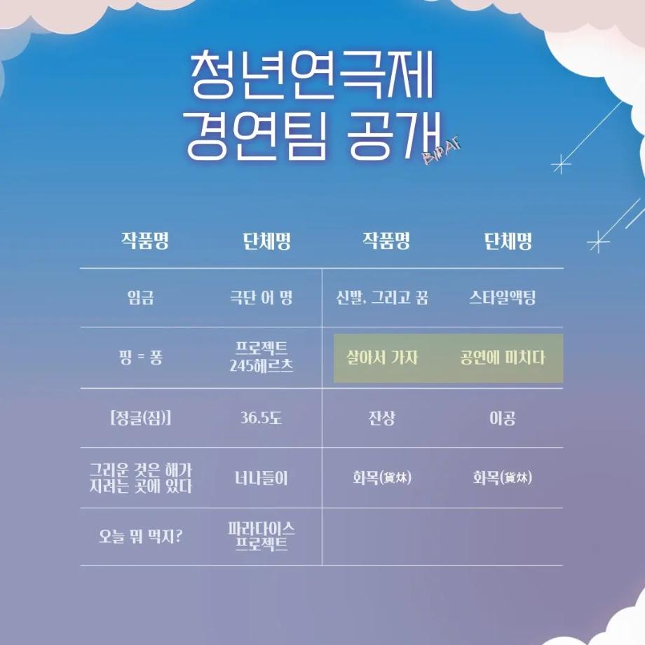 본문 시작 홈으로 커뮤니티 학과소개 입학정보 교수소개 학과과정 커뮤니티 공연예매 안내 홈페이지가이드 포토갤러리 공지사항 포토갤러리 작품DB 동아리 학사일정 학생회 포토갤러리 페이스북 트위터 프린트 🌊2022 제 19회 부산국제연극제 청년연극제 참가작 본선 진출 🫂[살아서 가자]👣 연기예술학과 2953 2022-06-13 🌊2022 제 19회 부산국제연극제 청년연극제 참가작 본선 진출 🫂[살아서 가자]👣 🌺[살아서 가자]는 6.25전쟁을 배경으로하여, 원치않는 전쟁에 참가한 남한과 북한의 어린 청춘들이 소통의 부재로 비극적인 전투를 하게 되는 내용을 다룬 창작극입니다. 👥 이번 청년연극제 참가작인 [살아서 가자]는 신입생들과 2학년 학생들이 액션신과 군무 등 함께 호흡을 맞춰 즐겁게 연습했던 작품입니다!! 목록 이전🗣제 81회 세명대학교 연기예술학과 정기공연 기초연기1 발표🗣 다음 제 82회 세명대학교 연기예술학과 정기공연 중급연기 | 발표 <팔레트>🎨 담당부서 : 연기예술학과 담당자 : - 연락처 : 043-649-1733 최종수정일 : 2024-10-26 만족도조사 만족도 조사 이 페이지에서 제공하는 정보에 대하여 만족하시나요? 매우만족 만족 보통 불만족 매우불만족