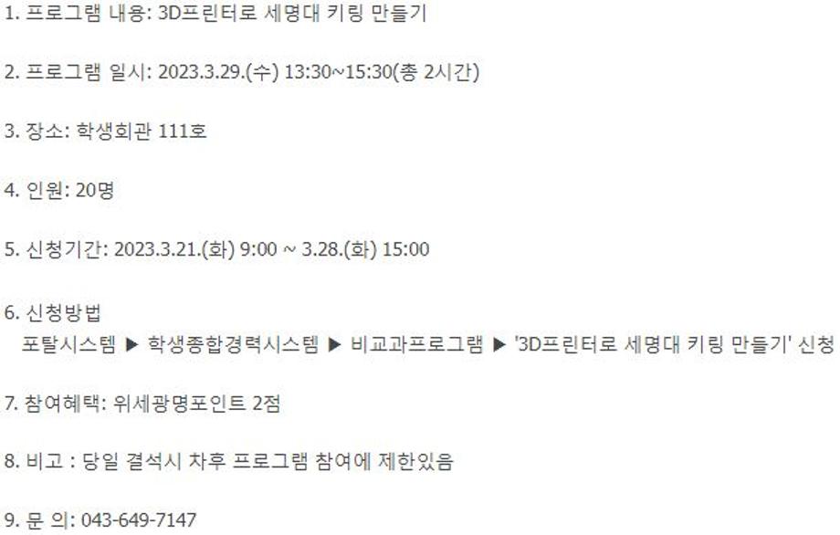 본문 시작 홈으로 커뮤니티 학과소개 입학정보 교수소개 학과과정 커뮤니티 공연예매 안내 홈페이지가이드 포토갤러리 공지사항 포토갤러리 작품DB 동아리 학사일정 학생회 포토갤러리 페이스북 트위터 프린트 3D 프린터로 세명대 키링 만들기 연기예술학과 2679 2023-03-20 3D 프린터로 세명대 키링 만들기 목록 이전2023학년도 1학기 FUN러닝프렌즈 다음 극단 각인각색 인큐베이팅 공연 - 3/4 (사분의 삼) 공연 성료 담당부서 : 연기예술학과 담당자 : - 연락처 : 043-649-1733 최종수정일 : 2024-10-26 만족도조사 만족도 조사 이 페이지에서 제공하는 정보에 대하여 만족하시나요? 매우만족 만족 보통 불만족 매우불만족