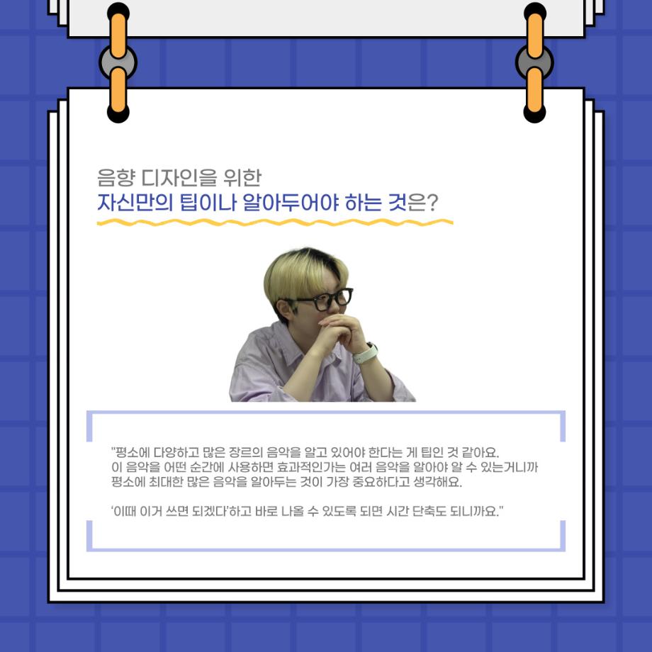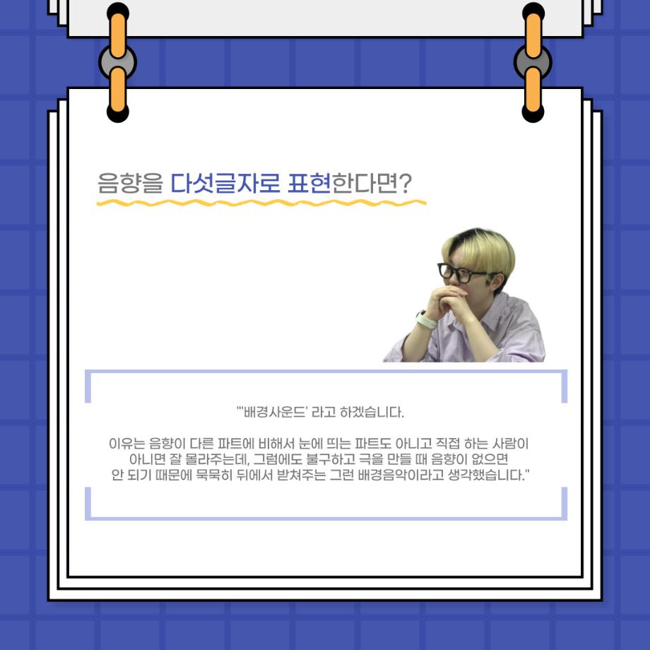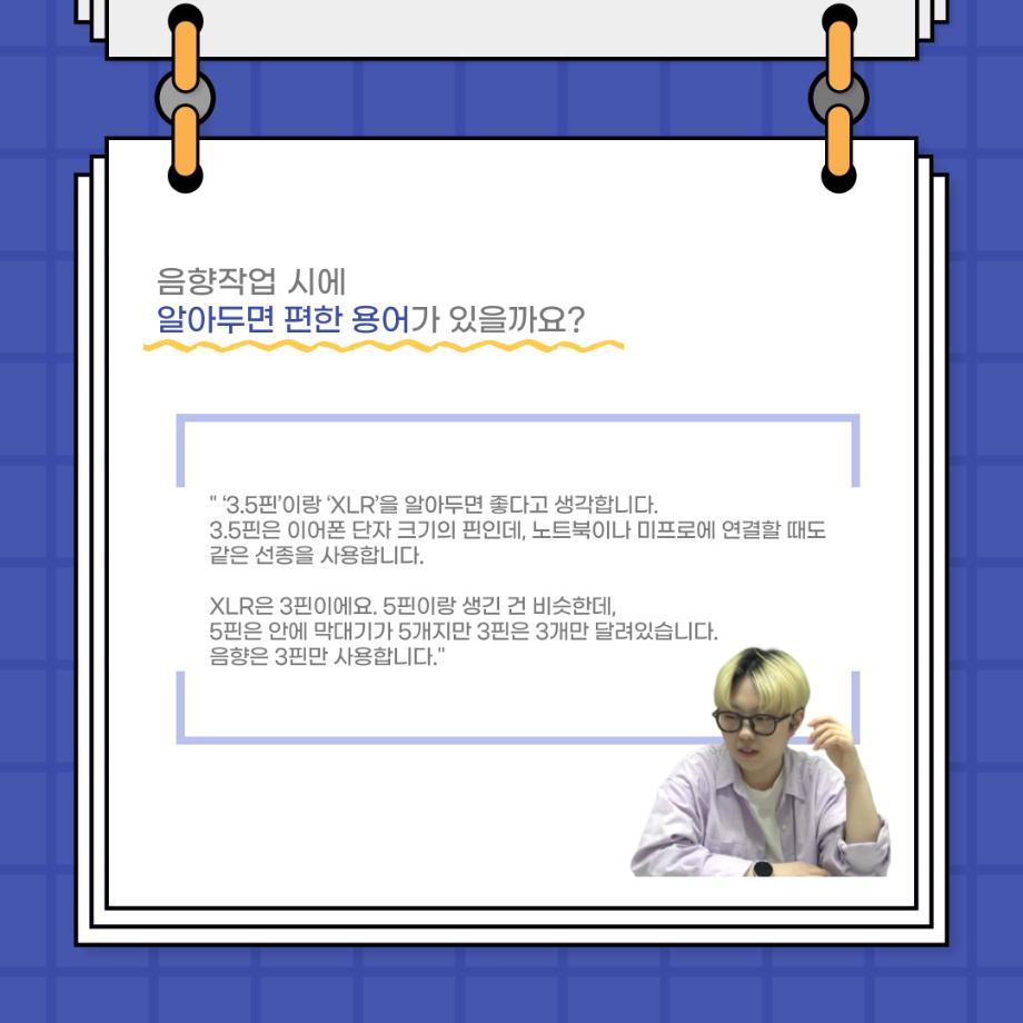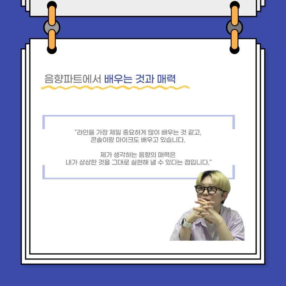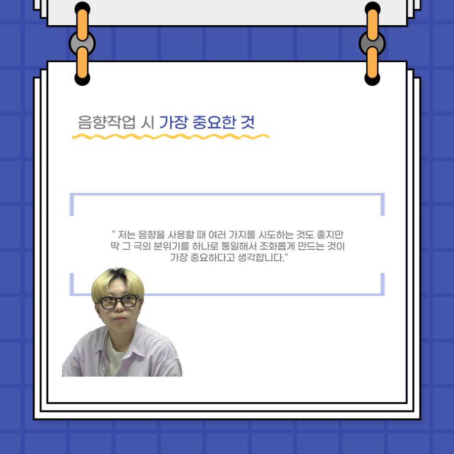 본문 시작 홈으로 커뮤니티 학과소개 입학정보 교수소개 학과과정 커뮤니티 공연예매 안내 홈페이지가이드 포토갤러리 공지사항 포토갤러리 작품DB 동아리 학사일정 학생회 포토갤러리 페이스북 트위터 프린트 사이와의 인터뷰 - 23년도 음향 사수 '임소정' 연기예술학과 3612 2023-08-09 안녕하십니까. 23년도 학회 ‘사이’입니다. 학회 ‘사이’의 여섯번째 인터뷰로 연기예술학과 23년도 음향 사수인 임소정 학생과 인터뷰하는 시간을 가졌습니다. 이번 인터뷰에서는 음향에 대한 매력과 음향 작업에서 가장 중요한 것, 음향 작업에서 알아두어야 하는 것 등에 대해 인터뷰하였습니다. 앞으로 있을 인터뷰 컨텐츠 ‘사인’ 많은 사랑 부탁드립니다. 목록 다음 2023학년도 1학기 하계 현장실습 ‘어드벤쳐프로젝트’ 다음 제14회 서울 청소년 연극축제 담당부서 : 연기예술학과 담당자 : - 연락처 : 043-649-1733 최종수정일 : 2024-10-26 만족도조사 만족도 조사 이 페이지에서 제공하는 정보에 대하여 만족하시나요? 매우만족 만족 보통 불만족 매우불만족