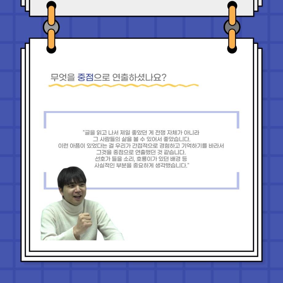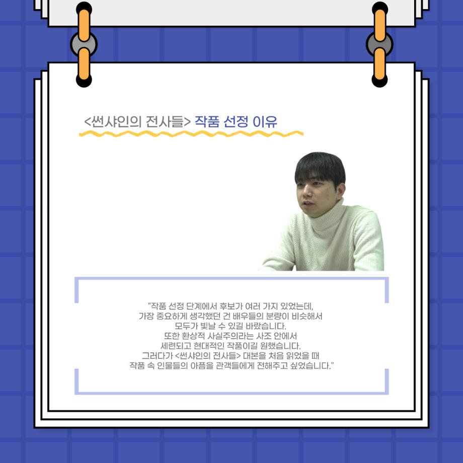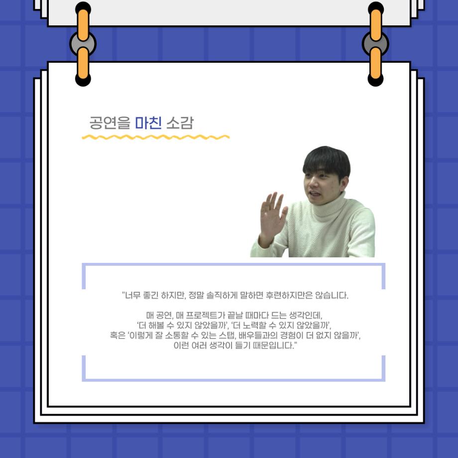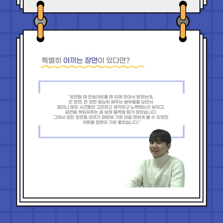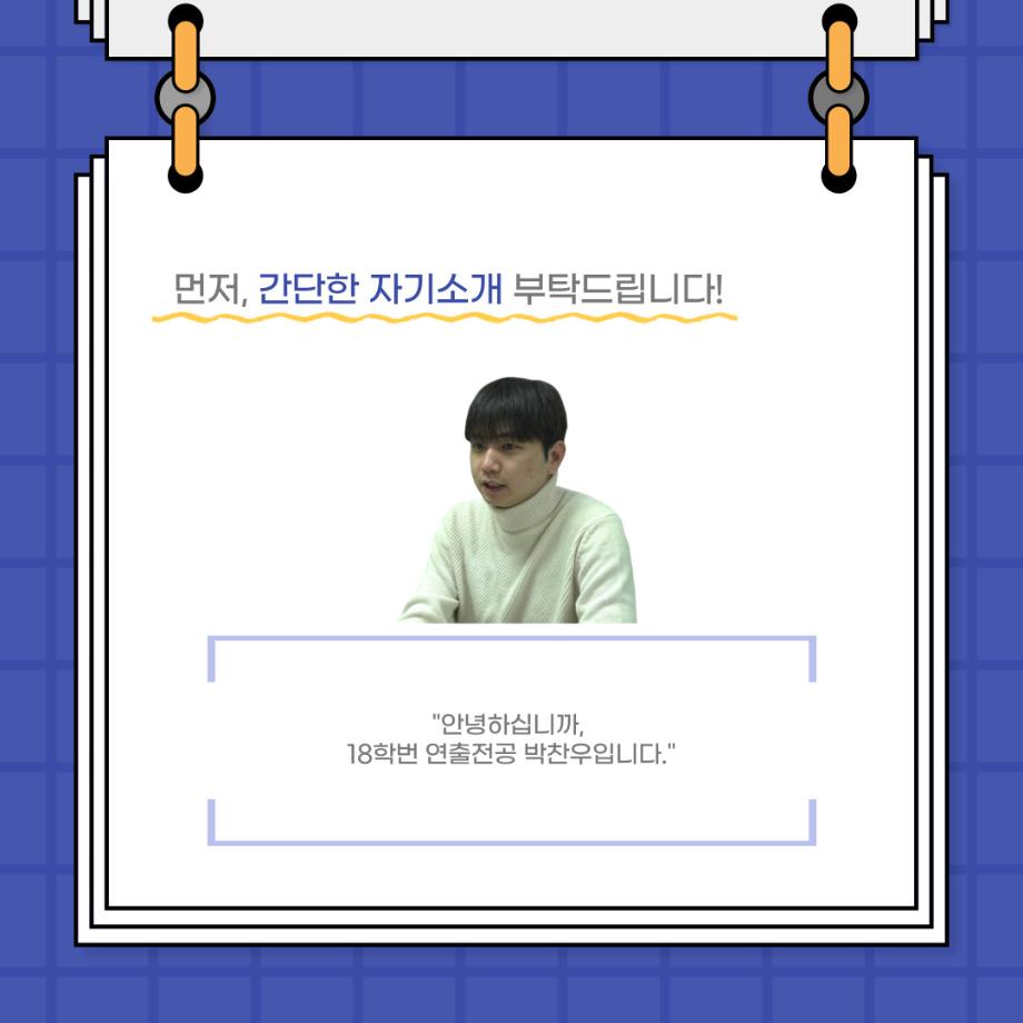본문 시작 홈으로 커뮤니티 학과소개 입학정보 교수소개 학과과정 커뮤니티 공연예매 안내 홈페이지가이드 포토갤러리 공지사항 포토갤러리 작품DB 동아리 학사일정 학생회 포토갤러리 페이스북 트위터 프린트 사이와의 인터뷰 - 23년도 졸업작품 학생연출 ‘박찬우‘ 연기예술학과 3107 2024-02-05 안녕하십니까. 23년도 학회 ‘사이’입니다. 학회 ‘사이’의 스무번째 인터뷰로 연기예술학과 23년도 졸업작품 <썬샤인의 전사들>의 학생연출인 박찬우 학생과 인터뷰하는 시간을 가졌습니다. 이번 인터뷰에서는 졸업작품 <썬샤인의 전사들>을 선정한 이유, 아끼는 장면, 공연을 마친 소감 등에 대해 인터뷰하였습니다. 다음 인터뷰 컨텐츠 ‘사인’도 많은 사랑 부탁드립니다. 목록 이전사이와의 인터뷰 - 23년도 극장동아리 영상 파트 부원 ‘정태경‘ 다음 사이와의 인터뷰 - 23년도 졸업작품 한승우役 ‘김덕종‘ 담당부서 : 연기예술학과 담당자 : - 연락처 : 043-649-1733 최종수정일 : 2024-10-26 만족도조사 만족도 조사 이 페이지에서 제공하는 정보에 대하여 만족하시나요? 매우만족 만족 보통 불만족 매우불만족