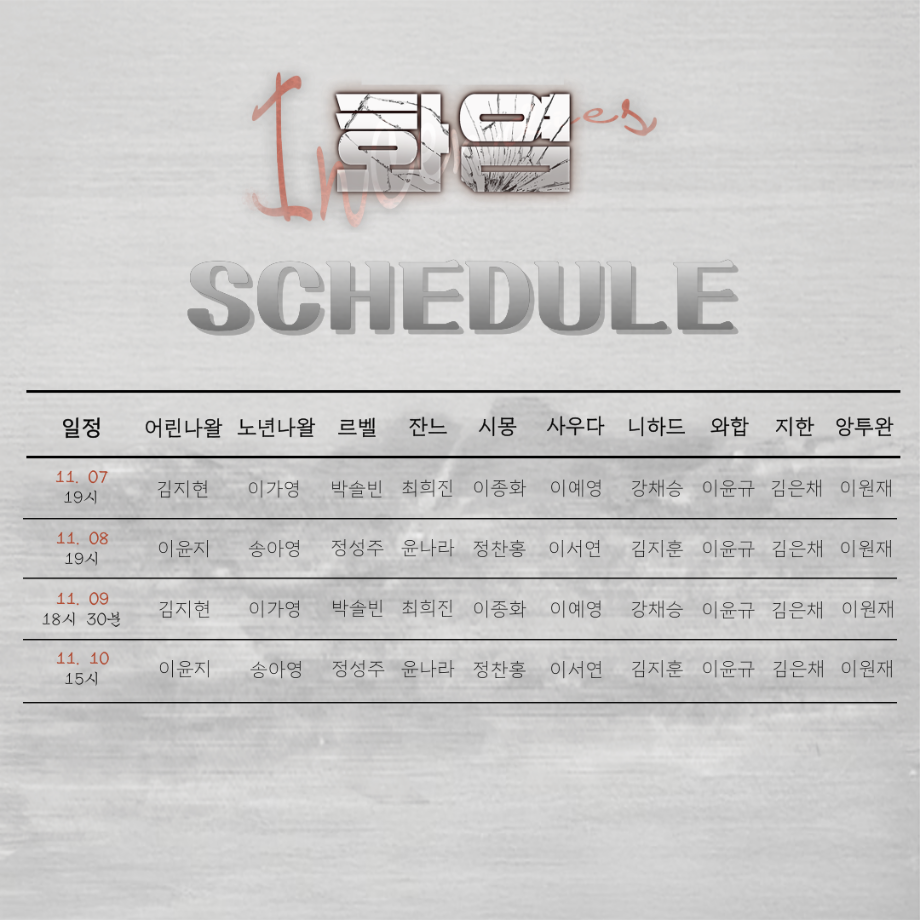본문 시작 홈으로 커뮤니티 학과소개 입학정보 교수소개 학과과정 커뮤니티 공연예매 안내 홈페이지가이드 포토갤러리 공지사항 포토갤러리 작품DB 동아리 학사일정 학생회 포토갤러리 페이스북 트위터 프린트 제 17회 세명대학교 연기예술학과 졸업작품 <화염> 스케줄표 연기예술학과 3199 2024-11-06 우리 함께 있으니, 모든게 나아질거야. - 공연일시 A CAST 11.08(금) 19:00 11.10(일) 15:00 B CAST 11.07(목) 19:00 11.09(토) 18:30 서울 대학로 민송아트홀 1관 목록 이전제 17회 세명대학교 연기예술학과 졸업작품 <화염> 포스터 & 캐스트 다음 2024학년도 집단심층토의FGI“세명톡톡TALK TALK” 참여자 모집 담당부서 : 연기예술학과 담당자 : - 연락처 : 043-649-1733 최종수정일 : 2024-10-26 만족도조사 만족도 조사 이 페이지에서 제공하는 정보에 대하여 만족하시나요? 매우만족 만족 보통 불만족 매우불만족