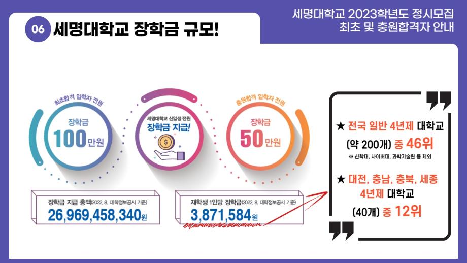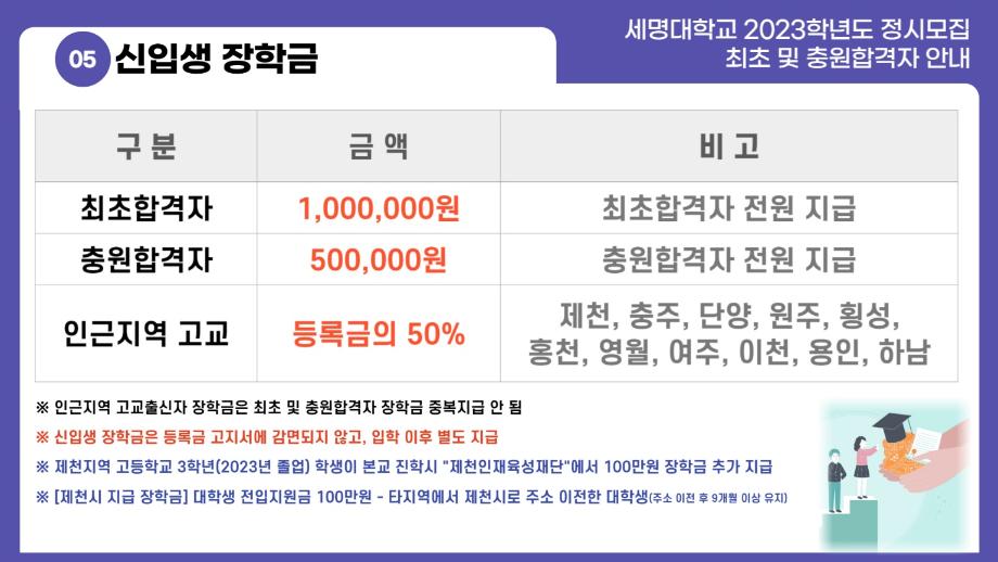 ※ 제천지역 고등학교 3학년(2023년 졸업) 학생이 본교 진학시 "제천인재육성재단"에서 100만원 추가 지급