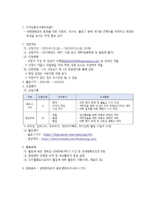 본문 시작 홈으로 커뮤니티 학과소개 입학정보 교수소개 학과과정 커뮤니티 공연예매 안내 홈페이지가이드 포토갤러리 공지사항 포토갤러리 작품DB 동아리 학사일정 학생회 포토갤러리 페이스북 트위터 프린트 2023학년도 세명대학교 디지털 홍보 서포터즈 연기예술학과 2626 2023-03-14 2023학년도 세명대학교 디지털 홍보 서포터즈 목록 이전2023학년도 1학기 개강총회 안내문 다음 2023학년도 학생위원회 신규위원 모집 담당부서 : 연기예술학과 담당자 : - 연락처 : 043-649-1733 최종수정일 : 2024-10-26 만족도조사 만족도 조사 이 페이지에서 제공하는 정보에 대하여 만족하시나요? 매우만족 만족 보통 불만족 매우불만족