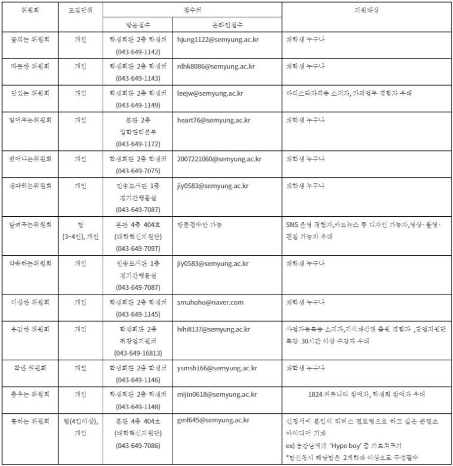 본문 시작 홈으로 커뮤니티 학과소개 입학정보 교수소개 학과과정 커뮤니티 공연예매 안내 홈페이지가이드 포토갤러리 공지사항 포토갤러리 작품DB 동아리 학사일정 학생회 포토갤러리 페이스북 트위터 프린트 2023학년도 학생위원회 신규위원 모집 연기예술학과 2651 2023-03-15 2023학년도 학생위원회 신규위원 모집 목록 이전2023학년도 세명대학교 디지털 홍보 서포터즈 다음 2023학년도 대학생 청소년교육지원사업 장학생 모집 안내 담당부서 : 연기예술학과 담당자 : - 연락처 : 043-649-1733 최종수정일 : 2024-10-26 만족도조사 만족도 조사 이 페이지에서 제공하는 정보에 대하여 만족하시나요? 매우만족 만족 보통 불만족 매우불만족