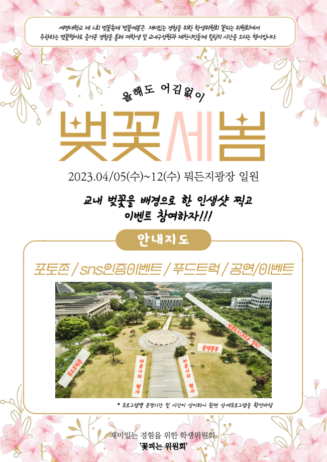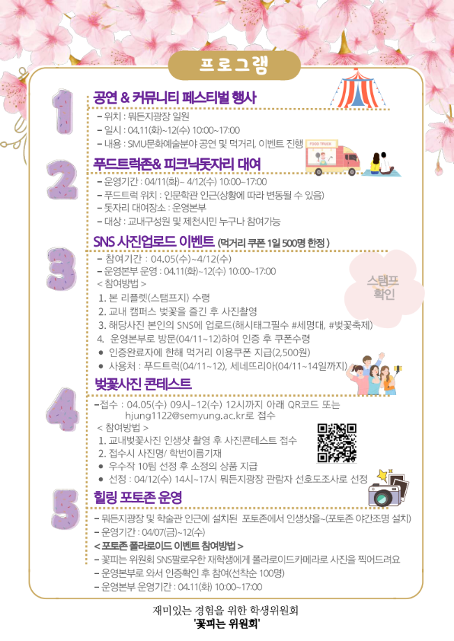 본문 시작 홈으로 커뮤니티 학과소개 입학정보 교수소개 학과과정 커뮤니티 공연예매 안내 홈페이지가이드 포토갤러리 공지사항 포토갤러리 작품DB 동아리 학사일정 학생회 포토갤러리 페이스북 트위터 프린트 제2회 세명대학교 벚꽃축제 개최 안내 연기예술학과 2728 2023-04-04 캠퍼스에 설레는 봄이 찾아왔습니다. 세명대학교 학생위원회인 '꽃피는 위원회'에서 준비한 제2회 세명대학교 벚꽃축제 개최 안내 목록 이전2023학년도 학생대상 폭력예방교육 다음 제8회 커뮤니티 페스티벌 담당부서 : 연기예술학과 담당자 : - 연락처 : 043-649-1733 최종수정일 : 2024-10-26 만족도조사 만족도 조사 이 페이지에서 제공하는 정보에 대하여 만족하시나요? 매우만족 만족 보통 불만족 매우불만족