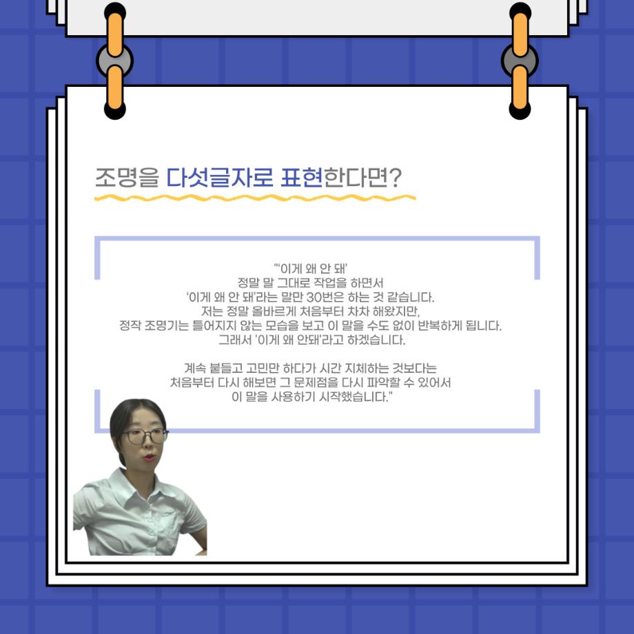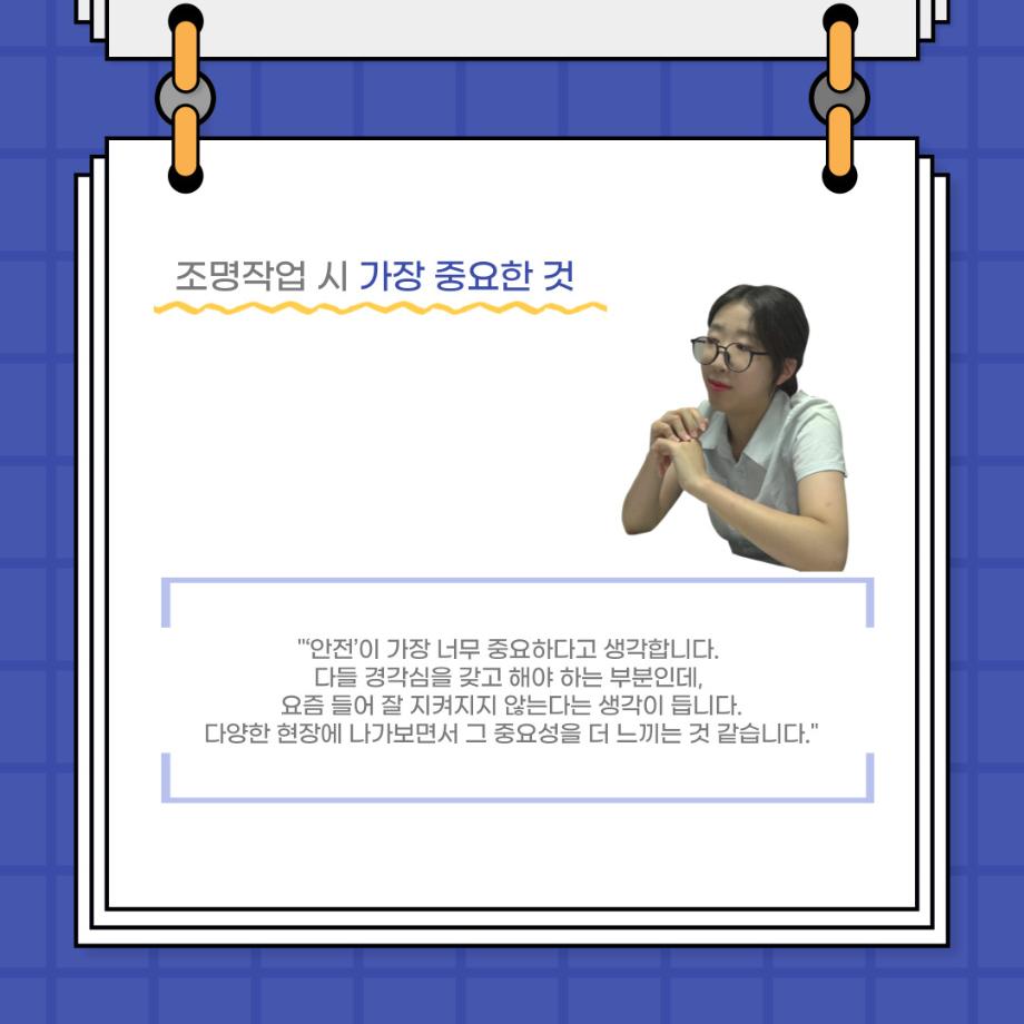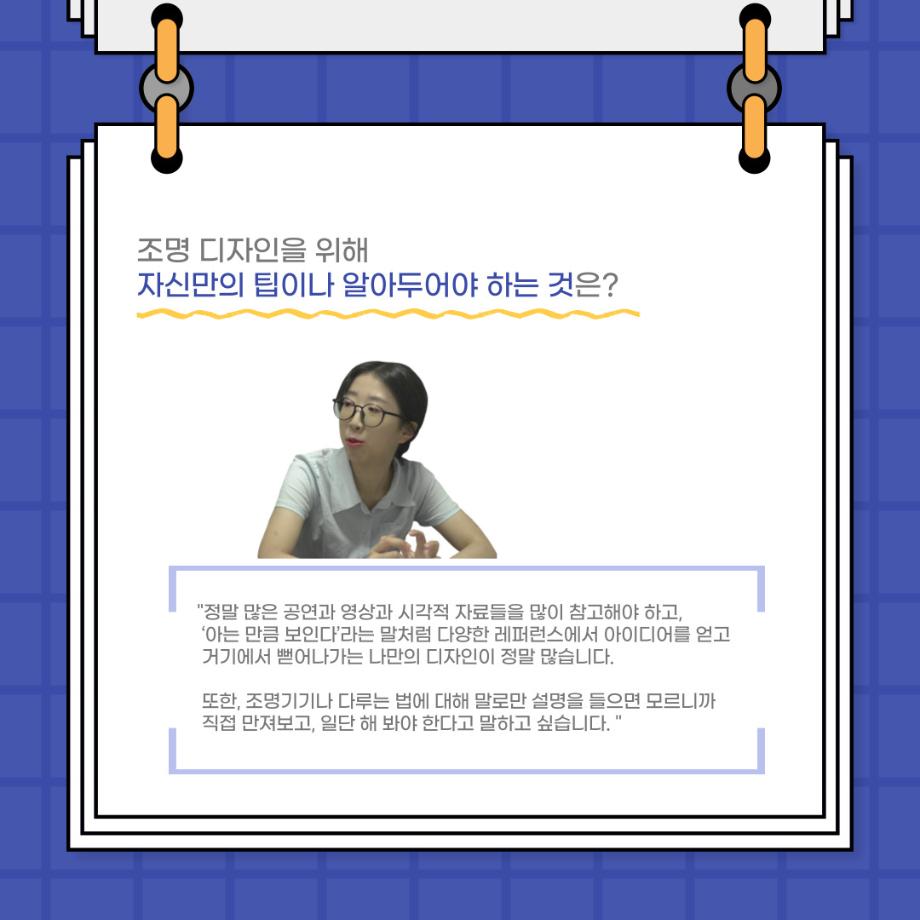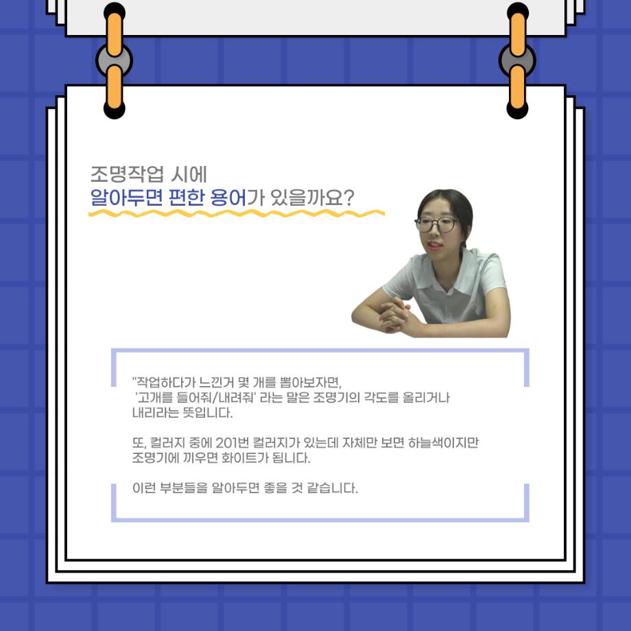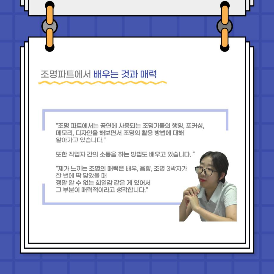 본문 시작 홈으로 커뮤니티 학과소개 입학정보 교수소개 학과과정 커뮤니티 공연예매 안내 홈페이지가이드 포토갤러리 공지사항 포토갤러리 작품DB 동아리 학사일정 학생회 포토갤러리 페이스북 트위터 프린트 사이와의 인터뷰 - 23년도 조명장 ‘김은경‘ 연기예술학과 3432 2023-07-10 안녕하십니까. 23년도 학회 ‘사이’입니다. 학회 ‘사이’의 두번째 인터뷰로 연기예술학과 23년도 조명장인 김은경 학생과 인터뷰하는 시간을 가졌습니다. 이번 인터뷰에서는 조명에 대한 매력과 조명 작업에서 가장 중요한 것, 조명 작업에서 알아두어야 하는 것 등에 대해 인터뷰하였습니다. 다음 인터뷰 컨텐츠 ‘사인’도 많은 사랑 부탁드립니다. 목록 이전2023학년도「전과자문단」운영 안내 다음 이지은 교수님 연출작품 <1923년생 조선인 최영우> 담당부서 : 연기예술학과 담당자 : - 연락처 : 043-649-1733 최종수정일 : 2024-10-26 만족도조사 만족도 조사 이 페이지에서 제공하는 정보에 대하여 만족하시나요? 매우만족 만족 보통 불만족 매우불만족