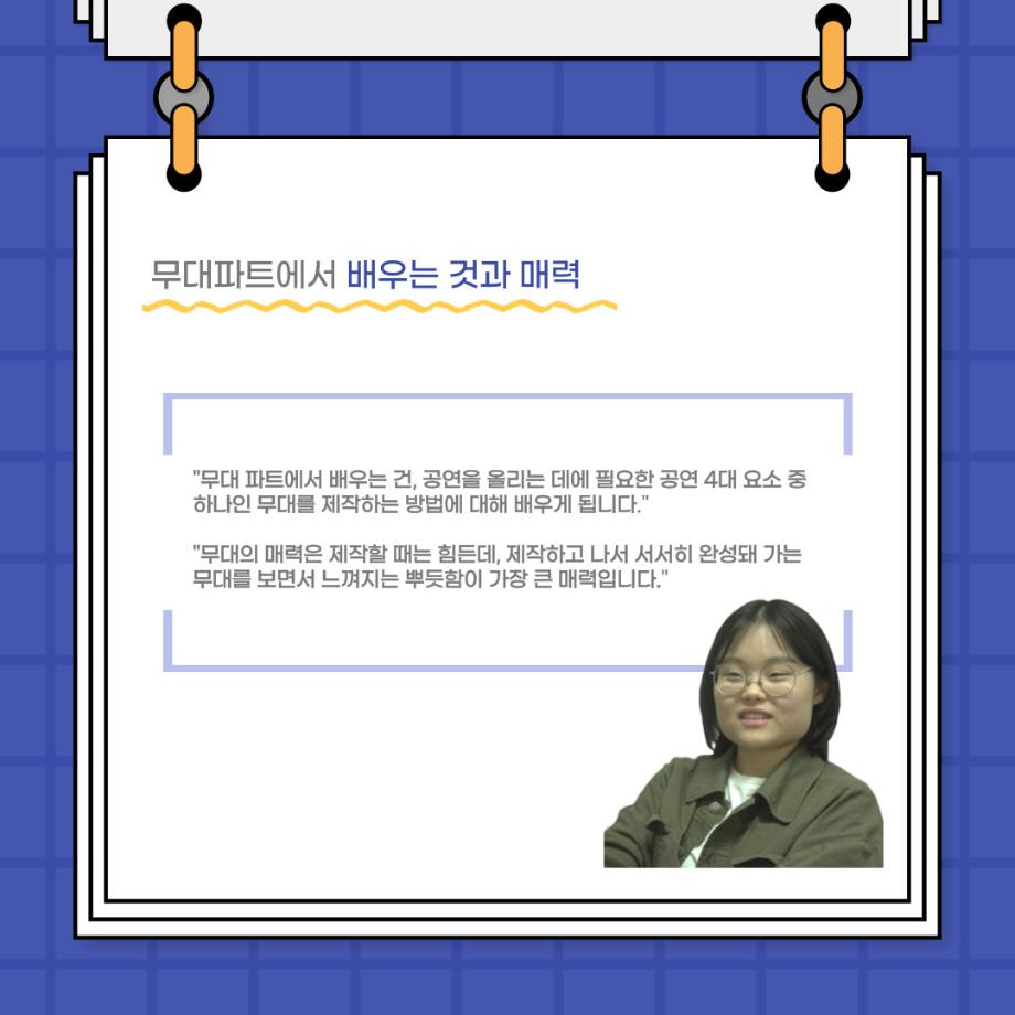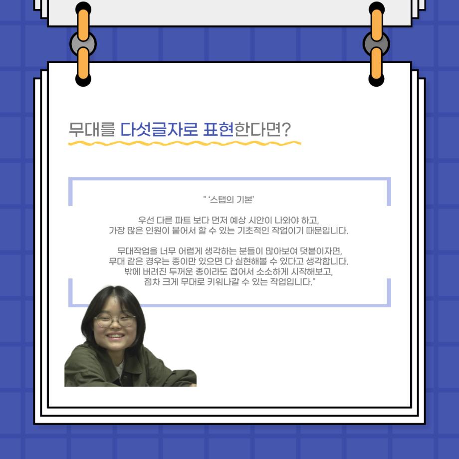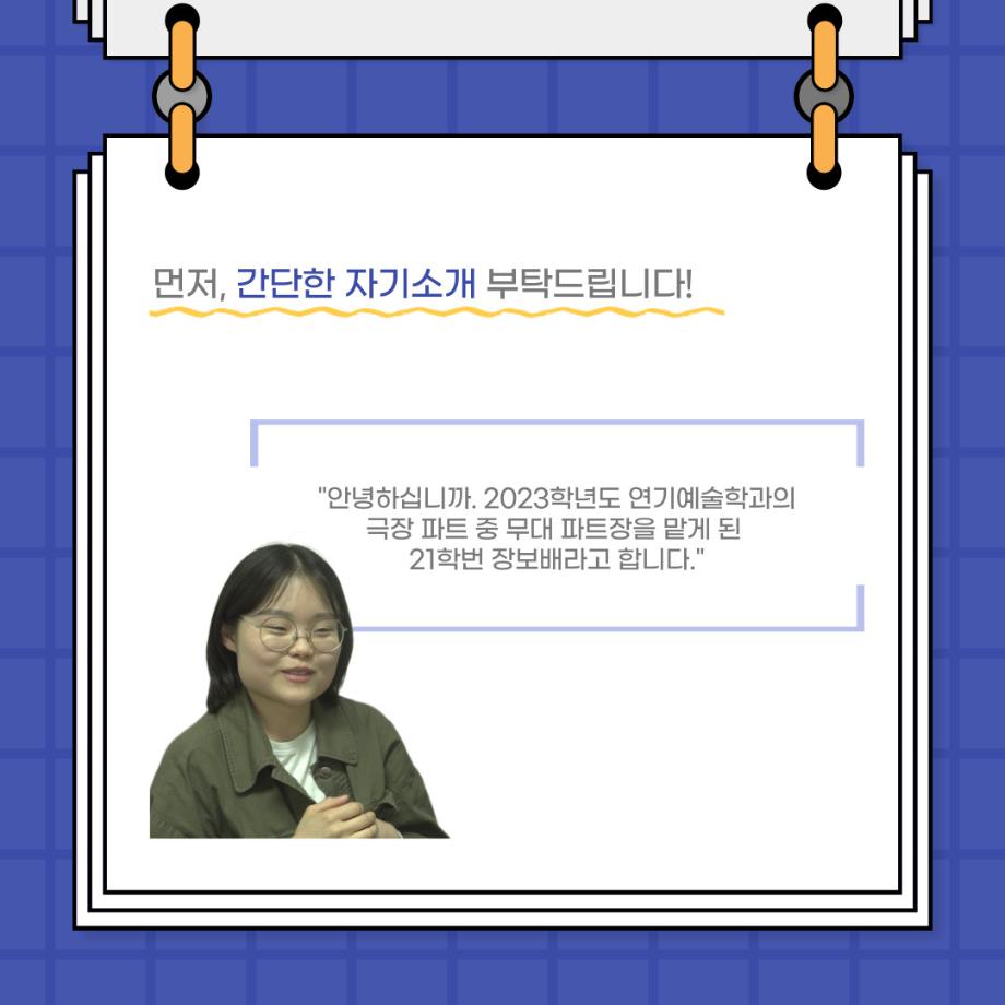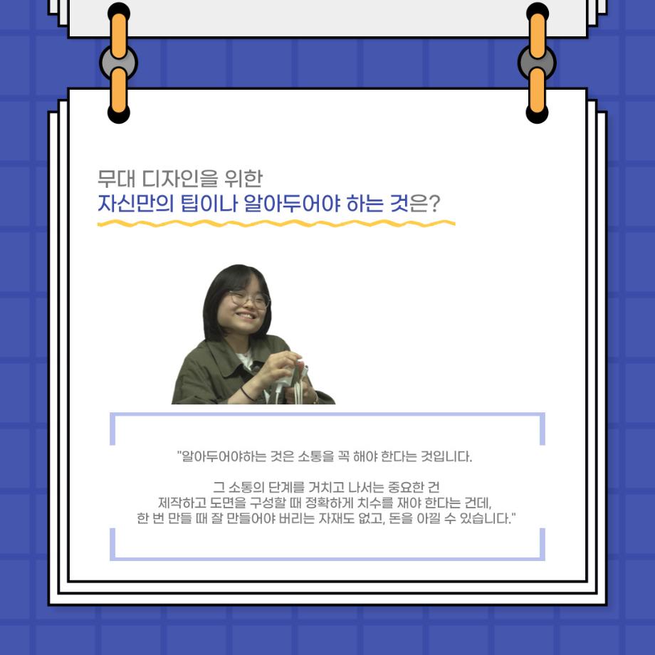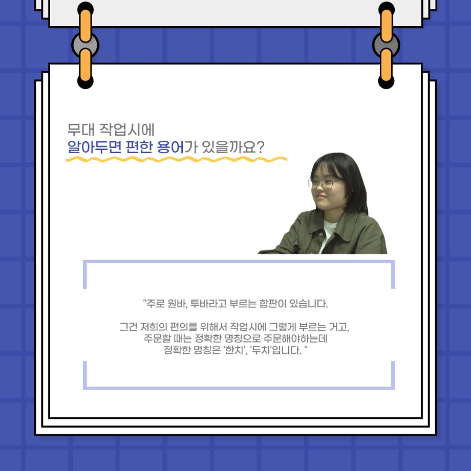본문 시작 홈으로 커뮤니티 학과소개 입학정보 교수소개 학과과정 커뮤니티 공연예매 안내 홈페이지가이드 포토갤러리 공지사항 포토갤러리 작품DB 동아리 학사일정 학생회 포토갤러리 페이스북 트위터 프린트 사이와의 인터뷰 - 23년도 무대장 ‘장보배‘ 연기예술학과 3810 2023-08-21 안녕하십니까! 23년도 학회 ‘사이’입니다! 학회 ‘사이’의 일곱번째 인터뷰로 연기예술학과 23년도 무대장인 장보배 학생과 인터뷰하는 시간을 가졌습니다. 이번 인터뷰에서는 무대 파트의 매력과 무대 작업시 가장 중요한 것, 무대 작업에서 알아두어야 하는 것 등에 대해 인터뷰하였습니다. 다음 인터뷰 컨텐츠 ‘사인’도 많은 사랑 부탁드립니다. 목록 이전제 96회 세명대학교 연기예술학과 정기공연 하계 프로젝트 - < d0nut > 다음 제 97회 세명대학교 연기예술학과 정기공연 '하계 프로젝트' < 첼로와 케찹 > 담당부서 : 연기예술학과 담당자 : - 연락처 : 043-649-1733 최종수정일 : 2024-10-26 만족도조사 만족도 조사 이 페이지에서 제공하는 정보에 대하여 만족하시나요? 매우만족 만족 보통 불만족 매우불만족
