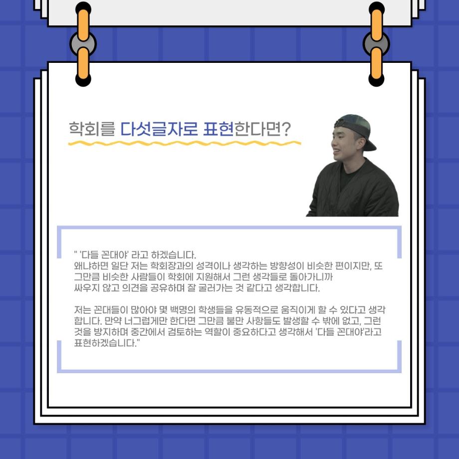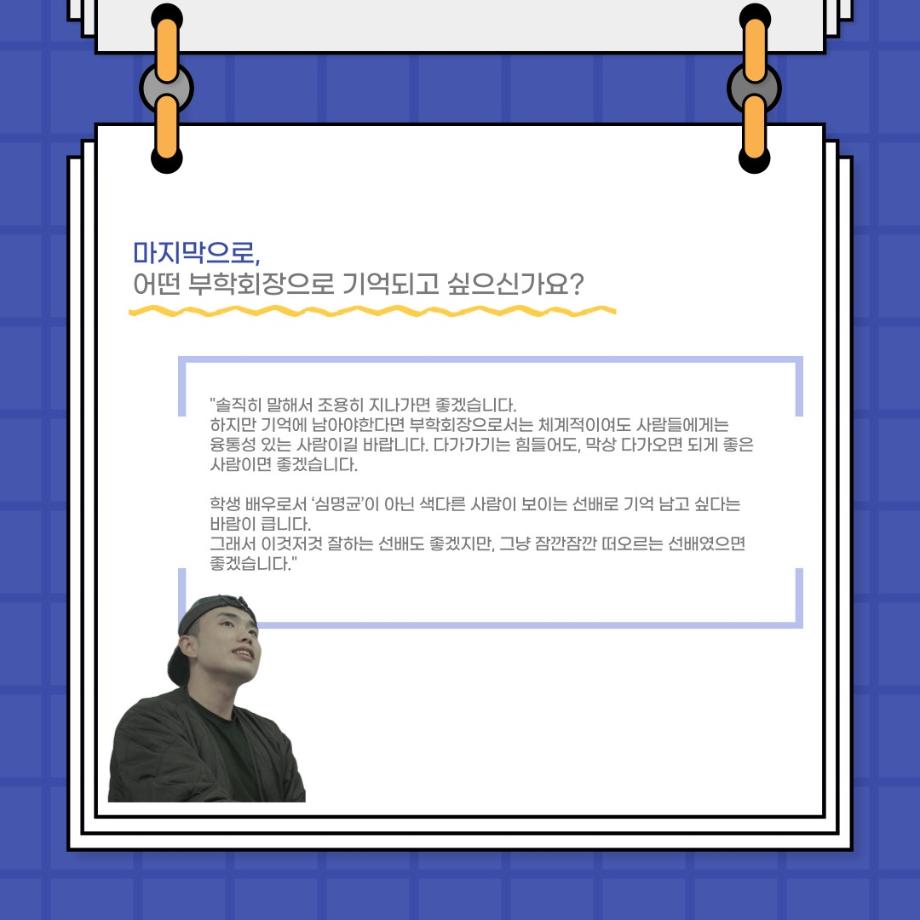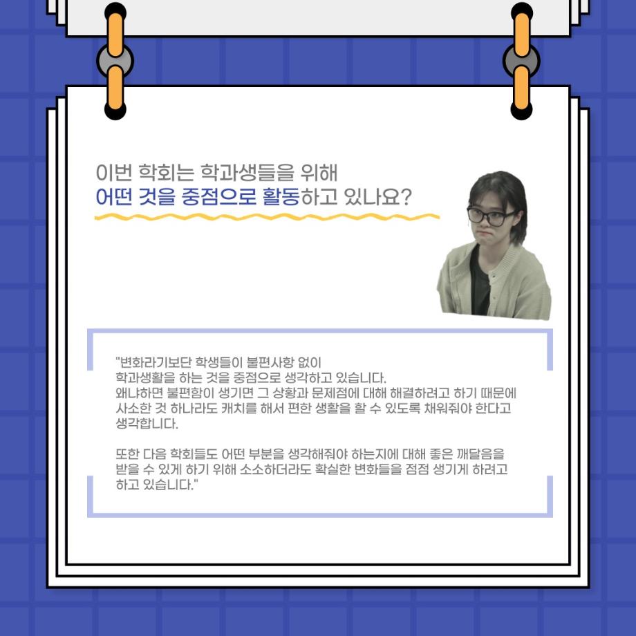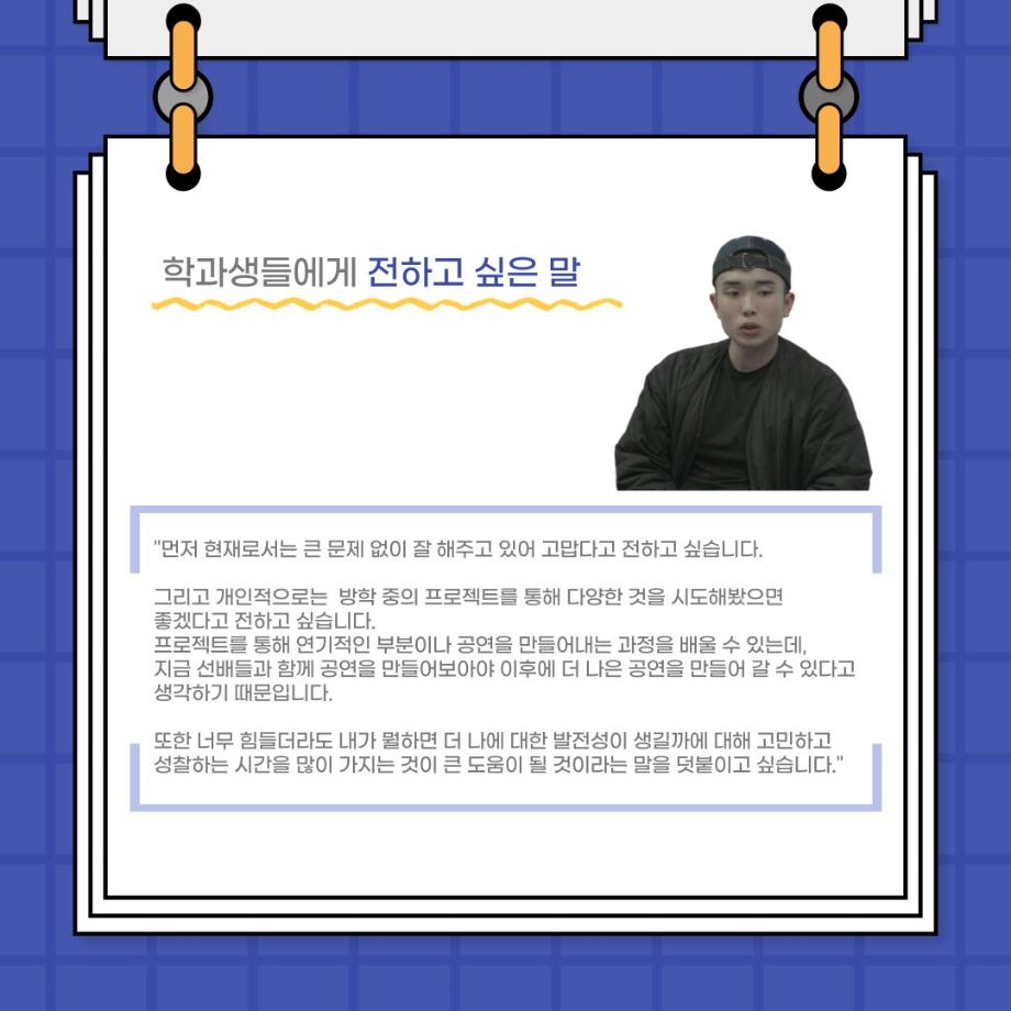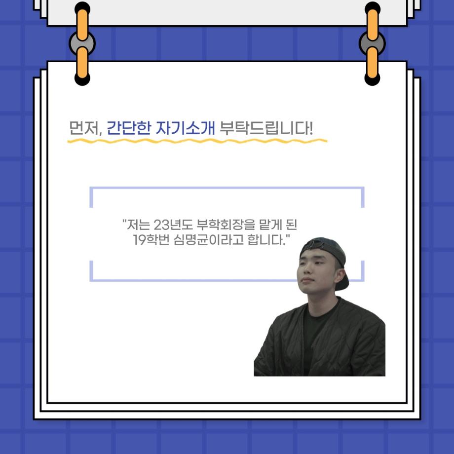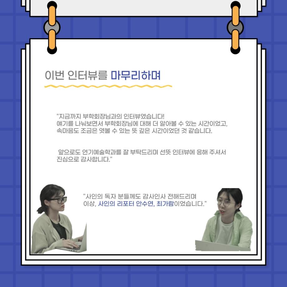 본문 시작 홈으로 커뮤니티 학과소개 입학정보 교수소개 학과과정 커뮤니티 공연예매 안내 홈페이지가이드 포토갤러리 공지사항 포토갤러리 작품DB 동아리 학사일정 학생회 포토갤러리 페이스북 트위터 프린트 사이와의 인터뷰 - 23년도 부학회장 ‘심명균’ 연기예술학과 3286 2023-06-07 안녕하십니까. 23년도 학회 ‘사이’입니다! 학회 ‘사이’의 두번째 인터뷰로 연기예술학과 23년도 부학회장인 심명균 부학회장과 인터뷰하는 시간을 가졌습니다. 학회를 맡은 소감과 부학회장이 되기로 결심한 계기, 학과생들에게 전하고 싶은 말 등 다양한 인터뷰를 진행하였습니다. 다음 인터뷰 컨텐츠 ‘사인’도 많은 사랑 부탁드립니다. 목록 다음 제 97회 세명대학교 연기예술학과 정기공연 '하계 프로젝트' < 첼로와 케찹 > 캐릭터 포스터 다음 사이와의 인터뷰 - 23년도 무대사수 ‘이종화’ 담당부서 : 연기예술학과 담당자 : - 연락처 : 043-649-1733 최종수정일 : 2024-10-26 만족도조사 만족도 조사 이 페이지에서 제공하는 정보에 대하여 만족하시나요? 매우만족 만족 보통 불만족 매우불만족