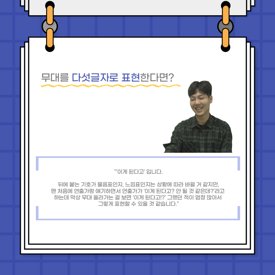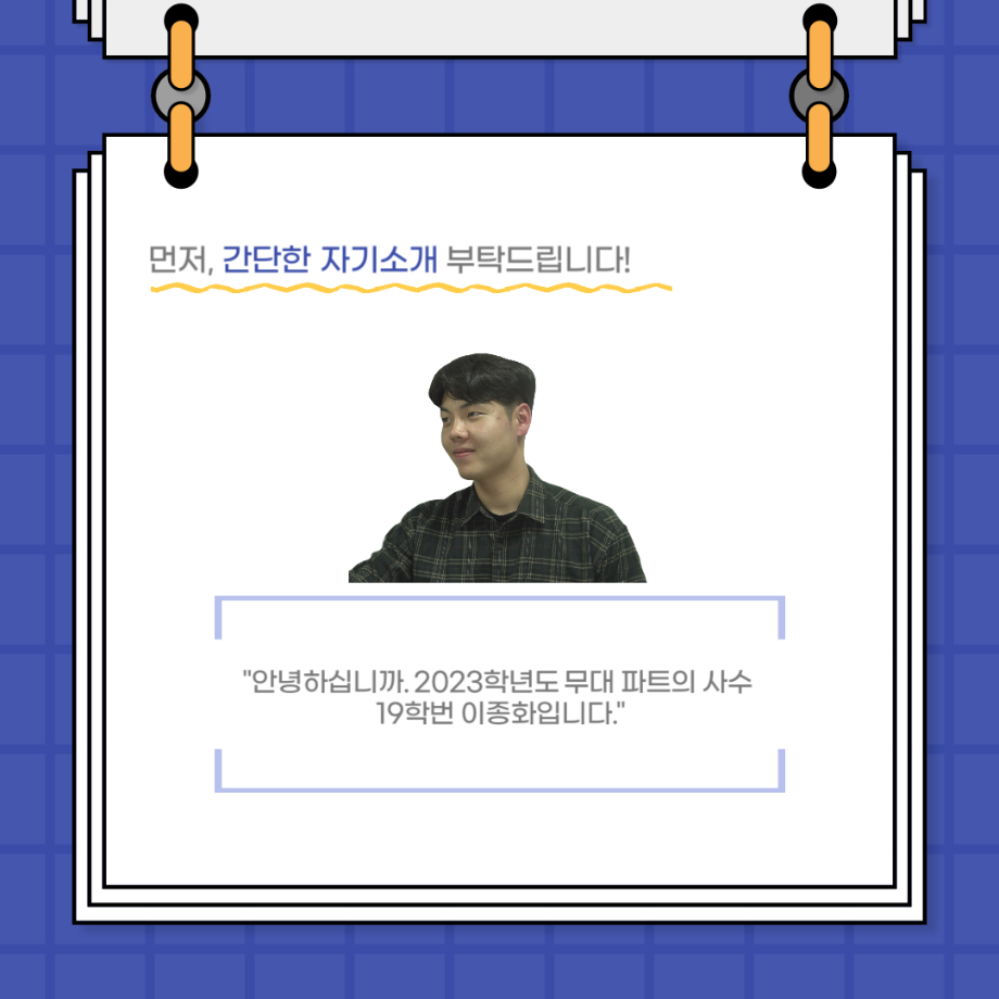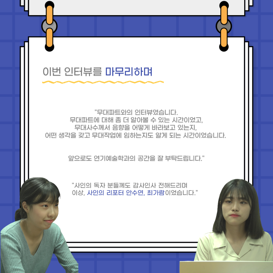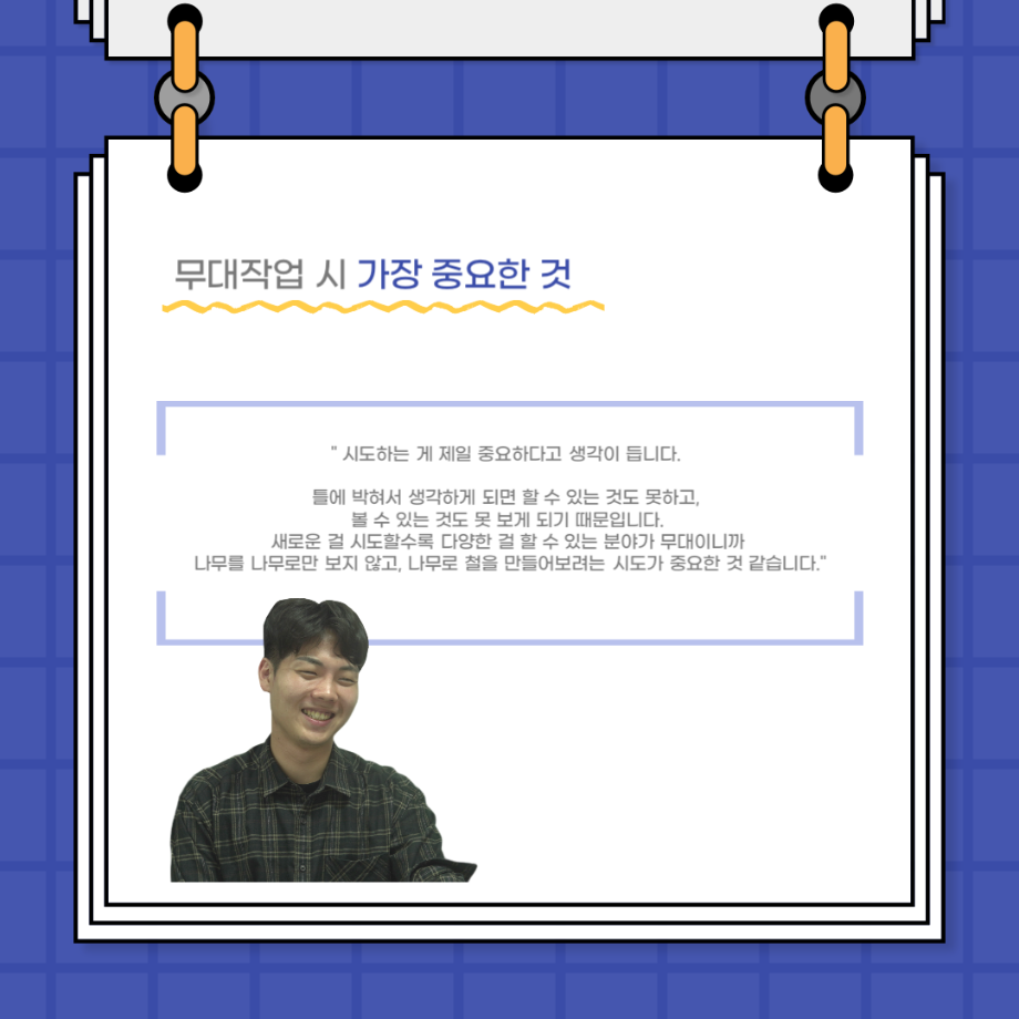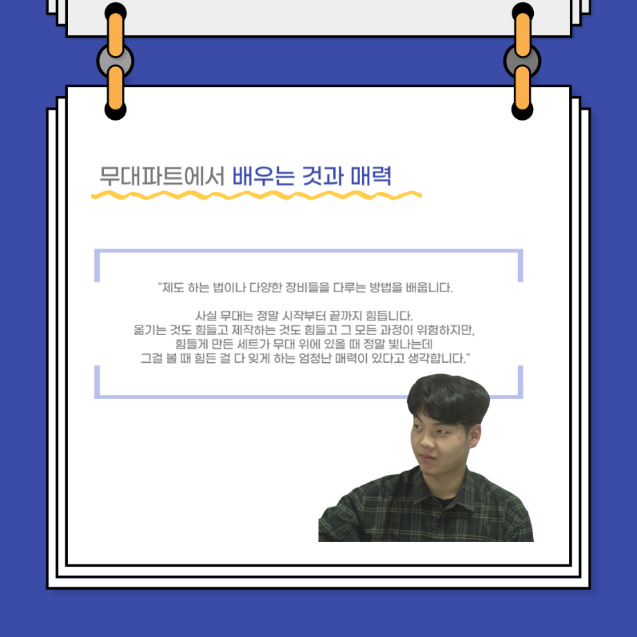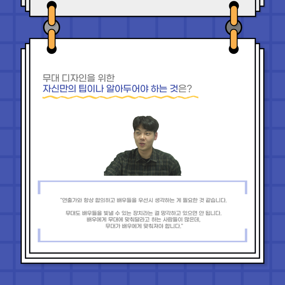 본문 시작 홈으로 커뮤니티 학과소개 입학정보 교수소개 학과과정 커뮤니티 공연예매 안내 홈페이지가이드 포토갤러리 공지사항 포토갤러리 작품DB 동아리 학사일정 학생회 포토갤러리 페이스북 트위터 프린트 사이와의 인터뷰 - 23년도 무대사수 ‘이종화’ 연기예술학과 3881 2023-08-31 안녕하십니까. 23년도 학회 ‘사이’입니다! 학회 ‘사이’의 여덟번째 인터뷰로 연기예술학과 23년도 무대사수인 이종화 학생과 인터뷰하는 시간을 가졌습니다. 이번 인터뷰에서는 무대 파트의 매력과 무대 작업시 가장 중요한 것, 무대 작업에서 알아두어야 하는 것 등에 대해 인터뷰하였습니다. 다음 인터뷰 컨텐츠 ‘사인’도 많은 사랑 부탁드립니다. 목록 이전사이와의 인터뷰 - 23년도 부학회장 ‘심명균’ 다음 ★제5회 세명진로Festival 자기소개서 특강 모집안내★ 담당부서 : 연기예술학과 담당자 : - 연락처 : 043-649-1733 최종수정일 : 2024-10-26 만족도조사 만족도 조사 이 페이지에서 제공하는 정보에 대하여 만족하시나요? 매우만족 만족 보통 불만족 매우불만족