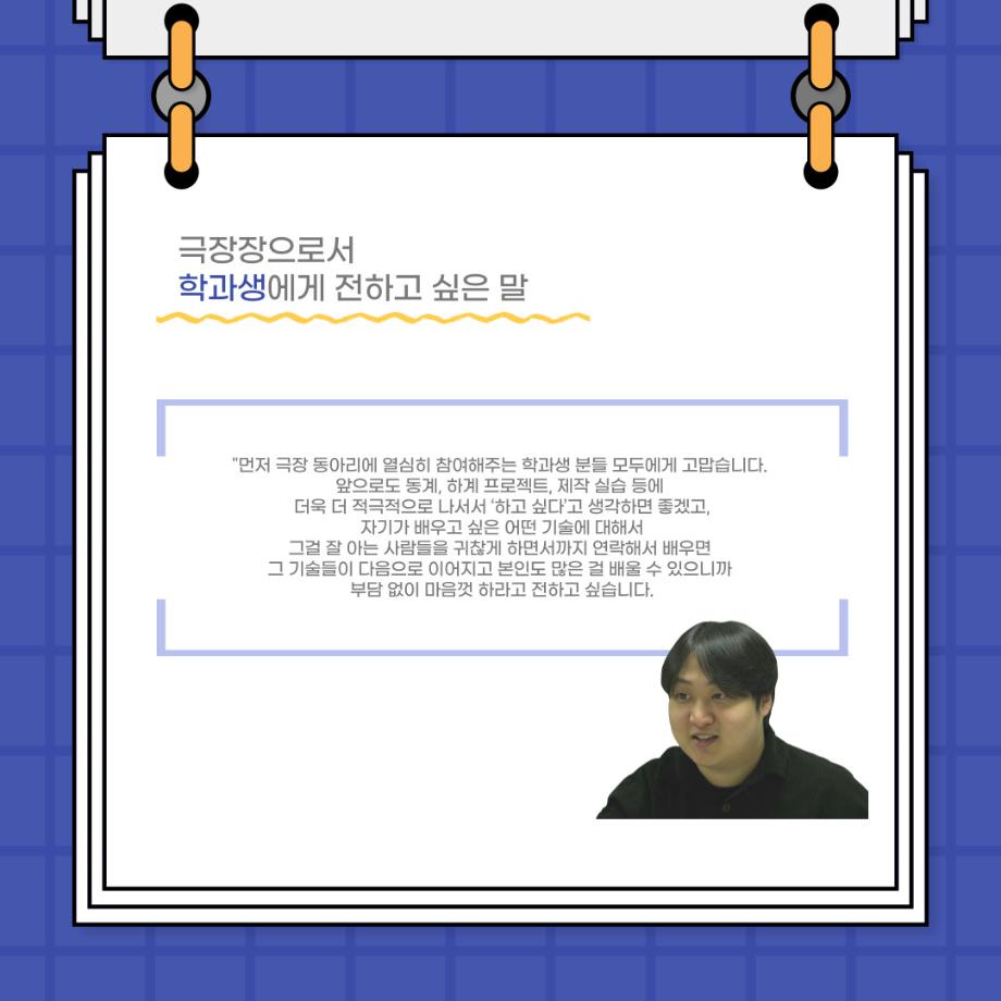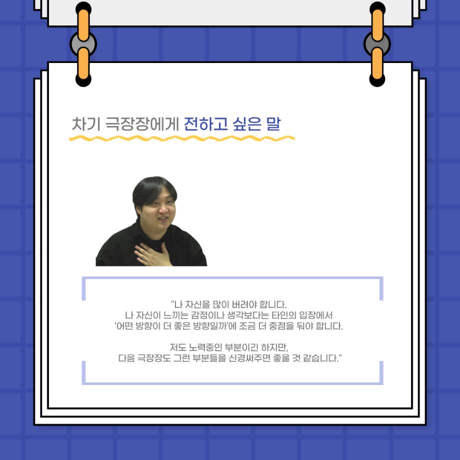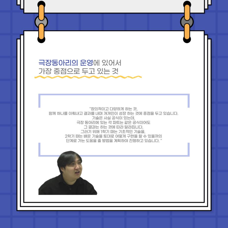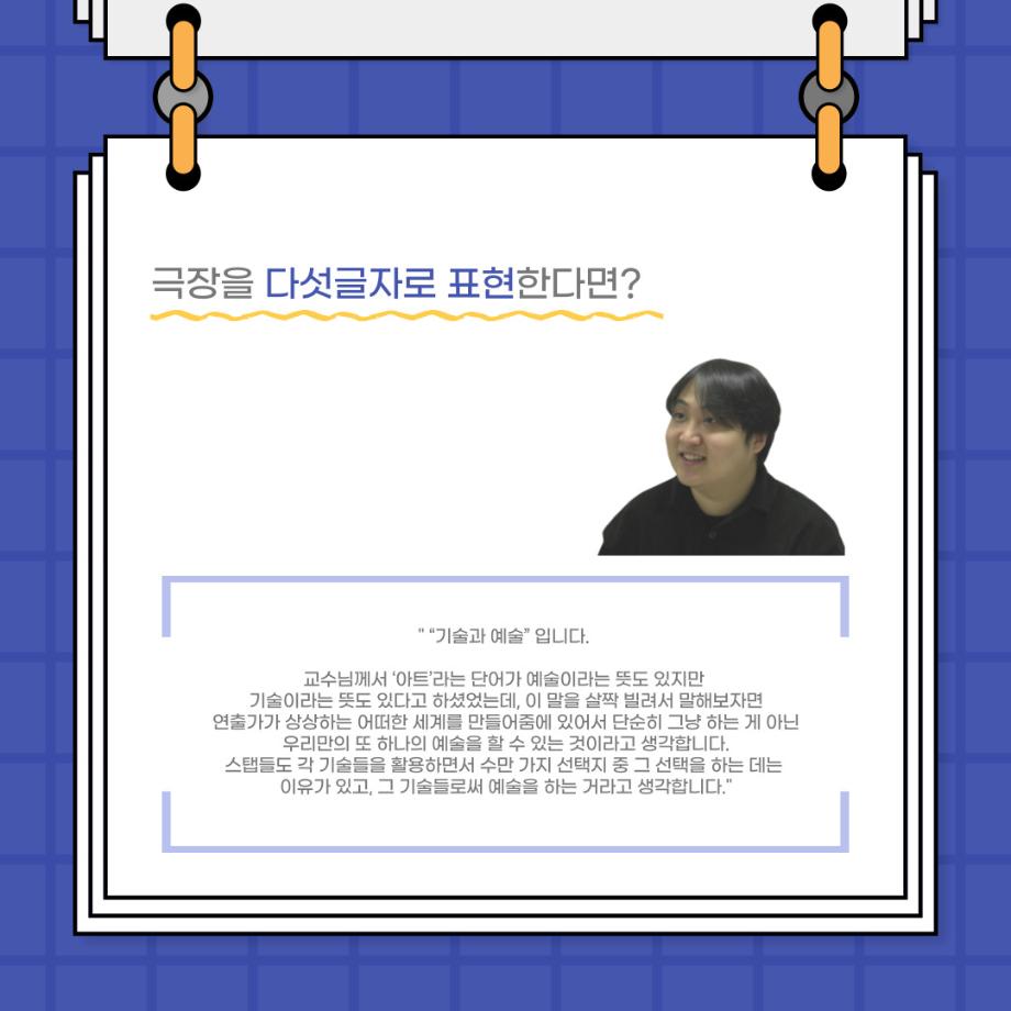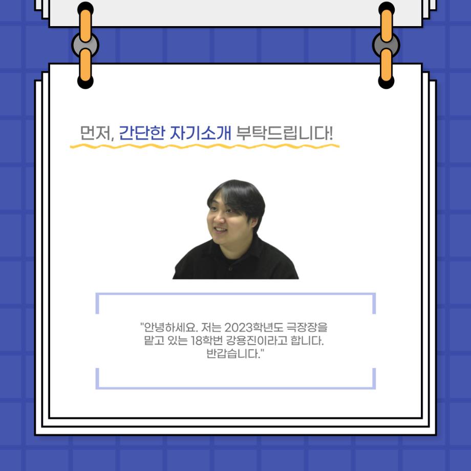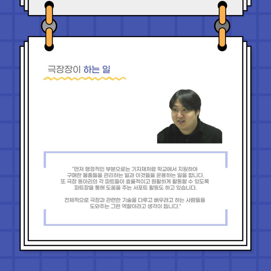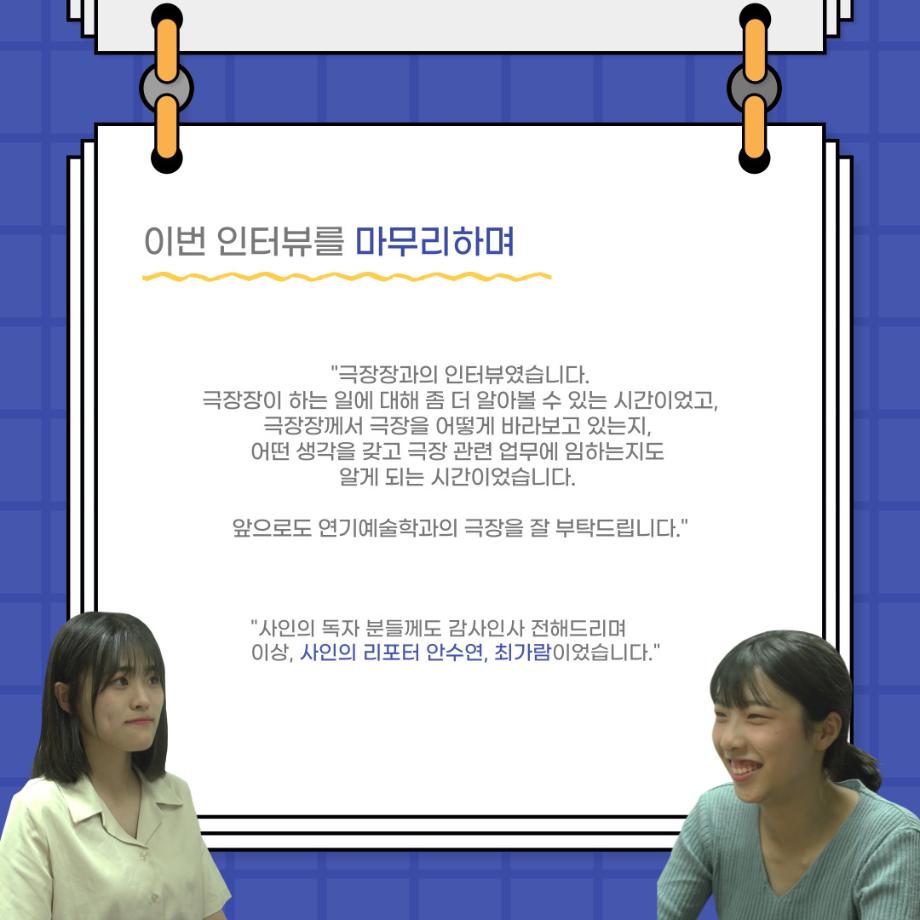 본문 시작 홈으로 커뮤니티 학과소개 입학정보 교수소개 학과과정 커뮤니티 공연예매 안내 홈페이지가이드 포토갤러리 공지사항 포토갤러리 작품DB 동아리 학사일정 학생회 포토갤러리 페이스북 트위터 프린트 사이와의 인터뷰 - 23년도 극장장 ‘강용진‘ 연기예술학과 3534 2023-11-22 안녕하십니까. 23년도 학회 ‘사이’입니다! 학회 ‘사이’의 열한번째 인터뷰로 연기예술학과 23년도 극장장인 강용진 학생과 인터뷰하는 시간을 가졌습니다. 이번 인터뷰에서는 극장장이 하는 일과 차기 극장장에게 한 마디, 극장 동아리 운영에 있어 중점적으로 생각하는 것 등에 대해 인터뷰하였습니다. 다음 인터뷰 컨텐츠 ‘사인’도 많은 사랑 부탁드립니다. 목록 이전제 16회 세명대학교 연기예술학과 졸업작품 <썬샤인의 전사들> 공연 성료 다음 제100회 세명대학교 연기예술학과 정기공연 2학년 <중급연기 관찰발표회> 스틸컷 담당부서 : 연기예술학과 담당자 : - 연락처 : 043-649-1733 최종수정일 : 2024-10-26 만족도조사 만족도 조사 이 페이지에서 제공하는 정보에 대하여 만족하시나요? 매우만족 만족 보통 불만족 매우불만족