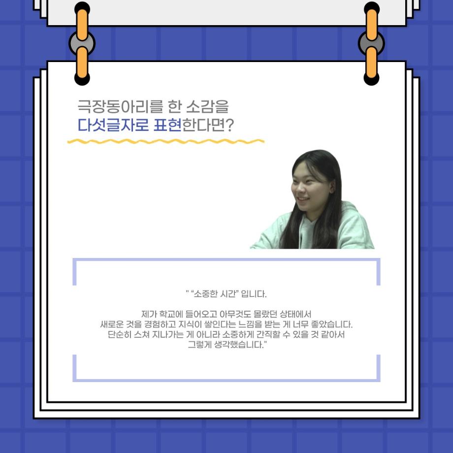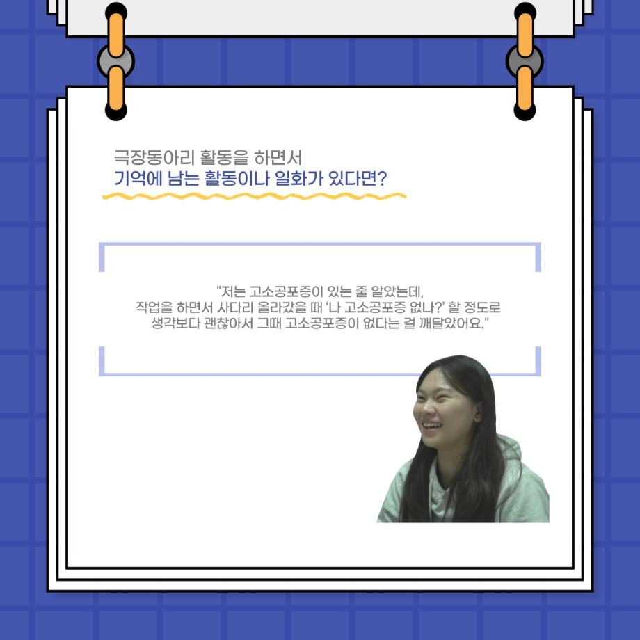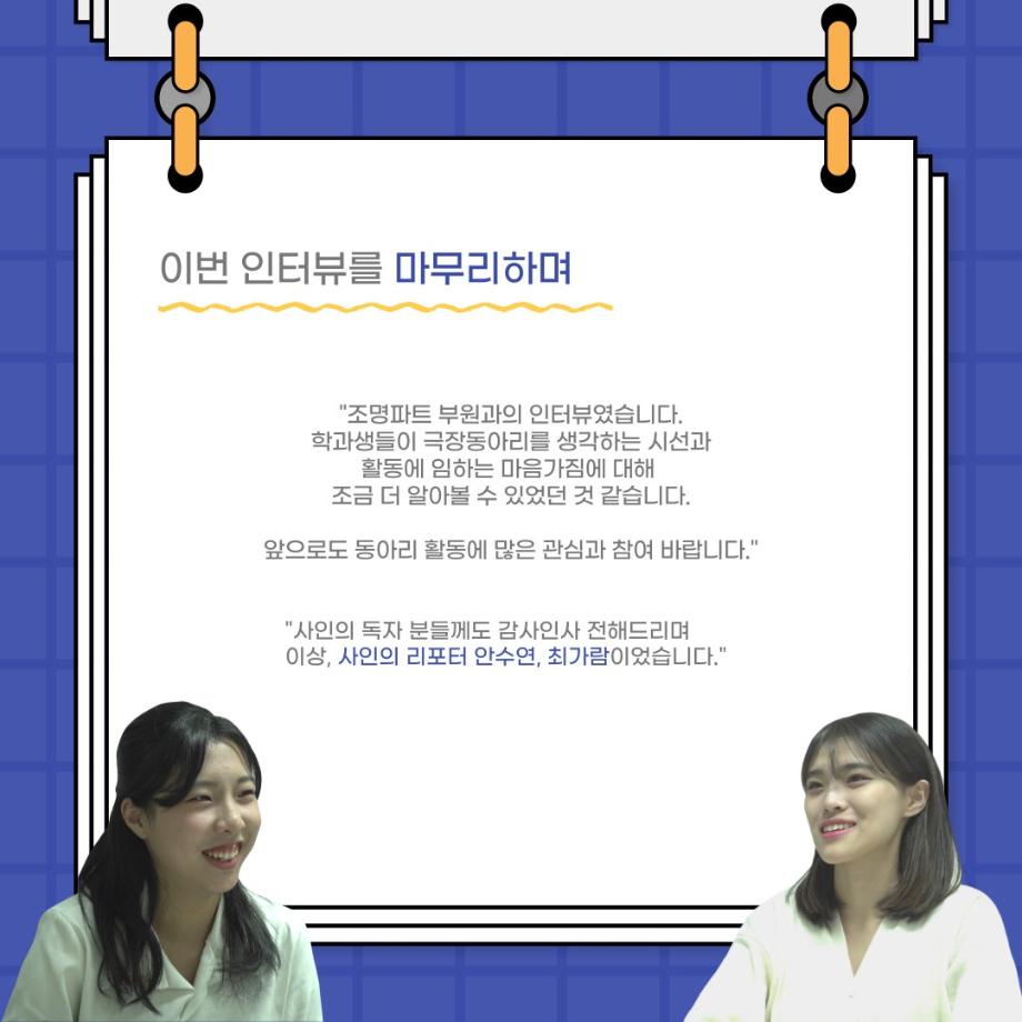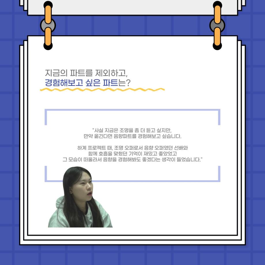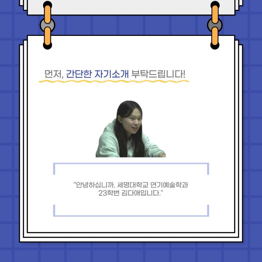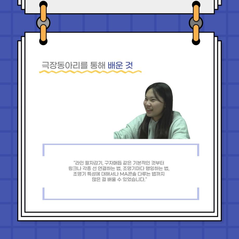 본문 시작 홈으로 커뮤니티 학과소개 입학정보 교수소개 학과과정 커뮤니티 공연예매 안내 홈페이지가이드 포토갤러리 공지사항 포토갤러리 작품DB 동아리 학사일정 학생회 포토갤러리 페이스북 트위터 프린트 사이와의 인터뷰 - 23년도 극장동아리 조명 파트 부원 ‘김다애' 연기예술학과 3819 2023-11-24 사이와의 인터뷰 - 23년도 극장동아리 조명 파트 부원 ‘김다애' 안녕하십니까. 23년도 학회 ‘사이’입니다. 학회 ‘사이’의 열두번째 인터뷰로 연기예술학과 23년도 극장동아리 조명 파트 부원인 김다애 학생과 인터뷰하는 시간을 가졌습니다. 이번 인터뷰에서는 조명파트를 선택한 이유, 극장동아리를 통해 배운 것, 동아리를 하면서 기억에 남는 활동이나 일화 등에 대해 인터뷰하였습니다. 목록 이전제100회 세명대학교 연기예술학과 정기공연 2학년 <중급연기 관찰발표회> 스틸컷 다음 교내 개인형 이동장치전동킥보드 등 이용 안전수칙 안내 담당부서 : 연기예술학과 담당자 : - 연락처 : 043-649-1733 최종수정일 : 2024-10-26 만족도조사 만족도 조사 이 페이지에서 제공하는 정보에 대하여 만족하시나요? 매우만족 만족 보통 불만족 매우불만족