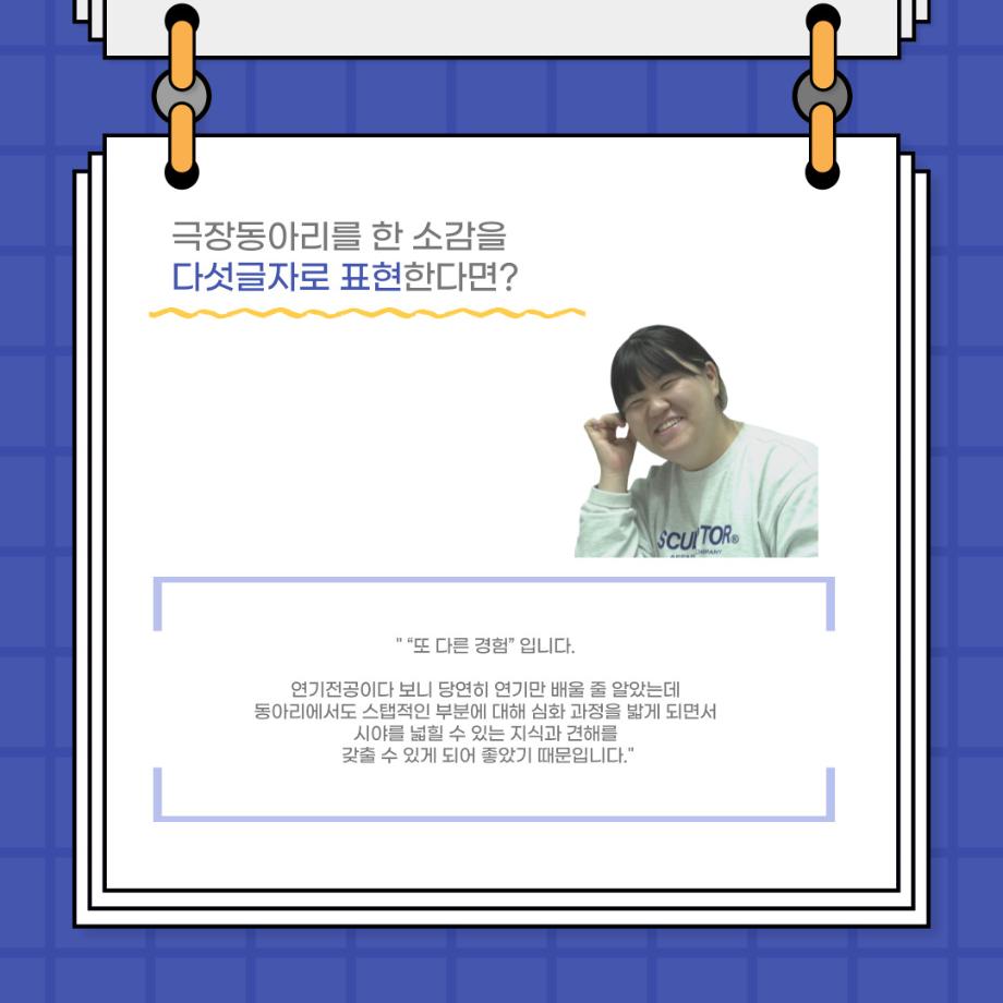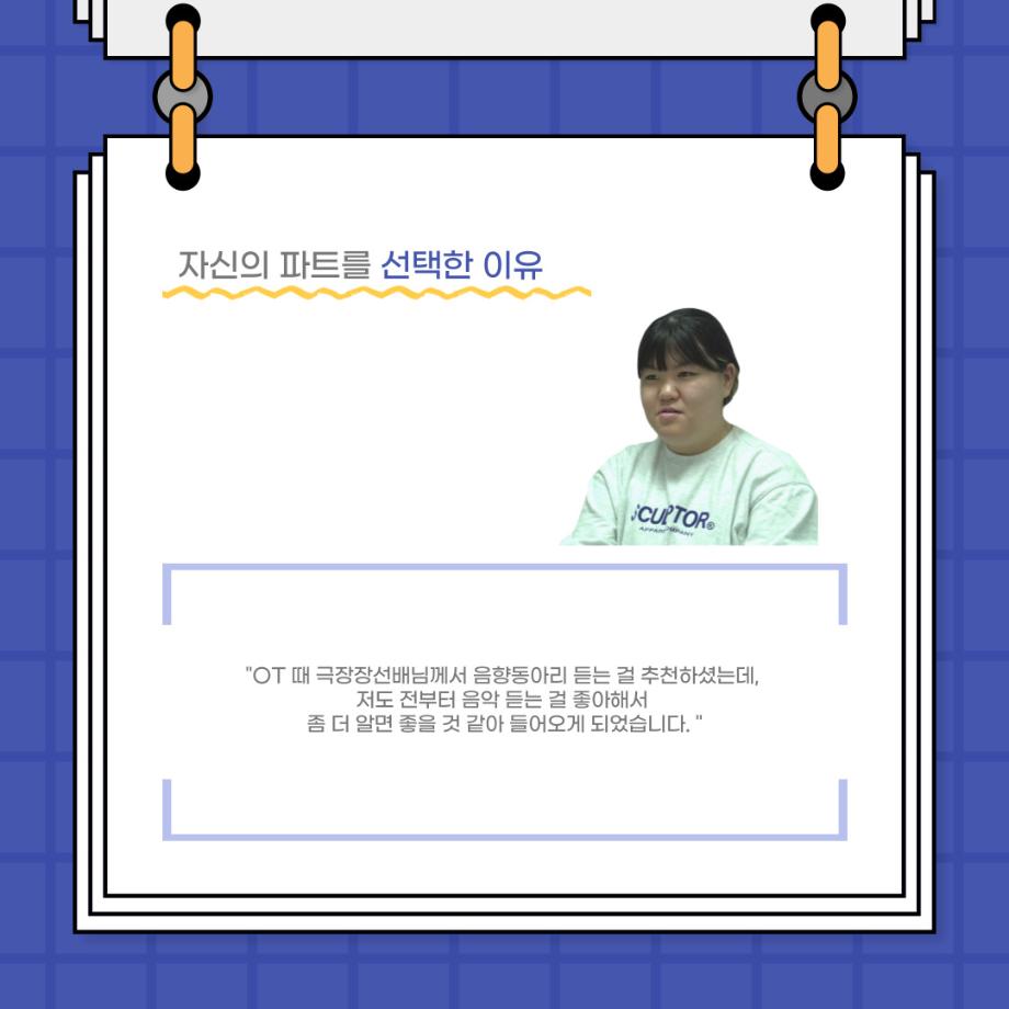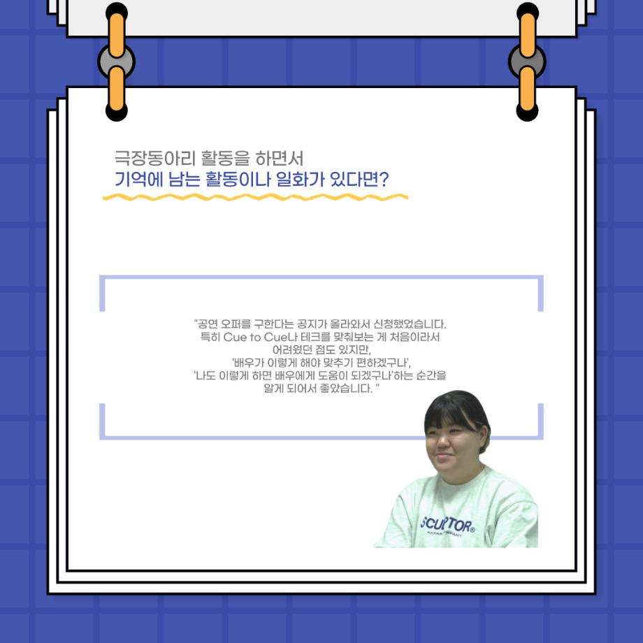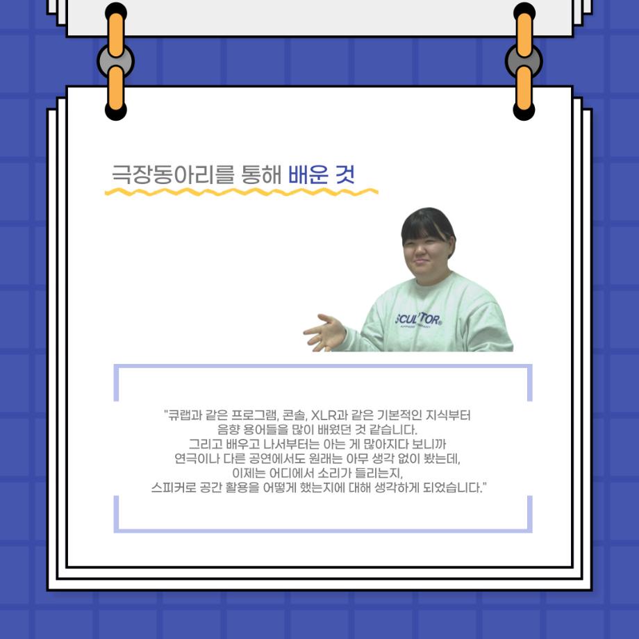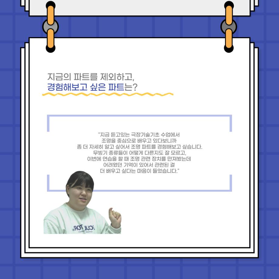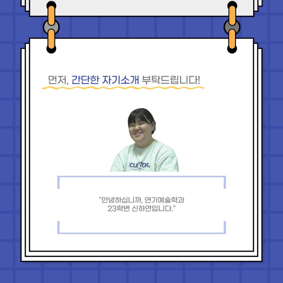 본문 시작 홈으로 커뮤니티 학과소개 입학정보 교수소개 학과과정 커뮤니티 공연예매 안내 홈페이지가이드 포토갤러리 공지사항 포토갤러리 작품DB 동아리 학사일정 학생회 포토갤러리 페이스북 트위터 프린트 사이와의 인터뷰 - 23년도 극장동아리 음향 파트 부원 ‘신하연' 연기예술학과 3182 2024-01-12 안녕하십니까. 23년도 학회 ‘사이’입니다. 학회 ‘사이’의 열네번째 인터뷰로 연기예술학과 23년도 극장동아리 음향 파트 부원인 신하연 학생과 인터뷰하는 시간을 가졌습니다. 이번 인터뷰에서는 음향파트를 선택한 이유, 극장동아리를 통해 배운 것, 동아리를 하면서 기억에 남는 활동이나 일화 등에 대해 인터뷰하였습니다. 다음 인터뷰 컨텐츠 ‘사인’도 많은 사랑 부탁드립니다. 목록 이전미래 인재를 위한 한방정밀의료 기초 교육 및 치료 체험 참가자 모집 다음 제102회 세명대학교 연기예술학과 정기공연 1학년 <에쮸드 발표회> 스틸컷 담당부서 : 연기예술학과 담당자 : - 연락처 : 043-649-1733 최종수정일 : 2024-10-26 만족도조사 만족도 조사 이 페이지에서 제공하는 정보에 대하여 만족하시나요? 매우만족 만족 보통 불만족 매우불만족