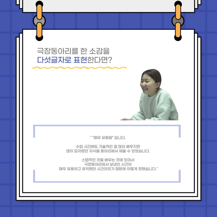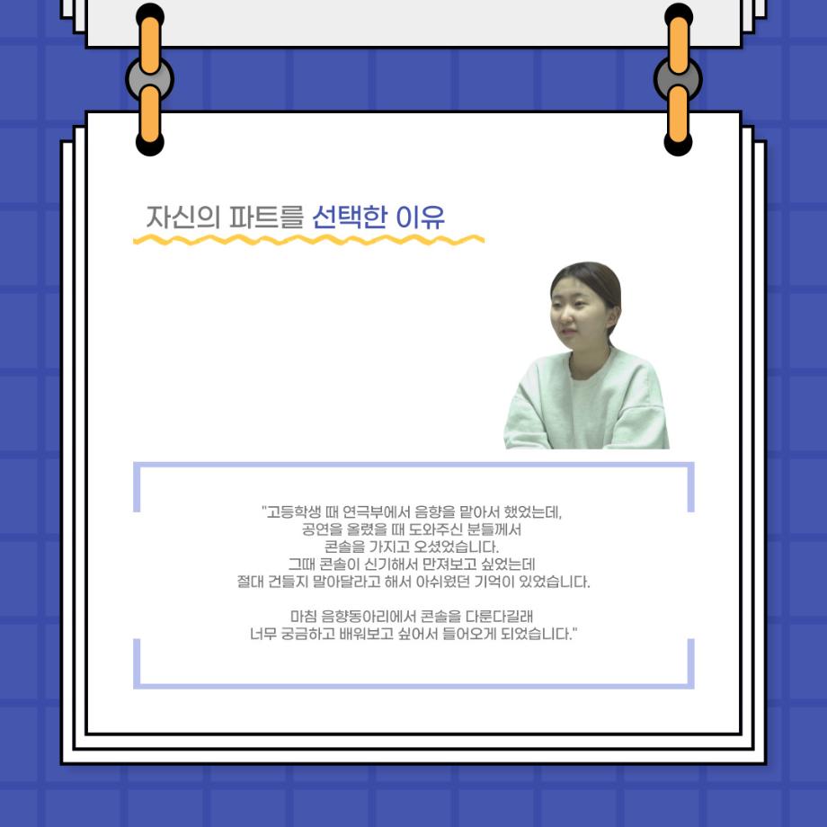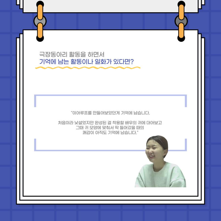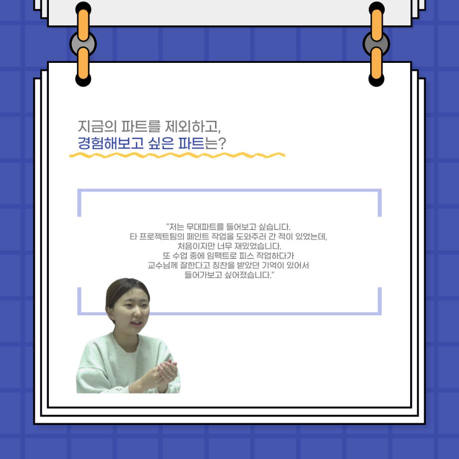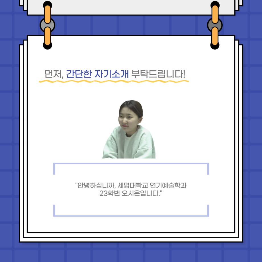 본문 시작 홈으로 커뮤니티 학과소개 입학정보 교수소개 학과과정 커뮤니티 공연예매 안내 홈페이지가이드 포토갤러리 공지사항 포토갤러리 작품DB 동아리 학사일정 학생회 포토갤러리 페이스북 트위터 프린트 사이와의 인터뷰 - 23년도 극장동아리 음향 파트 부원 ‘오시은‘ 연기예술학과 2825 2024-01-19 안녕하십니까. 23년도 학회 ‘사이’입니다. 학회 ‘사이’의 열다섯번째 인터뷰로 연기예술학과 23년도 극장동아리 음향 파트 부원인 오시은 학생과 인터뷰하는 시간을 가졌습니다. 이번 인터뷰에서는 음향파트를 선택한 이유, 극장동아리를 통해 배운 것, 동아리를 하면서 기억에 남는 활동이나 일화 등에 대해 인터뷰하였습니다. 다음 인터뷰 컨텐츠 ‘사인’도 많은 사랑 부탁드립니다. 목록 이전제102회 세명대학교 연기예술학과 정기공연 1학년 <에쮸드 발표회> 공연 성료 다음 찾아가는 충북 도립극단 설명회 담당부서 : 연기예술학과 담당자 : - 연락처 : 043-649-1733 최종수정일 : 2024-10-26 만족도조사 만족도 조사 이 페이지에서 제공하는 정보에 대하여 만족하시나요? 매우만족 만족 보통 불만족 매우불만족