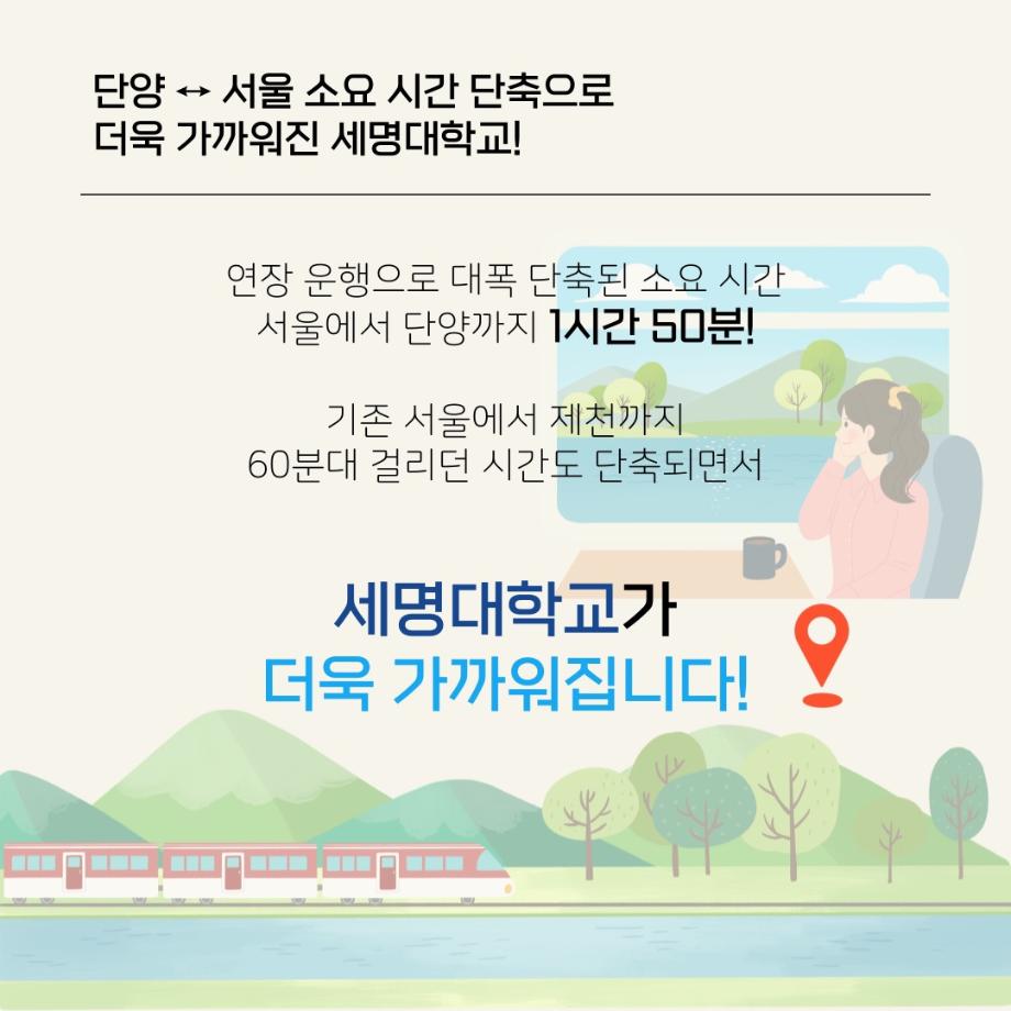 본문 시작 홈으로 커뮤니티 학과소개 입학정보 교수소개 학과과정 커뮤니티 공연예매 안내 홈페이지가이드 포토갤러리 공지사항 포토갤러리 작품DB 동아리 학사일정 학생회 포토갤러리 페이스북 트위터 프린트 더 가까워진 세명대학교 연기예술학과 2940 2024-01-29 지난 29일부터 제천, 단양을 지나는 중앙선 KTX가 서울역까지 연장 된다는 사실. 열차 또한 증차되고, 단양<->서울간 소요 시간도 단축되면서 세명대<->서울간 소요 시간도 단축됩니다. 편리한 통학과 함께 더욱 가까워진 재미있는 경험 가득한 세명대학교 로 오세요. 목록 이전세명대학교 연기예술학과 특강 [박건형 배우님] 다음 세명대학교 연기예술학과 특강 [최진영 배우님] 담당부서 : 연기예술학과 담당자 : - 연락처 : 043-649-1733 최종수정일 : 2024-10-26 만족도조사 만족도 조사 이 페이지에서 제공하는 정보에 대하여 만족하시나요? 매우만족 만족 보통 불만족 매우불만족