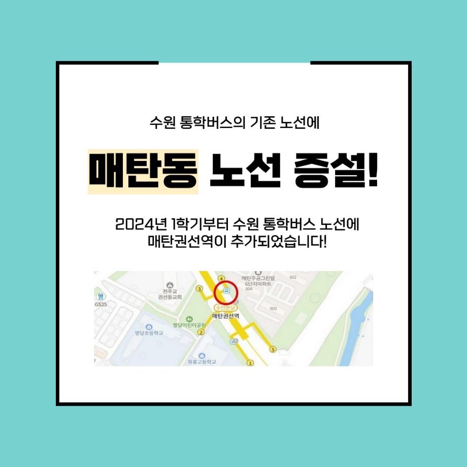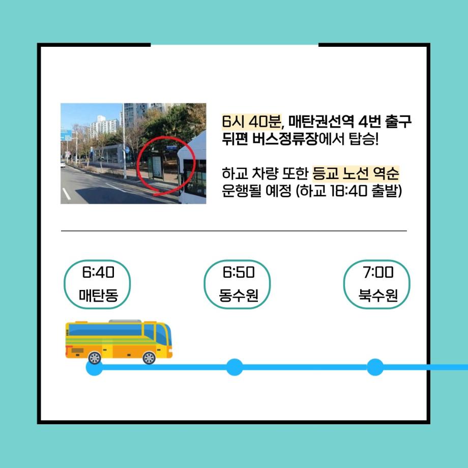 본문 시작 홈으로 커뮤니티 학과소개 입학정보 교수소개 학과과정 커뮤니티 공연예매 안내 홈페이지가이드 포토갤러리 공지사항 포토갤러리 작품DB 동아리 학사일정 학생회 포토갤러리 페이스북 트위터 프린트 세명대 통학버스, 경기 수원지역 노선 증설 연기예술학과 3288 2024-01-30 경기 수원지역 통학버스 노선에 매탄동 노선이 새롭게 증설되었습니다. 6시 40분, 매탄권선역 4번 출구 뒤편 버스정류장에서 탑승해 기존 노선(동수원, 북수원)을 지나 세명대학교까지 단숨에 하교 버스도 등고 버스 노선의 역순으로 운행된다는 사실. 더 편리해진 통학버스 타고 세명대학교로 등교하자. 목록 이전세명대학교 연기예술학과 특강 [최진영 배우님] 다음 세명대학교 연기예술학과 특강 [김낙형 연출가님] 담당부서 : 연기예술학과 담당자 : - 연락처 : 043-649-1733 최종수정일 : 2024-10-26 만족도조사 만족도 조사 이 페이지에서 제공하는 정보에 대하여 만족하시나요? 매우만족 만족 보통 불만족 매우불만족