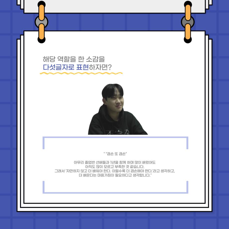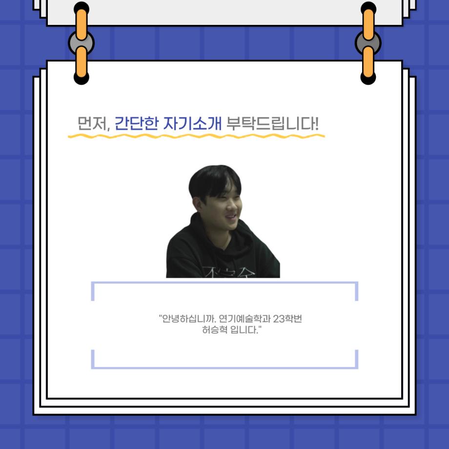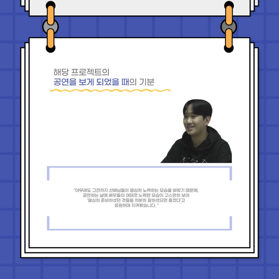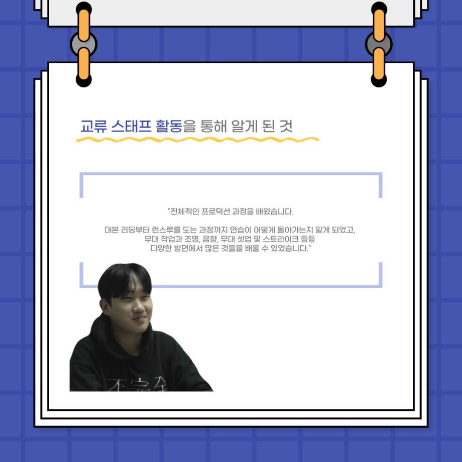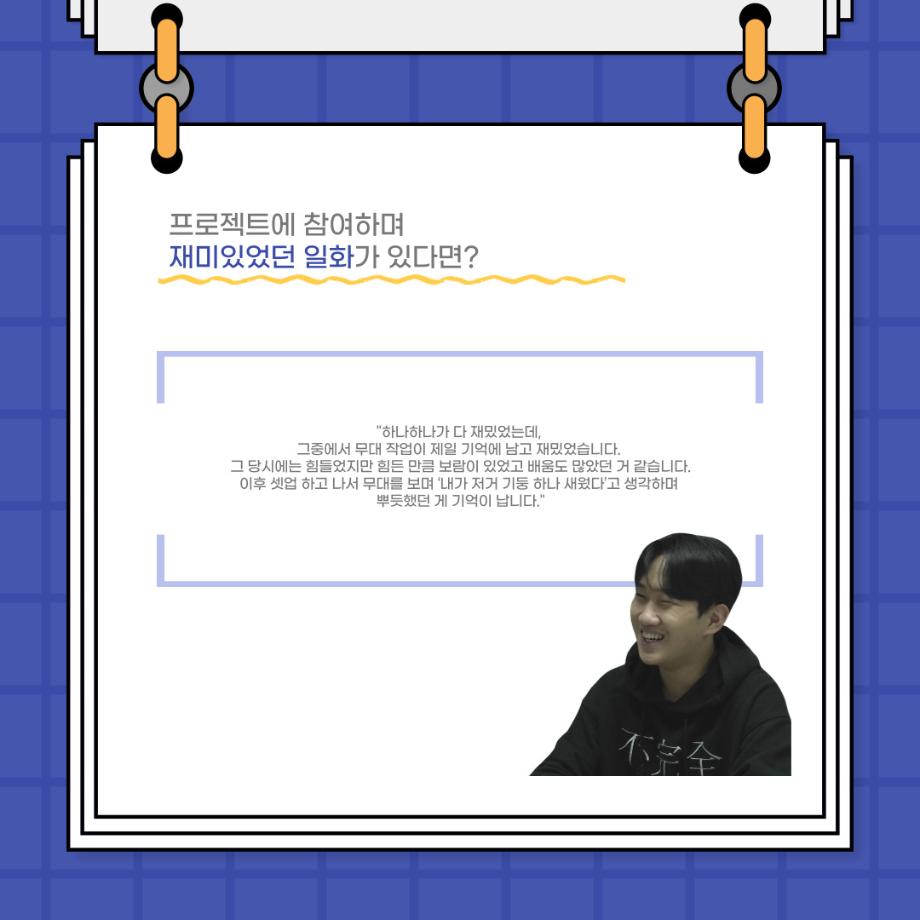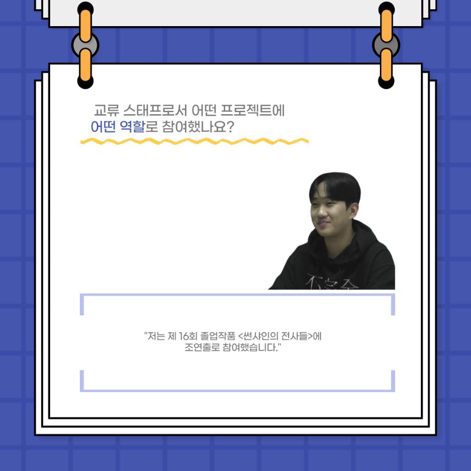 본문 시작 홈으로 커뮤니티 학과소개 입학정보 교수소개 학과과정 커뮤니티 공연예매 안내 홈페이지가이드 포토갤러리 공지사항 포토갤러리 작품DB 동아리 학사일정 학생회 포토갤러리 페이스북 트위터 프린트 사이와의 인터뷰 - 23년도 졸업작품 - 교류스탭 조연출 ‘허승혁’ 연기예술학과 3072 2024-02-12 안녕하십니까. 23년도 학회 ‘사이’입니다. 학회 ‘사이’의 스물세 번째 인터뷰로 연기예술학과 23년도 졸업작품 <썬샤인의 전사들>에서 교류 스탭으로 참여한 허승혁 학생과 인터뷰하는 시간을 가졌습니다. 이번 인터뷰에서는 졸업작품 <썬샤인의 전사들> 교류 스탭으로 참여하면서 알게 된 것, 재미있었던 일화, 공연 봤을 때의 기분 등에 대해 인터뷰하였습니다. 다음 인터뷰 컨텐츠 ‘사인’도 많은 사랑 부탁드립니다. 목록 이전2024학년도 세명대학교 합격자 등록 안내 다음 사이와의 인터뷰 - 23년도 졸업작품 - 교류스탭 분장팀장 ‘송현아’ 담당부서 : 연기예술학과 담당자 : - 연락처 : 043-649-1733 최종수정일 : 2024-10-26 만족도조사 만족도 조사 이 페이지에서 제공하는 정보에 대하여 만족하시나요? 매우만족 만족 보통 불만족 매우불만족