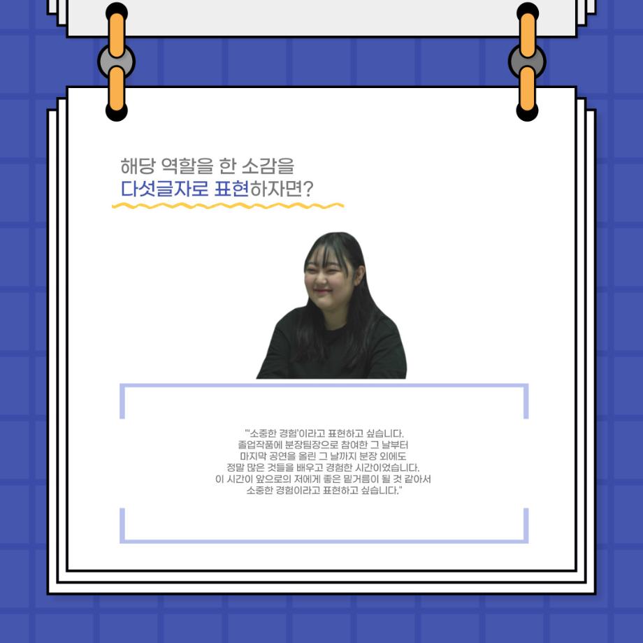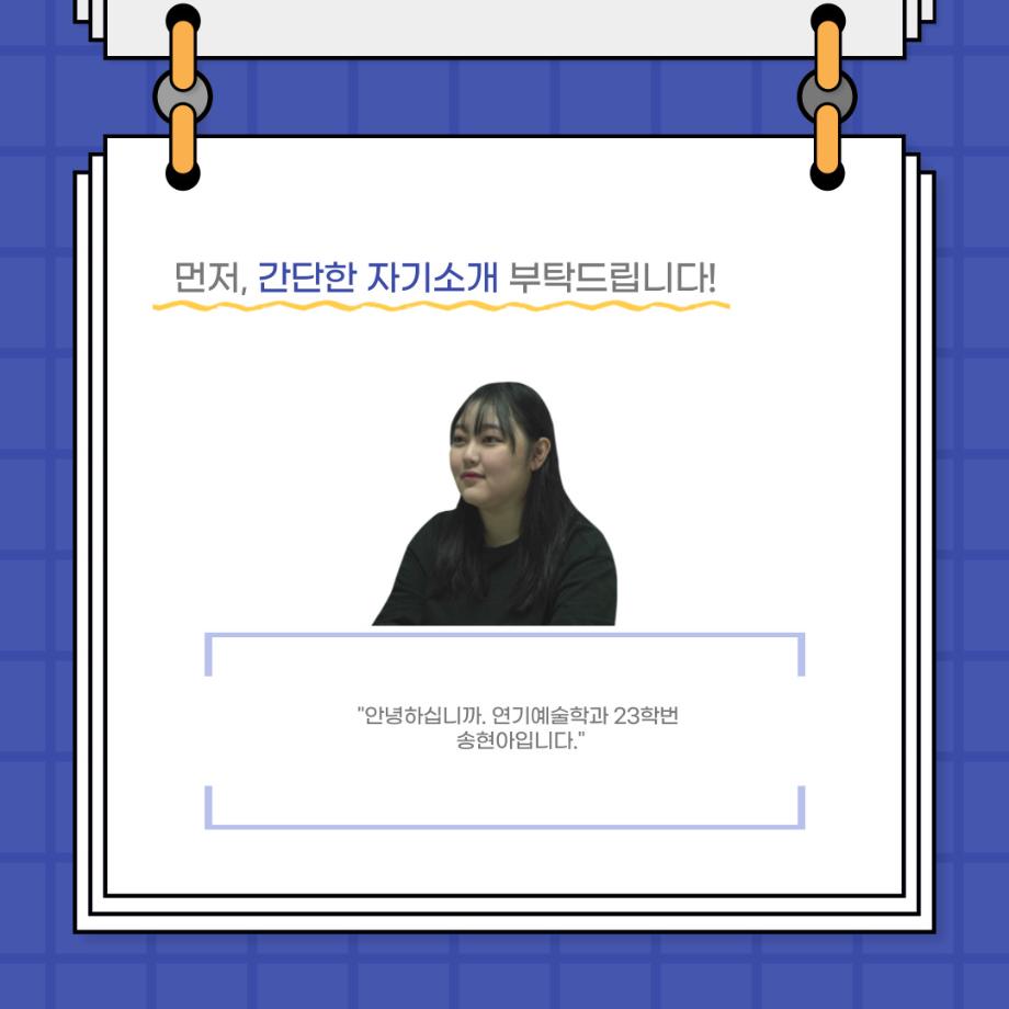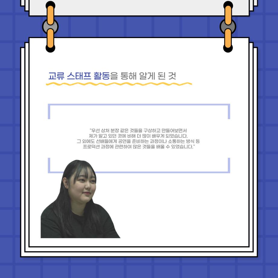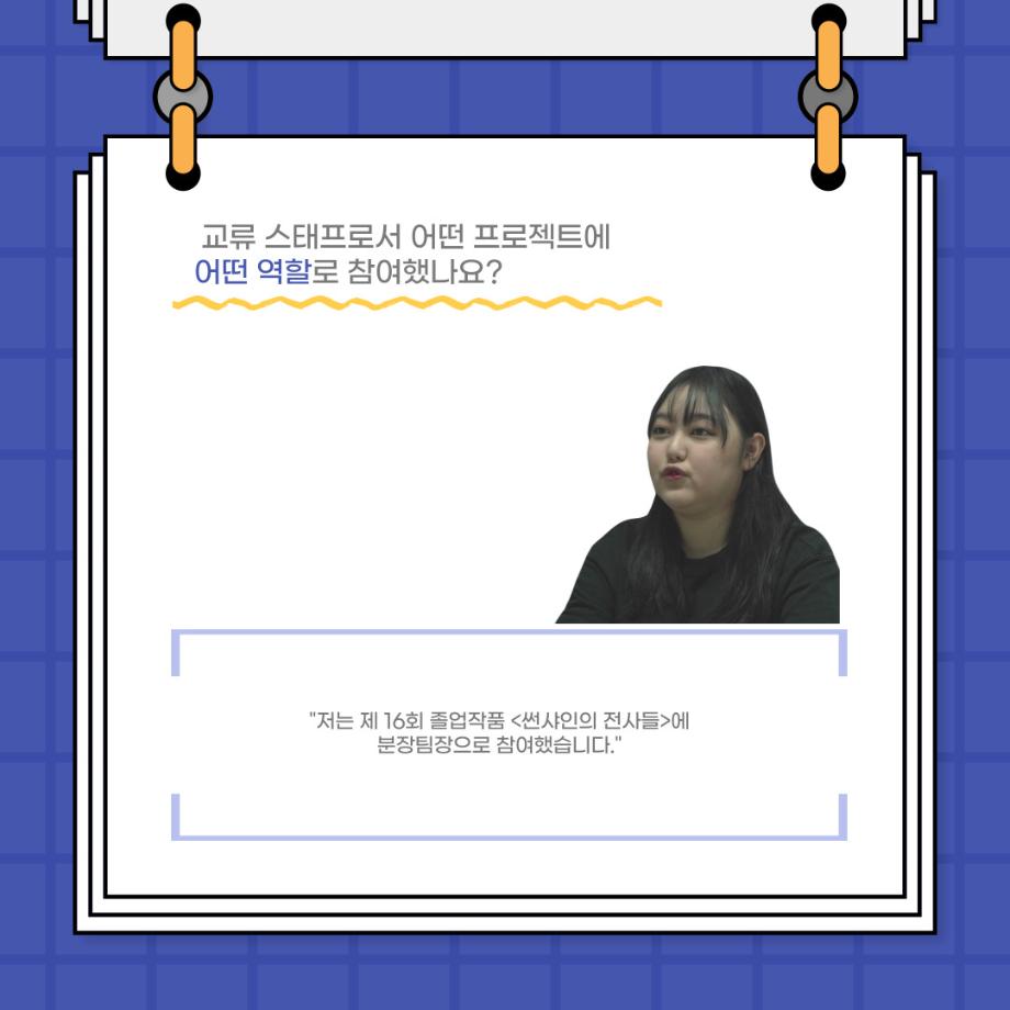본문 시작 홈으로 커뮤니티 학과소개 입학정보 교수소개 학과과정 커뮤니티 공연예매 안내 홈페이지가이드 포토갤러리 공지사항 포토갤러리 작품DB 동아리 학사일정 학생회 포토갤러리 페이스북 트위터 프린트 사이와의 인터뷰 - 23년도 졸업작품 - 교류스탭 분장팀장 ‘송현아’ 연기예술학과 3094 2024-02-12 안녕하십니까. 23년도 학회 ‘사이’입니다. 학회 ‘사이’의 스물네 번째 인터뷰로 연기예술학과 23년도 졸업작품 <썬샤인의 전사들>에서 교류 스탭으로 참여한 송현아 학생과 인터뷰하는 시간을 가졌습니다. 이번 인터뷰에서는 졸업작품 <썬샤인의 전사들> 교류 스탭으로 참여하면서 알게 된 것, 재미있었던 일화, 공연 봤을 때의 기분 등에 대해 인터뷰하였습니다. 다음 인터뷰 컨텐츠 ‘사인’도 많은 사랑 부탁드립니다. 목록 이전사이와의 인터뷰 - 23년도 졸업작품 - 교류스탭 조연출 ‘허승혁’ 다음 연기예술학과 103회 정기공연 동계 프로젝트 <올모스트 메인> 프로필 스틸컷 담당부서 : 연기예술학과 담당자 : - 연락처 : 043-649-1733 최종수정일 : 2024-10-26 만족도조사 만족도 조사 이 페이지에서 제공하는 정보에 대하여 만족하시나요? 매우만족 만족 보통 불만족 매우불만족
