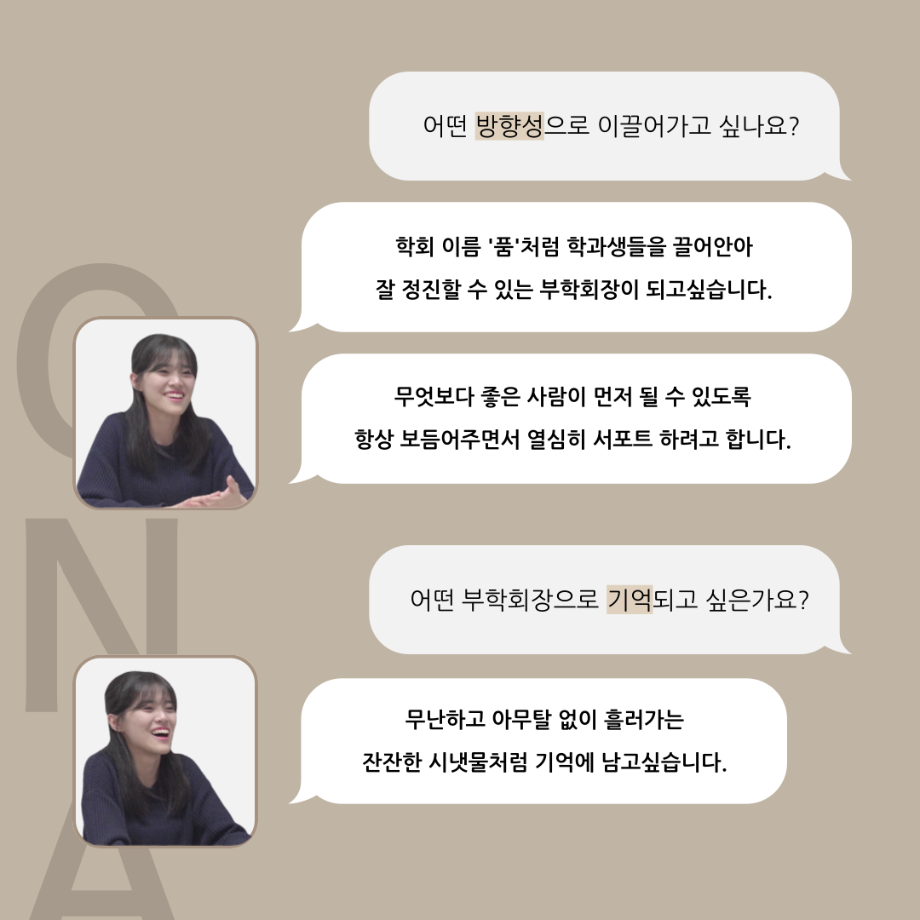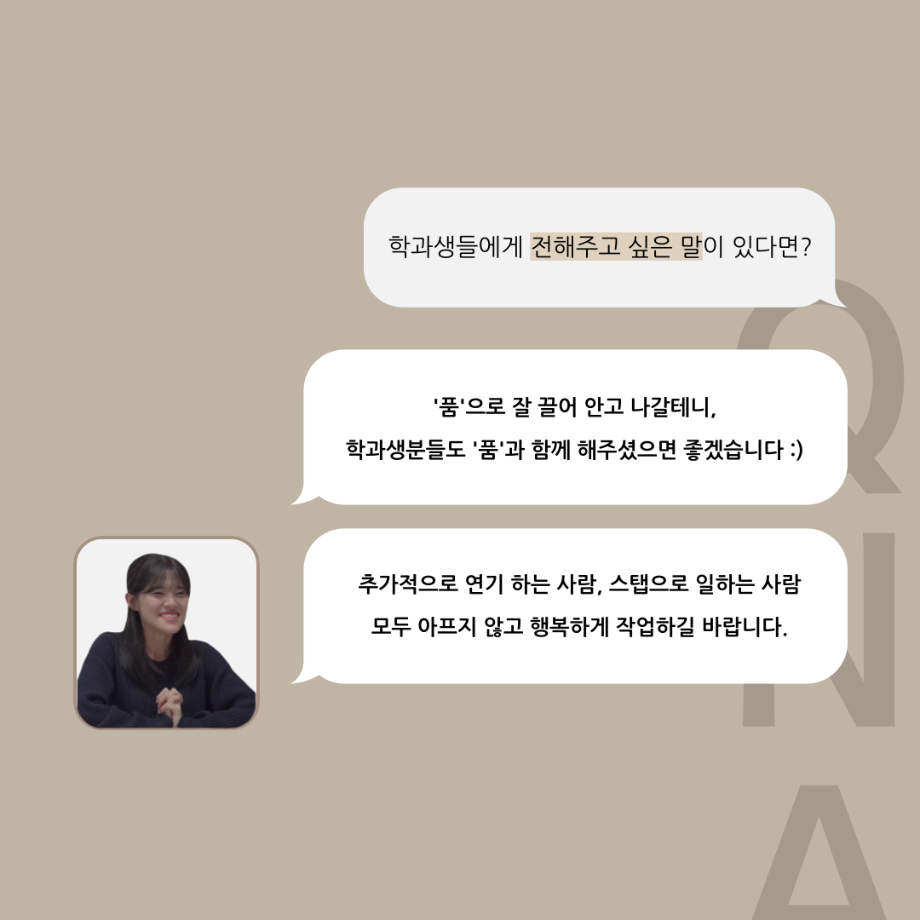 본문 시작 홈으로 커뮤니티 학과소개 입학정보 교수소개 학과과정 커뮤니티 공연예매 안내 홈페이지가이드 포토갤러리 공지사항 포토갤러리 작품DB 동아리 학사일정 학생회 포토갤러리 페이스북 트위터 프린트 '품'위있는 인'터뷰' - 24년도 부학회장 <최가람> 연기예술학과 3328 2024-07-10 안녕하십니까. 24년도 학회 ‘품‘ 입니다. 학회 ‘품’의 두 번째 인터뷰로 세명대학교 연기예술학과 24학년도 부학회장인 최가람 학우와 인터뷰 하는 시간을 가졌습니다. 부학회장으로서의 각오, 방향성 그리고 학과생에게 전하고 싶은 말과 학회에게 남기는 메세지 등을 질문하는 시간을 가졌습니다. 앞으로 있을 인터뷰 컨텐츠인 ‘품터뷰’ 많은 사랑 부탁드립니다. 목록 이전2024학년도 하계방학 진로, 취업 LMS 특강 다음 '품'위있는 인'터뷰' - 24년도 극장장 <이종화> 담당부서 : 연기예술학과 담당자 : - 연락처 : 043-649-1733 최종수정일 : 2024-10-26 만족도조사 만족도 조사 이 페이지에서 제공하는 정보에 대하여 만족하시나요? 매우만족 만족 보통 불만족 매우불만족