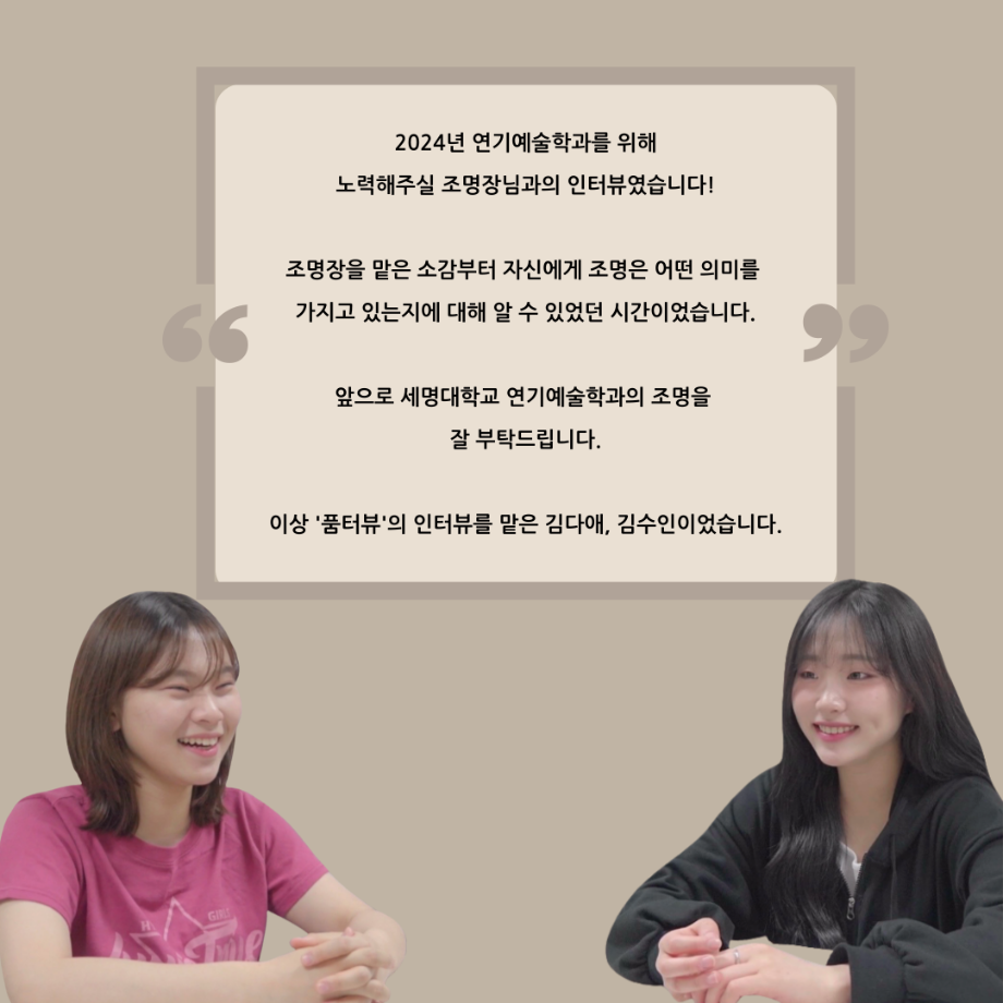 본문 시작 홈으로 커뮤니티 학과소개 입학정보 교수소개 학과과정 커뮤니티 공연예매 안내 홈페이지가이드 포토갤러리 공지사항 포토갤러리 작품DB 동아리 학사일정 학생회 포토갤러리 페이스북 트위터 프린트 '품'위있는 인'터뷰' - 24년도 조명장 <오승아> 연기예술학과 3244 2024-07-22 안녕하십니까. 24년도 학회 ‘품‘ 입니다. 학회 ‘품’의 다섯 번째 인터뷰로 세명대학교 연기예술학과 24학년도 조명장인 오승아 학우와 인터뷰 하는 시간을 가졌습니다. 조명장을 맡게된 소감과 조명은 어떤 의미가 있는지, 조명에서 조심히 해야하는 것은 무엇이며 극장장과 학과생에게 전하고 싶은 말 등을 질문하는 시간을 가졌습니다. 앞으로 있을 인터뷰 컨텐츠인 ‘품터뷰’ 많은 사랑 부탁드립니다. 목록 이전오픈소스 SW 라이선스 교육 안내 다음 장애청년 채용 취업 정보 안내 7월 2차 담당부서 : 연기예술학과 담당자 : - 연락처 : 043-649-1733 최종수정일 : 2024-10-26 만족도조사 만족도 조사 이 페이지에서 제공하는 정보에 대하여 만족하시나요? 매우만족 만족 보통 불만족 매우불만족
