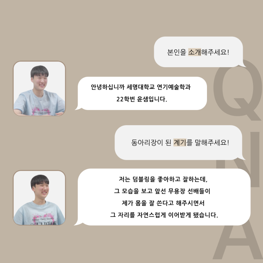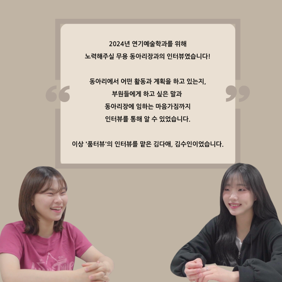 본문 시작 홈으로 커뮤니티 학과소개 입학정보 교수소개 학과과정 커뮤니티 공연예매 안내 홈페이지가이드 포토갤러리 공지사항 포토갤러리 작품DB 동아리 학사일정 학생회 포토갤러리 페이스북 트위터 프린트 '품'위있는 인'터뷰' - 24년도 무용동아리장 <윤샘> 연기예술학과 3309 2024-07-29 안녕하십니까. 24년도 학회 '품' 입니다. 학회 '품'의 일곱 번째 인터뷰로 세명대학교 연기예술학과 24학년도 무용동아리장인 윤샘 학우와 인터뷰 하는 시간을 가졌습니다. 무용 동아리장이 된 계기와 동아리에서는 어떤 활동을 하고있는지, 앞으로의 계획은 무엇으며 동아리 부원들에게 전하고 싶은 말 등을 질문하는 시간을 가졌습니다. 앞으로 있을 인터뷰 컨텐츠인 '품터뷰' 많은 사랑 부탁드립니다. 목록 이전2024학년도 2학기 학기제 창업대체학점제 참가자 모집안내 다음 2024년 굿네이버스 친환경 실천 캠페인 '그린이쥬' 모집 담당부서 : 연기예술학과 담당자 : - 연락처 : 043-649-1733 최종수정일 : 2024-10-26 만족도조사 만족도 조사 이 페이지에서 제공하는 정보에 대하여 만족하시나요? 매우만족 만족 보통 불만족 매우불만족