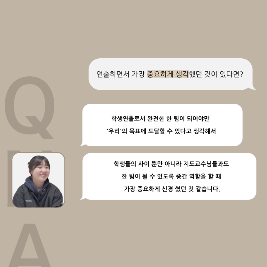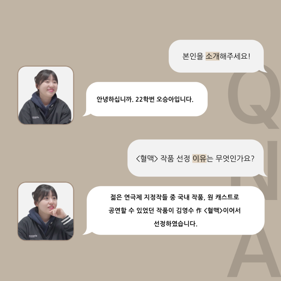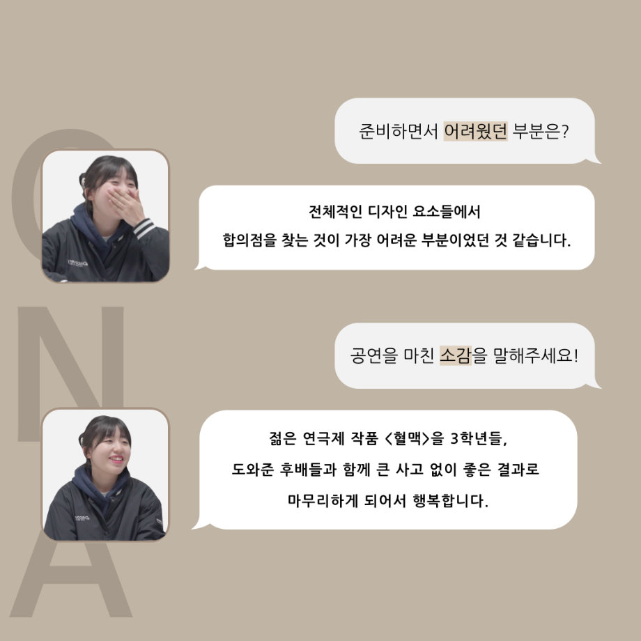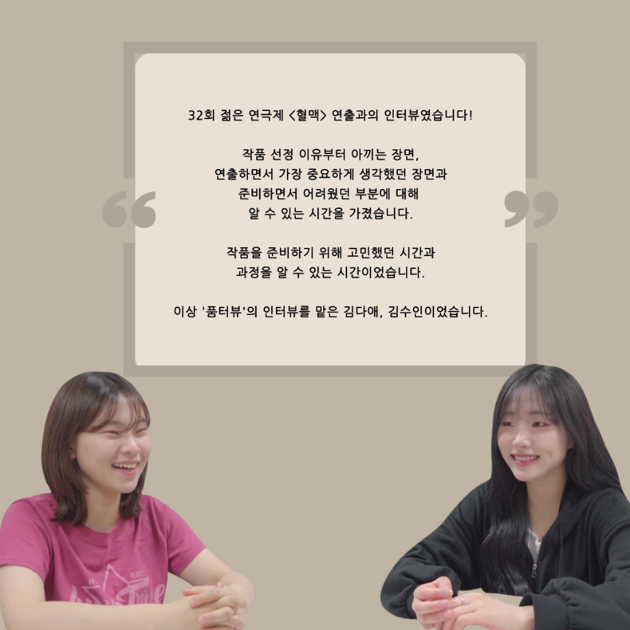 본문 시작 홈으로 커뮤니티 학과소개 입학정보 교수소개 학과과정 커뮤니티 공연예매 안내 홈페이지가이드 포토갤러리 공지사항 포토갤러리 작품DB 동아리 학사일정 학생회 포토갤러리 페이스북 트위터 프린트 '품'위있는 인'터뷰' - 24년도 젊은연극제 학생 연출 <오승아> 연기예술학과 3284 2024-08-07 안녕하십니까. 24년도 학회 ‘품’ 입니다. 학회 ‘품’의 열번째 인터뷰로 세명대학교 연기예술학과 24학년도 젊은연극제 참가작 <혈맥>의 학생 연출 오승아 학우와 인터뷰 하는 시간을 가졌습니다. 작품 선정 이유부터 아끼는 장면, 연출하면서 가장 중요하게 생각했던 장면과 작품을 준비하면서 어려웠던 부분에 대해 알 수 있는 시간을 가졌습니다. 앞으로 있을 인터뷰 컨텐츠인 ‘품터뷰’ 많은 사랑 부탁드립니다. 목록 다음 2024학년도 진로플러스업 캠프 참여자 모집 다음 ‘품’위있는 인‘터뷰’ - 24년도 젊은연극제 원팔役 <박성민> 담당부서 : 연기예술학과 담당자 : - 연락처 : 043-649-1733 최종수정일 : 2024-10-26 만족도조사 만족도 조사 이 페이지에서 제공하는 정보에 대하여 만족하시나요? 매우만족 만족 보통 불만족 매우불만족