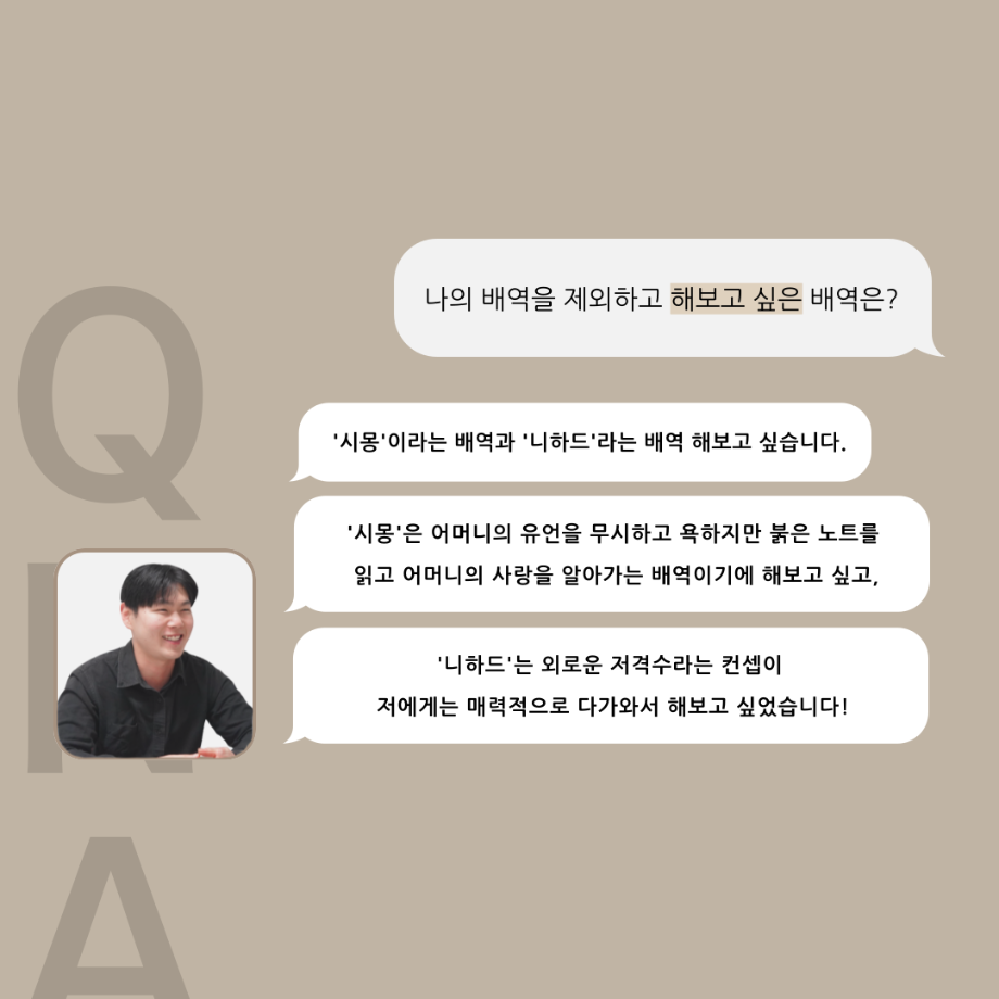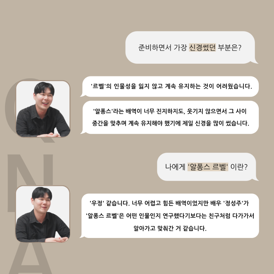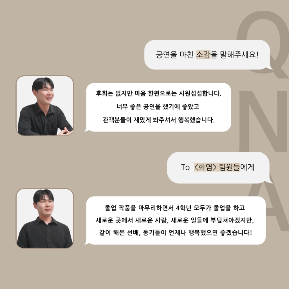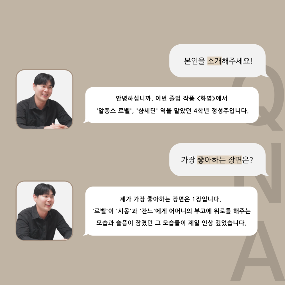 본문 시작 홈으로 커뮤니티 학과소개 입학정보 교수소개 학과과정 커뮤니티 공연예매 안내 홈페이지가이드 포토갤러리 공지사항 포토갤러리 작품DB 동아리 학사일정 학생회 포토갤러리 페이스북 트위터 프린트 ‘품’위있는 인‘터뷰’ - 24년도 졸업작품 르벨 役 <정성주> 연기예술학과 3365 2024-12-20 안녕하십니까. 24년도 학회 ‘품’ 입니다. 학회 ‘품’의 열 여덟 번째 인터뷰로 세명대학교 연기예술학과 제 17회 졸업작품 <화염>의 르벨 역인 정성주 학우와 인터뷰 하는 시간을 가졌습니다. 가장 좋아하는 장면, 자신의 배역을 제외하고 해보고 싶은 배역 그리고 준비하면서 어려웠던 부분과 공연을 마친 소감 등에 대해 인터뷰 하는 시간을 가졌습니다. 앞으로 있을 인터뷰 컨텐츠인 ‘품터뷰’ 많은 사랑 부탁드립니다. 목록 이전‘품’위있는 인‘터뷰’ - 24년도 졸업작품 어린나왈 役 <이윤지> 다음 ‘품’위있는 인‘터뷰’ - 24년도 졸업작품 잔느 役 <최희진> 담당부서 : 연기예술학과 담당자 : - 연락처 : 043-649-1733 최종수정일 : 2024-10-26 만족도조사 만족도 조사 이 페이지에서 제공하는 정보에 대하여 만족하시나요? 매우만족 만족 보통 불만족 매우불만족
