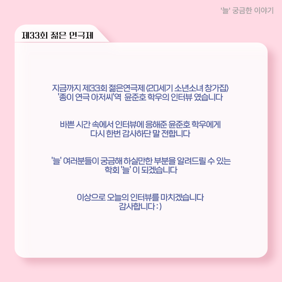본문 시작 홈으로 커뮤니티 학과소개 입학정보 교수소개 학과과정 커뮤니티 공연예매 안내 홈페이지가이드 포토갤러리 공지사항 포토갤러리 작품DB 동아리 학사일정 학생회 포토갤러리 페이스북 트위터 프린트 ‘늘‘ 궁금한 이야기 - 젊은연극제 ‘20세기 소년소녀 창가집’ 종이연극 아저씨 役 < 윤준호 > 연기예술학과 1405 2025-08-28 . 목록 이전‘늘‘ 궁금한 이야기 - 젊은연극제 ‘20세기 소년소녀 창가집’ 사이토 役 < 박신현 > 다음 ‘늘‘ 궁금한 이야기 - 젊은연극제 ‘20세기 소년소녀 창가집’ 다큐pd 役 < 임재완 > 담당부서 : 연기예술학과 담당자 : - 연락처 : 043-649-1733 최종수정일 : 2024-10-26 만족도조사 만족도 조사 이 페이지에서 제공하는 정보에 대하여 만족하시나요? 매우만족 만족 보통 불만족 매우불만족