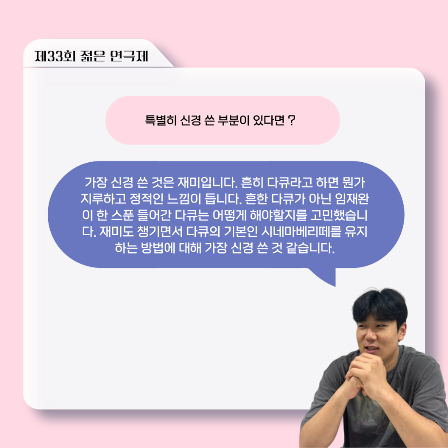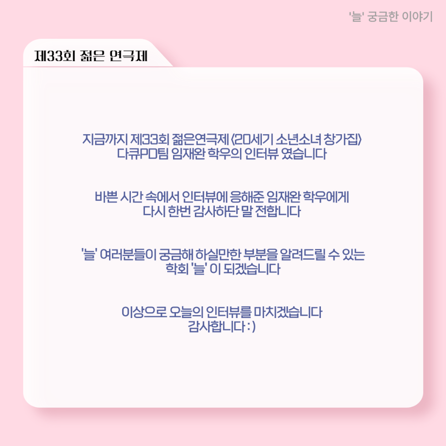 본문 시작 홈으로 커뮤니티 학과소개 입학정보 교수소개 학과과정 커뮤니티 공연예매 안내 홈페이지가이드 포토갤러리 공지사항 포토갤러리 작품DB 동아리 학사일정 학생회 포토갤러리 페이스북 트위터 프린트 ‘늘‘ 궁금한 이야기 - 젊은연극제 ‘20세기 소년소녀 창가집’ 다큐pd 役 < 임재완 > 연기예술학과 1096 2025-09-12 . 목록 이전‘늘‘ 궁금한 이야기 - 젊은연극제 ‘20세기 소년소녀 창가집’ 종이연극 아저씨 役 < 윤준호 > 다음 ‘늘‘ 궁금한 이야기 - 현장실습 < 이종서 > 담당부서 : 연기예술학과 담당자 : - 연락처 : 043-649-1733 최종수정일 : 2024-10-26 만족도조사 만족도 조사 이 페이지에서 제공하는 정보에 대하여 만족하시나요? 매우만족 만족 보통 불만족 매우불만족