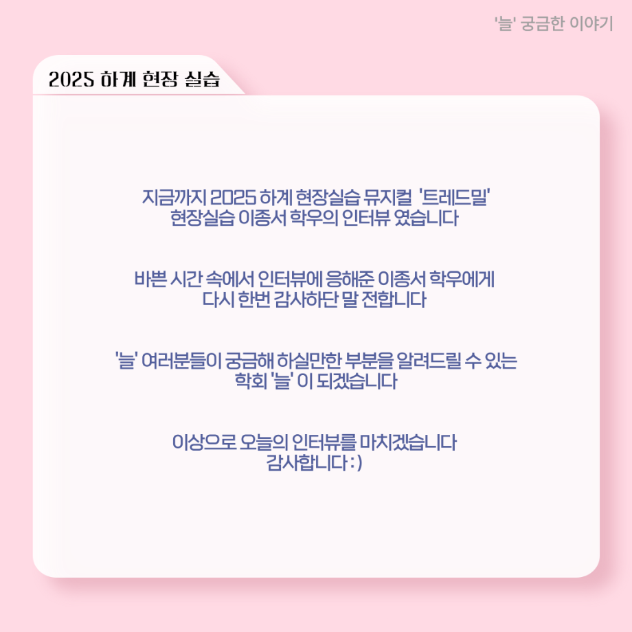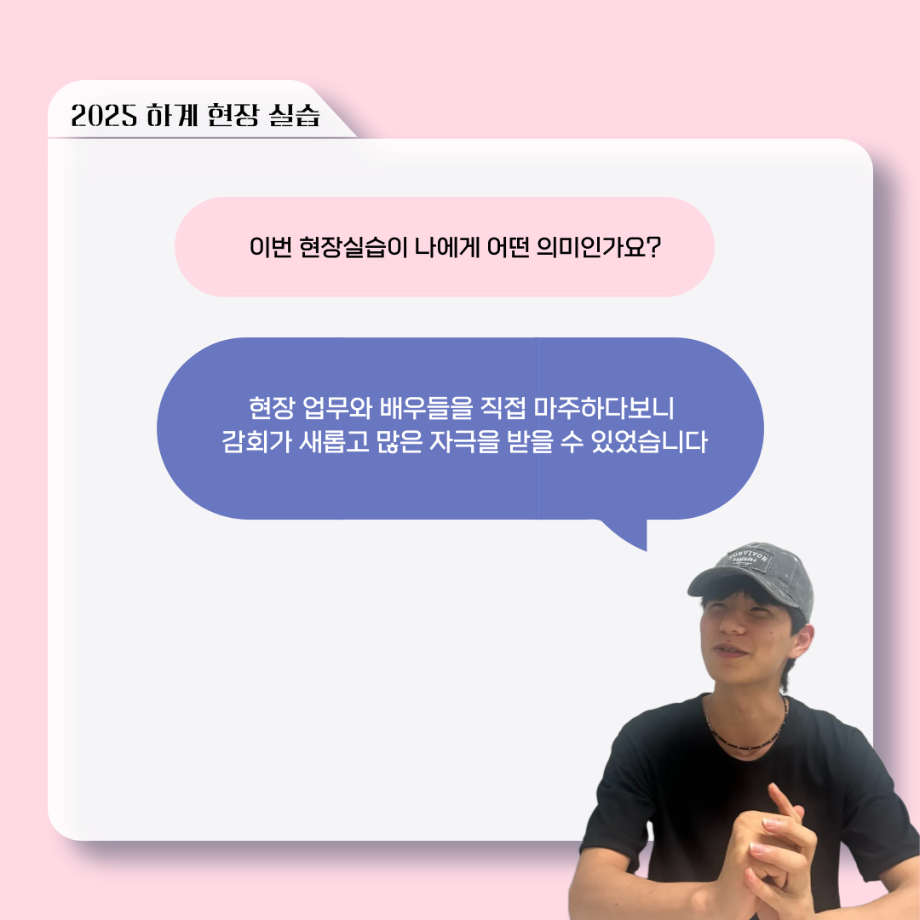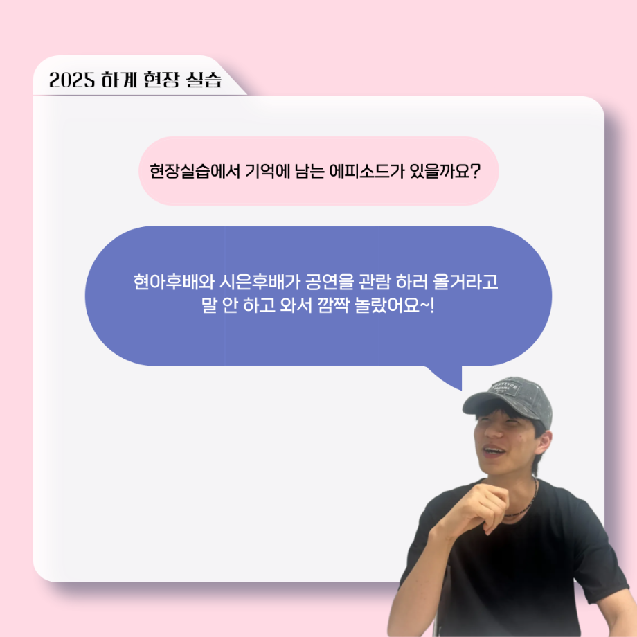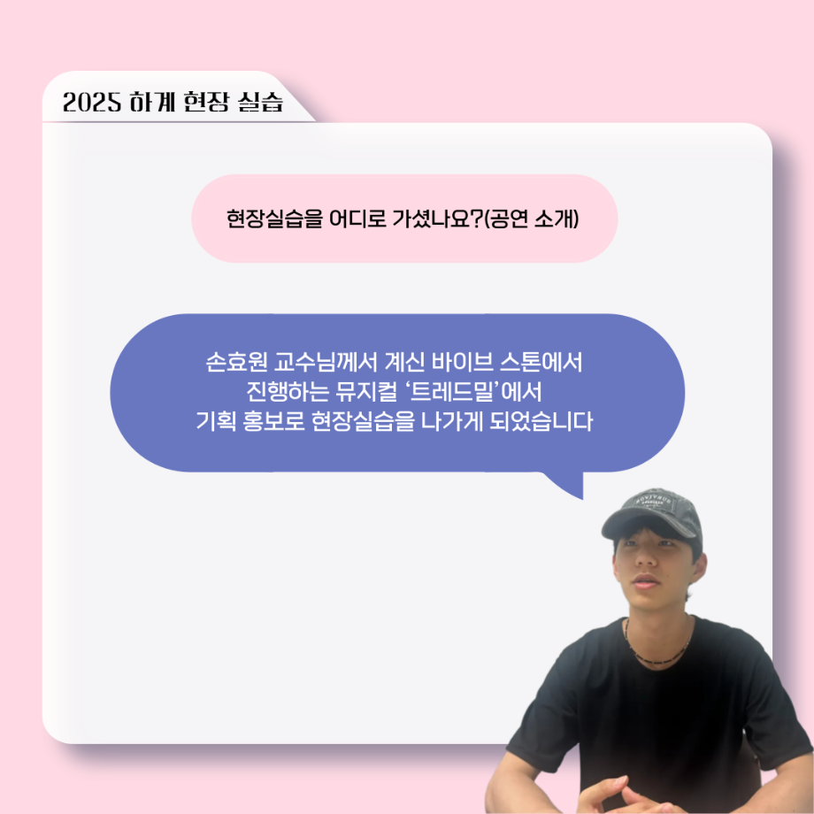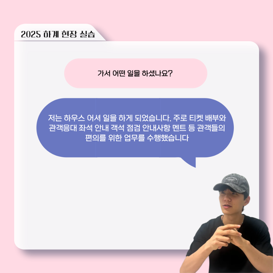 본문 시작 홈으로 커뮤니티 학과소개 입학정보 교수소개 학과과정 커뮤니티 공연예매 안내 홈페이지가이드 포토갤러리 공지사항 포토갤러리 작품DB 동아리 학사일정 학생회 포토갤러리 페이스북 트위터 프린트 ‘늘‘ 궁금한 이야기 - 현장실습 < 이종서 > 연기예술학과 1369 2025-09-17 . 목록 이전‘늘‘ 궁금한 이야기 - 젊은연극제 ‘20세기 소년소녀 창가집’ 다큐pd 役 < 임재완 > 이전117회 세명대학교 연기예술학과 하계프로젝트 사랑의온도 작품소개 담당부서 : 연기예술학과 담당자 : - 연락처 : 043-649-1733 최종수정일 : 2024-10-26 만족도조사 만족도 조사 이 페이지에서 제공하는 정보에 대하여 만족하시나요? 매우만족 만족 보통 불만족 매우불만족