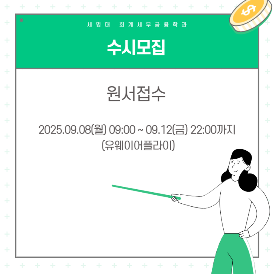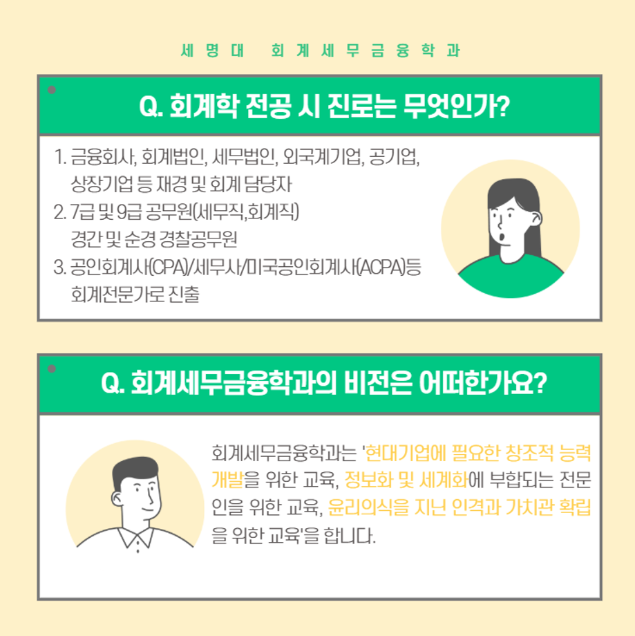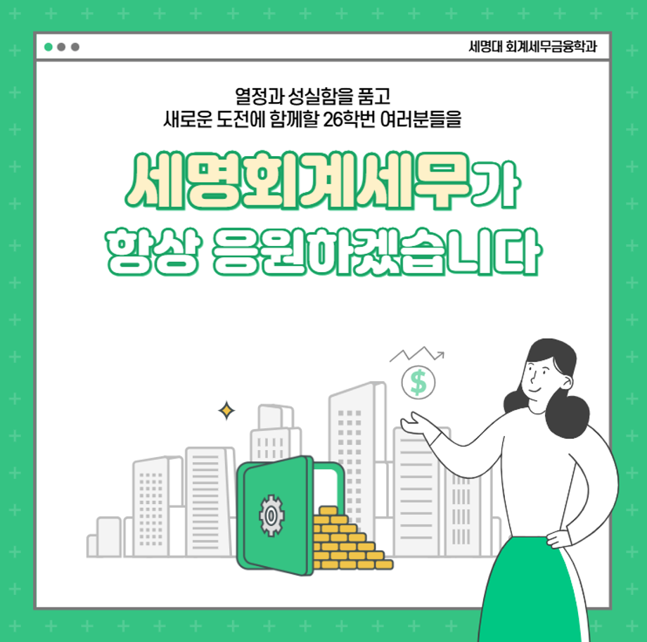 본문 시작 홈으로 학과소식 학과소개 취업정보 교육과정 학과소식 홈페이지가이드 포토갤러리 공지사항 포토갤러리 학과이야기 학과행사 포토갤러리 페이스북 트위터 프린트 💙2026학년도 회계세무금융학과 신입생모집 카드뉴스💙 회계세무금융학과 593 2025-09-09 2026학년도 회계세무금융학과 신입생모집 카드뉴스 목록 이전9월 학사일정 다음 💙세명대 회계세무금융학과 진로 로드맵💙 담당부서 : 회계세무학과 담당자 : - 연락처 : 043-649-1244 최종수정일 : 2024-10-26 만족도조사 만족도 조사 이 페이지에서 제공하는 정보에 대하여 만족하시나요? 매우만족 만족 보통 불만족 매우불만족