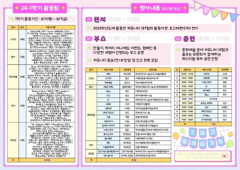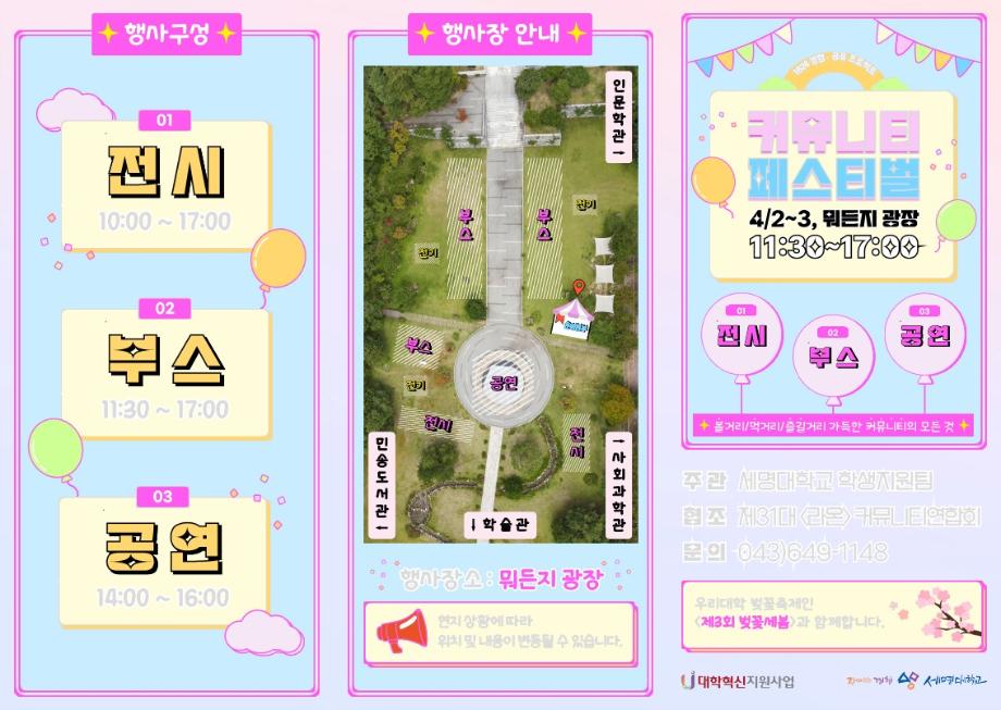 본문 시작 홈으로 학과소식 학과소개 취업정보 교육과정 학과소식 홈페이지가이드 포토갤러리 공지사항 포토갤러리 학과이야기 학과행사 포토갤러리 페이스북 트위터 프린트 제9회 커뮤니티 페스티벌 회계세무학과 1513 2024-03-29 1824 경험 · 공유 프로젝트, 제9회 커뮤니티 페스티벌! 💙 4월 2일(화) ~ 3일(수) 💙 11시30분부터 17시까지 💙 뭐든지 광장에서! 1824 커뮤니티 197팀의 ✨활동 사항 포스터 전시 감상✨과 20팀의 ✨부스를 체험✨하고 문화예술분야 커뮤니티 10팀과 춤추는 위원회의 ✨페스티벌 축하 공연✨까지 모두 함께 즐기자!😎😎 제9회 커뮤니티 페스티벌은 제3회 벚꽃세봄 축제와 함께 진행됩니다🌸✨ 목록 이전「제2회 레드로드 국제 스트리트 댄스 페스티벌」 안내 다음 🌸 제3회 벚꽃세봄 🌸 담당부서 : 회계세무학과 담당자 : - 연락처 : 043-649-1244 최종수정일 : 2024-10-26 만족도조사 만족도 조사 이 페이지에서 제공하는 정보에 대하여 만족하시나요? 매우만족 만족 보통 불만족 매우불만족