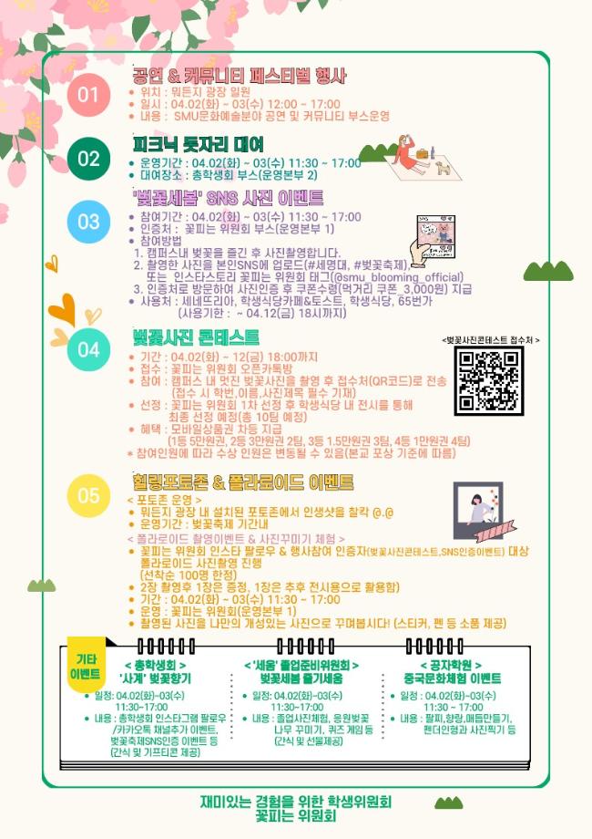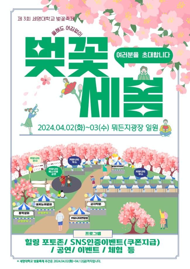 본문 시작 홈으로 학과소식 학과소개 취업정보 교육과정 학과소식 홈페이지가이드 포토갤러리 공지사항 포토갤러리 학과이야기 학과행사 포토갤러리 페이스북 트위터 프린트 🌸 제3회 벚꽃세봄 🌸 회계세무학과 1769 2024-03-29 🌸 올해도 어김없이, 제3회 벚꽃세봄 🌸 제3회 세명대학교 벚꽃축제, 벚꽃세봄에 여러분을 초대합니다! 힐링 포토존, SNS 인증 이벤트, 공연 등 다양한 프로그램과 함께 세명대학교의 벚꽃을 즐겨요🥰 💌 일자: 4월 2일(화) ~ 3일(수) 💌 장소: 뭐든지광장 일원 목록 이전제9회 커뮤니티 페스티벌 다음 [Book 콘서트] '김선태 (충TV)' Book 콘서트에 초대합니다. 담당부서 : 회계세무학과 담당자 : - 연락처 : 043-649-1244 최종수정일 : 2024-10-26 만족도조사 만족도 조사 이 페이지에서 제공하는 정보에 대하여 만족하시나요? 매우만족 만족 보통 불만족 매우불만족