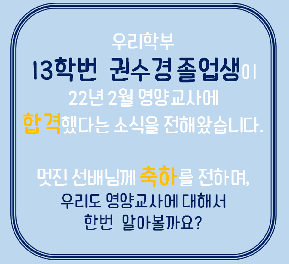 본문 시작 홈으로 커뮤니티 학부소개 진로·취업 교육과정 커뮤니티 대학원 입학상담 홈페이지가이드 갤러리 공지사항 갤러리 학생회 동문회 전공자료실 전공동아리 Youtube Instagram 갤러리 페이스북 트위터 프린트 13학번 권수경 영양교사 합격 바이오식품영양학부 2201 2022-05-23 13학번 권수경 졸업생 영양교사 합격 목록 이전2022 새내기 두드림 다음 2022 식품관련 뉴스 담당부서 : 바이오식품영양학부 담당자 : - 연락처 : 043-649-1430 최종수정일 : 2024-10-26 만족도조사 만족도 조사 이 페이지에서 제공하는 정보에 대하여 만족하시나요? 매우만족 만족 보통 불만족 매우불만족