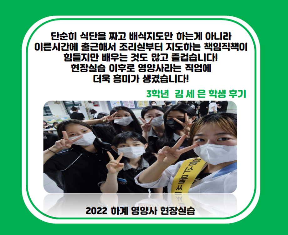 본문 시작 홈으로 커뮤니티 학부소개 진로·취업 교육과정 커뮤니티 대학원 입학상담 홈페이지가이드 갤러리 공지사항 갤러리 학생회 동문회 전공자료실 전공동아리 Youtube Instagram 갤러리 페이스북 트위터 프린트 2022 하계영양사 현장실습(동일여자고등학교) 바이오식품영양학부 1994 2022-07-13 목록 이전2022 하계영양사 현장실습(제천시청) 다음 2022 하계영양사 현장실습(목원푸드 코레일 승무원기숙식당) 담당부서 : 바이오식품영양학부 담당자 : - 연락처 : 043-649-1430 최종수정일 : 2024-10-26 만족도조사 만족도 조사 이 페이지에서 제공하는 정보에 대하여 만족하시나요? 매우만족 만족 보통 불만족 매우불만족