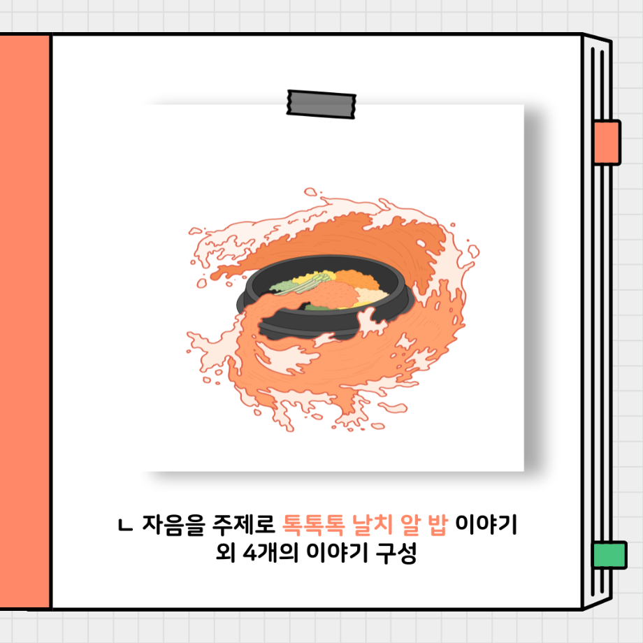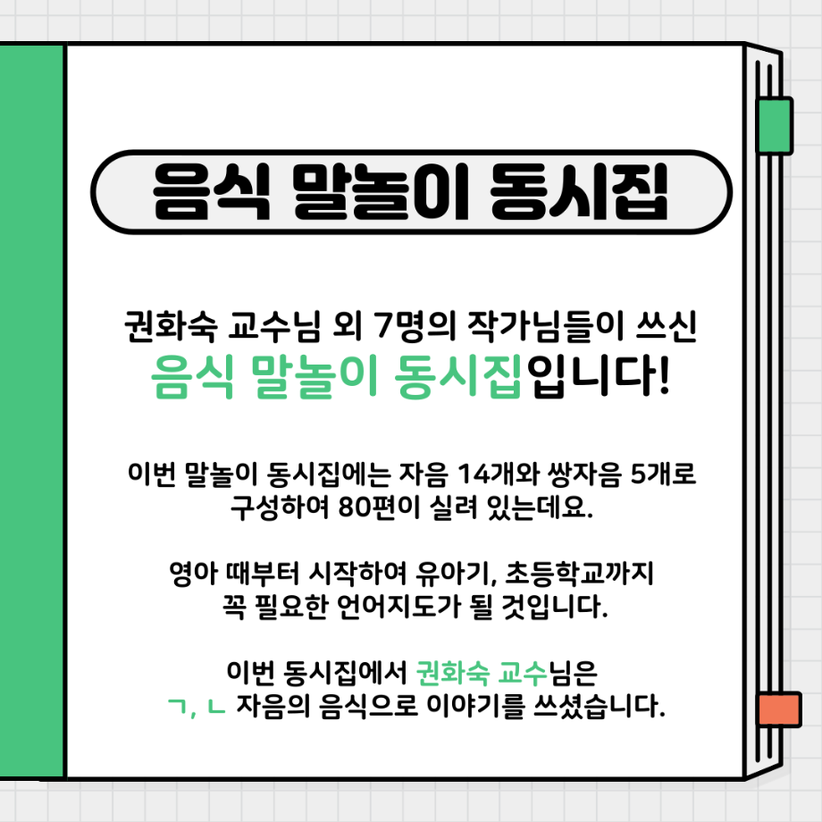 본문 시작 홈으로 MCC News 학과소개 교수소개 학과과정 MCC News MCC SNS 홈페이지가이드 교수 및 졸업생 학과 및 재학생 교수 및 졸업생 미디어 정보통 교수 및 졸업생 페이스북 트위터 프린트 권화숙 교수님의 동시집 '음식 말놀이'를 소개합니다! 디지털콘텐츠창작학과 2639 2024-08-22 이번 동시집은 권화숙 교수님 외 7명의 작가님들이 집필을 하셨습니다. 영아 때부터 시작하여 유아기, 초등학교까지 꼭 필요한 언어지도 책으로서 자음 14개와 쌍자음 5개로 구성하여 80편이 실려 있습니다!이 동시집을 읽다 보면 먹고 싶은 것이 자꾸 생각이 나 점심 메뉴는 어떤 것이 될까 궁금해지네요. 학우 여러분들의 많은 관심과 사랑 부탁드립니다! 목록 이전🎊권화숙 교수님의 제27회 신사임당 이율곡 서예대전 입선🎊 다음 🗣16학번 선배님의 현장 노하우🗣 담당부서 : 미디어콘텐츠창작학과 담당자 : - 연락처 : 043-649-1741 최종수정일 : 2024-10-26 만족도조사 만족도 조사 이 페이지에서 제공하는 정보에 대하여 만족하시나요? 매우만족 만족 보통 불만족 매우불만족