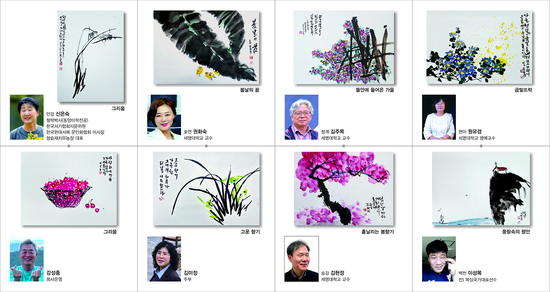 본문 시작 홈으로 MCC News 학과소개 교수소개 학과과정 MCC News MCC SNS 홈페이지가이드 교수 및 졸업생 학과 및 재학생 교수 및 졸업생 미디어 정보통 교수 및 졸업생 페이스북 트위터 프린트 권화숙 교수님 향기로운 삶, 문인화 전시회 안내 미디어콘텐츠창작학과 1128 2025-12-04 향기로운 삶,문인화' 강좌 수강생들의 그동안의 배움과 성과를 공유하는 2025년 제5회 문인화전 – 「여백의 시간을 거닐다 II」 전시회를 개최합니다. 📍 전시 안내 [일시] 개막식: 2025년 12월 4일(목) 16:00 전시기간: 2025년 12월 4일(목) 16:00–18:00 2025년 12월 5일(금)–12월 8일(월) 10:00–17:00 [장소] 제천시민회관 2층 전시실(충북 제천시 의림대로 125) 목록 이전권화숙 교수님, 공연 「허재비고블린의 꿈」 출연 다음 권화숙 교수님 희곡 빨간우체통 공연 안내 담당부서 : 미디어콘텐츠창작학과 담당자 : - 연락처 : 043-649-1741 최종수정일 : 2024-10-26 만족도조사 만족도 조사 이 페이지에서 제공하는 정보에 대하여 만족하시나요? 매우만족 만족 보통 불만족 매우불만족